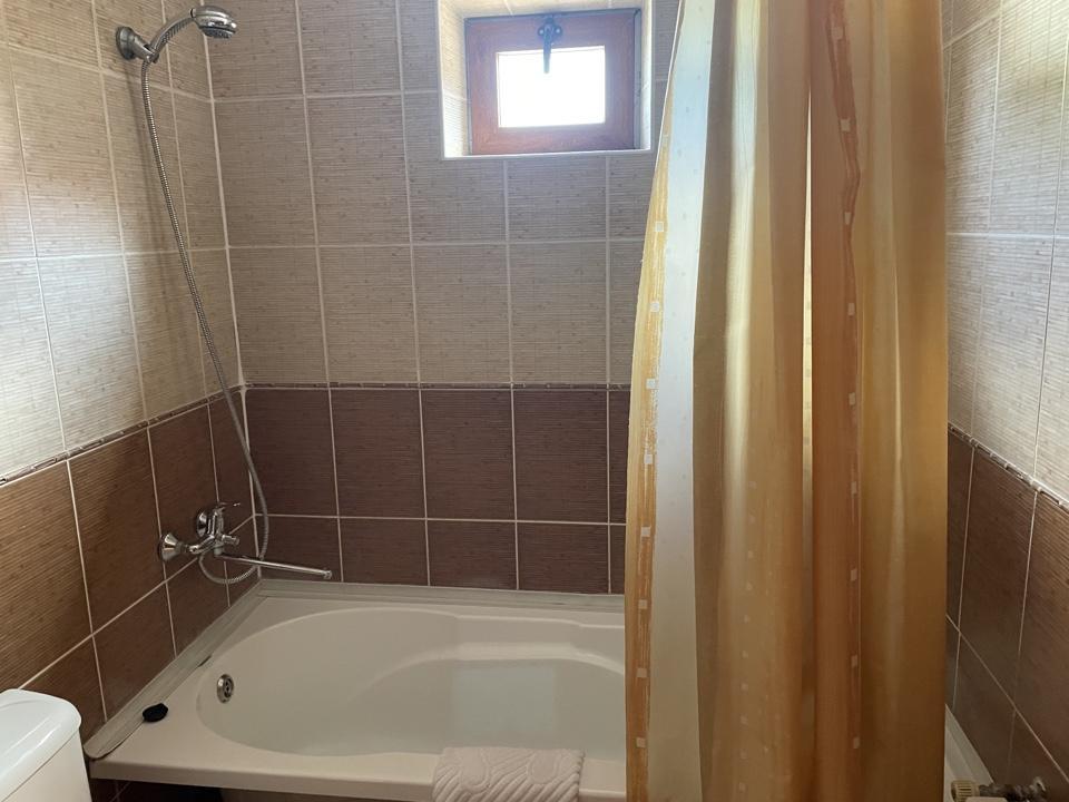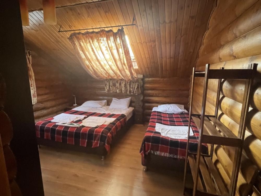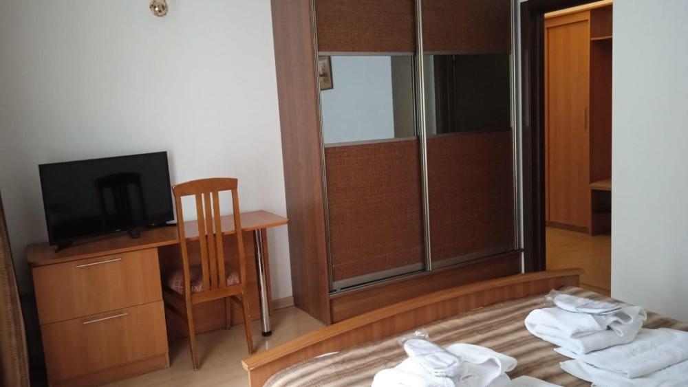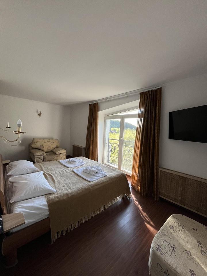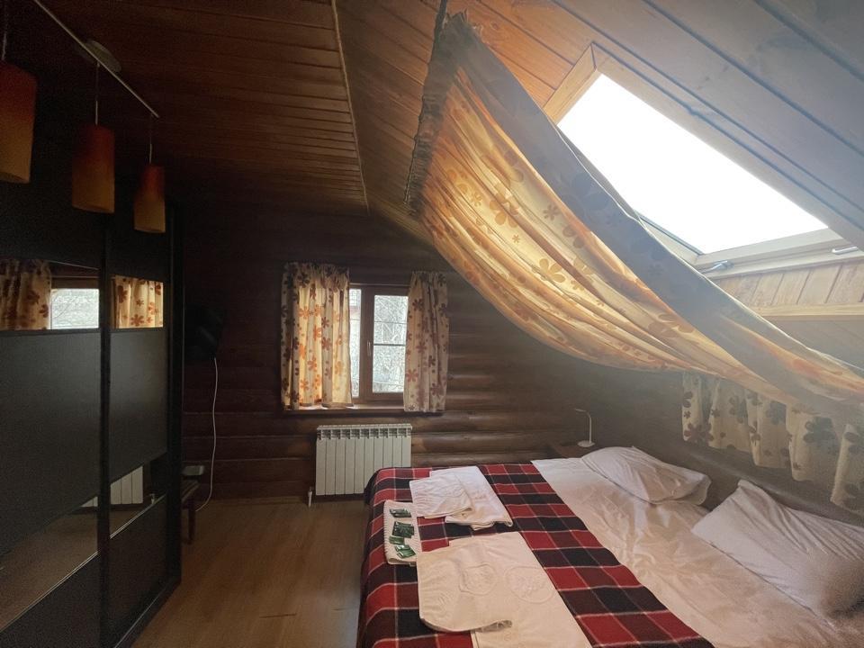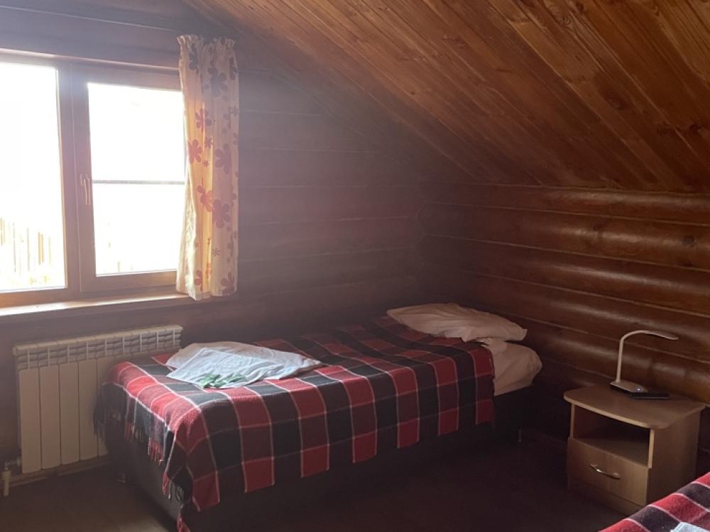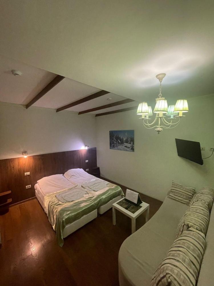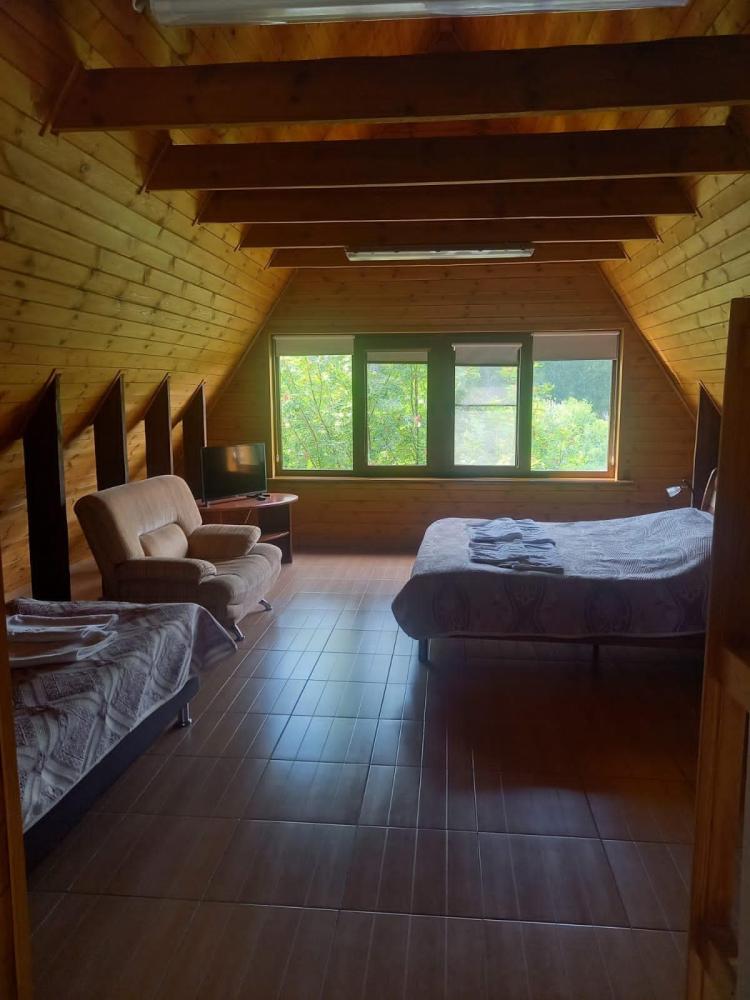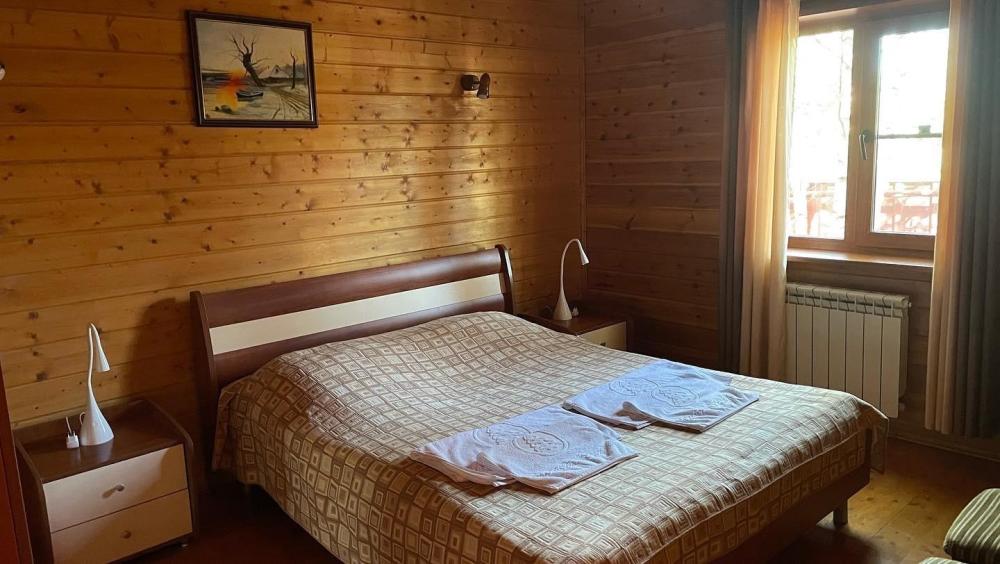1 комната, две полуторки + диван, ТВ, сан. узел с ванной. Кондиционер отсутствует.Либо кровать , диван и полуторка, номер шале. Красивый вид из окна на лес и горы. Собственный вход.