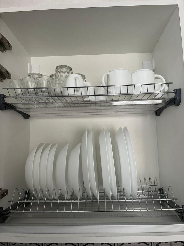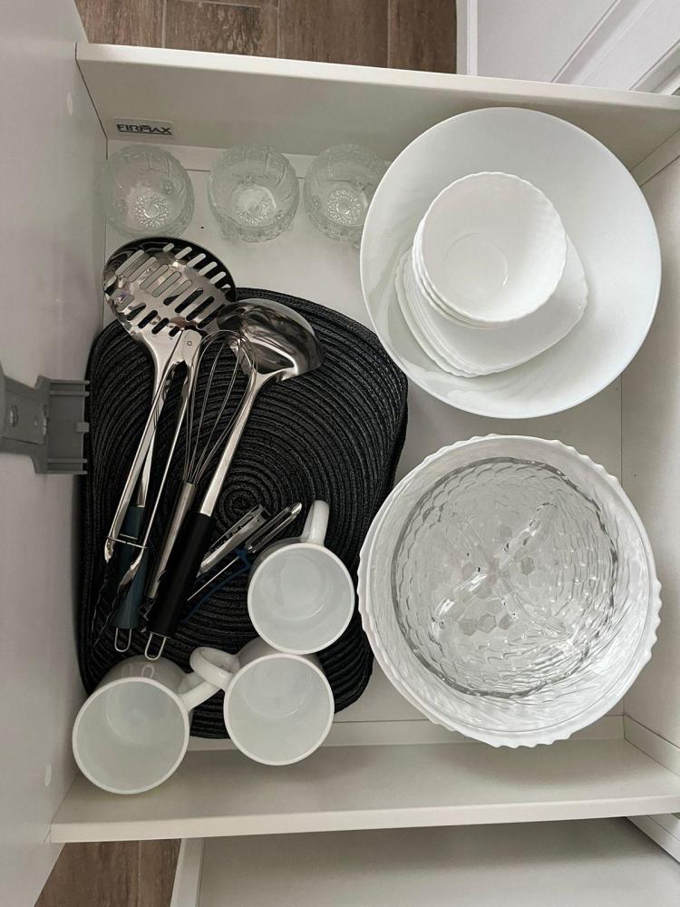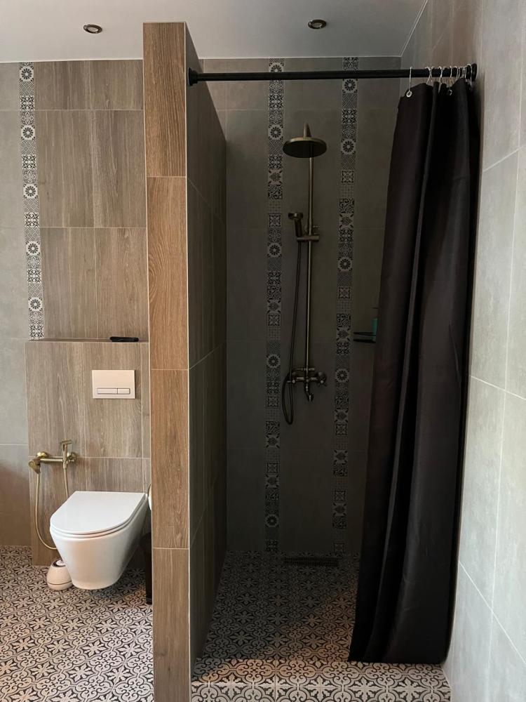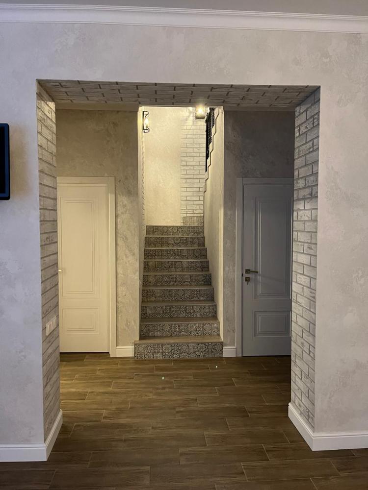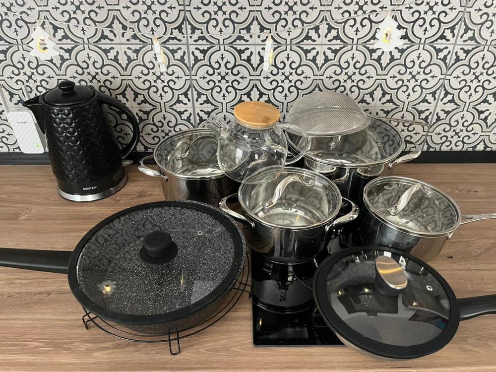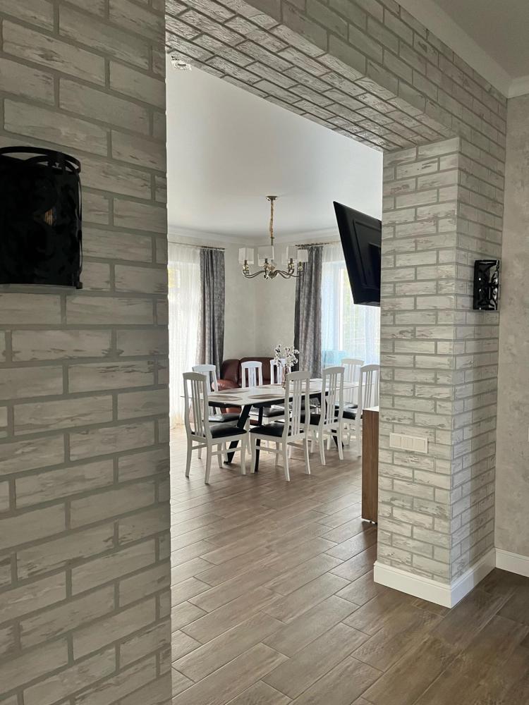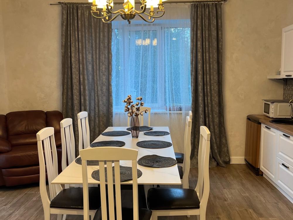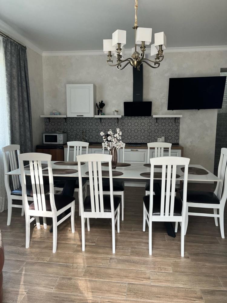 На каждом этаже расположены: удобный холл, просторная гостиная с обеденной зоной, местом для отдыха и общения, кухонным гарнитуром полностью оснащённым для приготовления пищи. Гостиная имеет выход на террасу площадью 12м2. Гостиная и кухонная зона подготовлены для вашего комфортного отдыха: индукционная плита, холодильник, микроволновая печь, чайник, стиральная машина, сушилка, набор кастрюль, посуда, столовые приборы, принадлежности для барбекю.