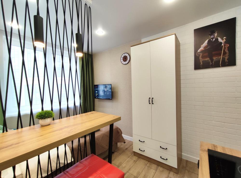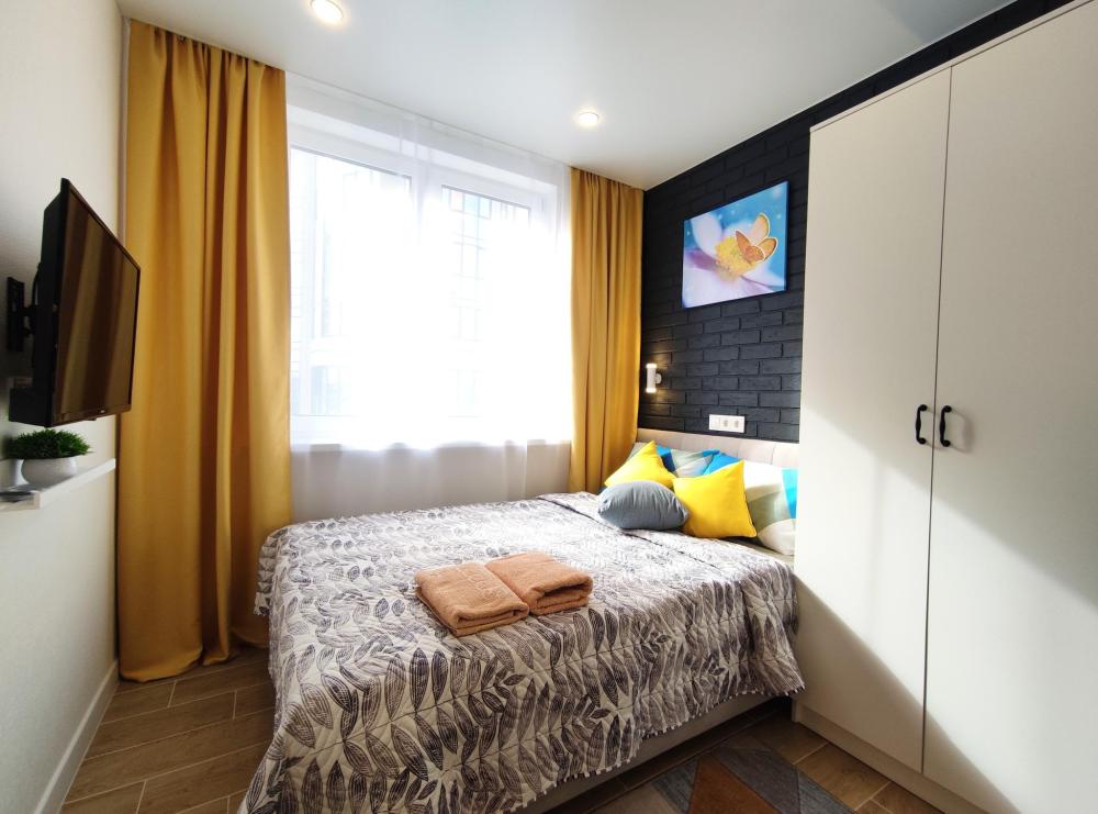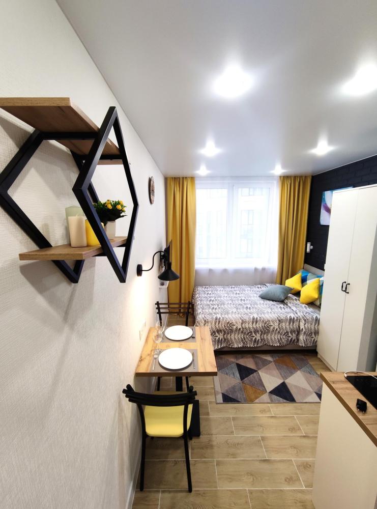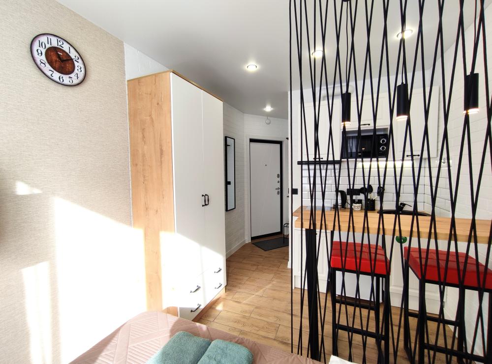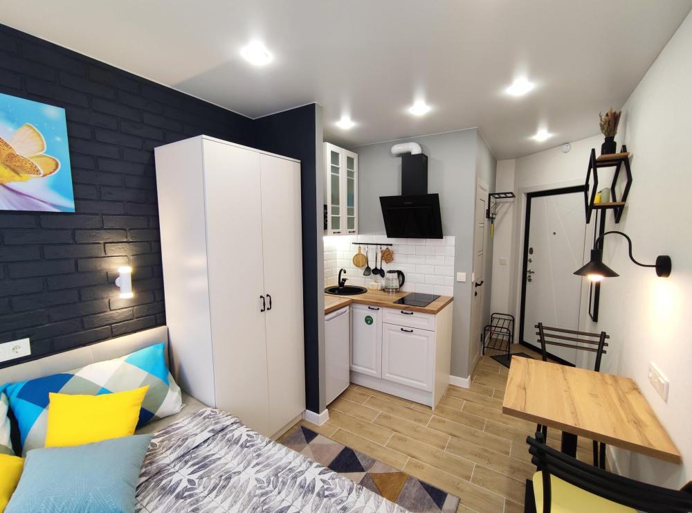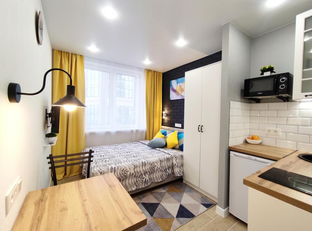 Уютные апартаменты студия, оборудованные всем необходимым для комфортного проживания. В апартаментах: двуспальная кровать, барная стойка и барные стулья, Wi-Fi телевизор со Smart-TV, холодильник, встроенная варочная панель, микроволновая печь, чай, кофе, необходимый набор кухонных принадлежностей, стиральная машина и сушилка для вещей утюг и гладильная доска.