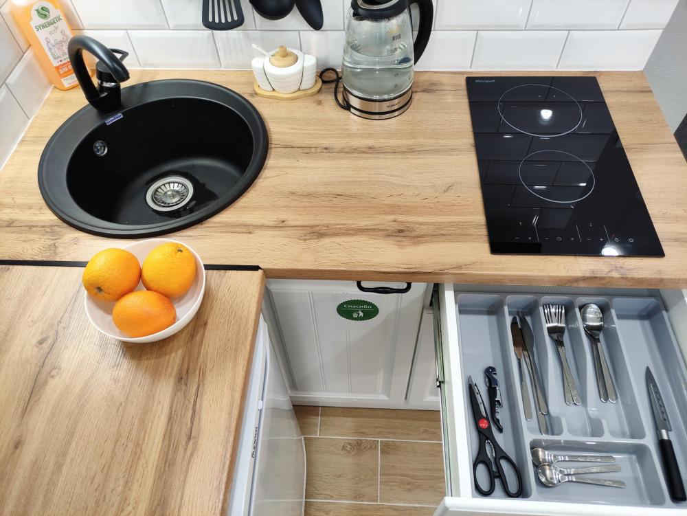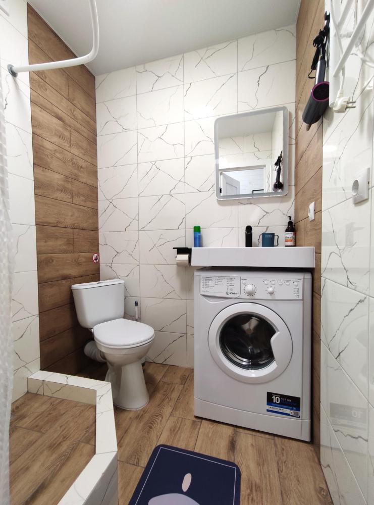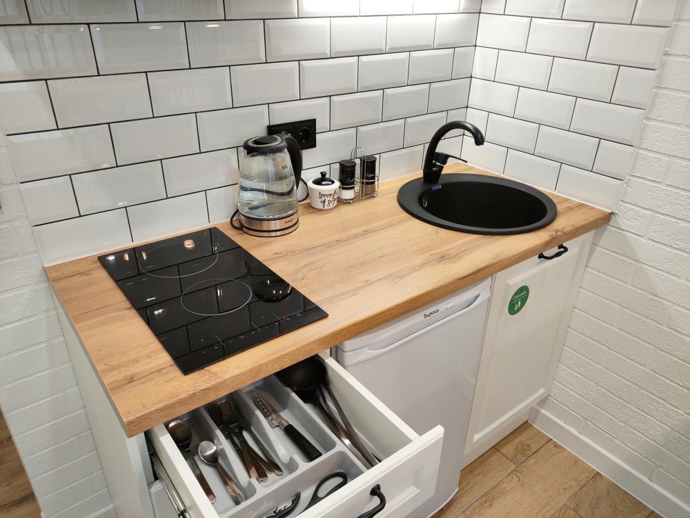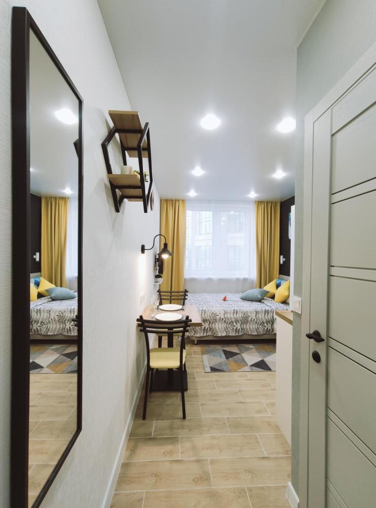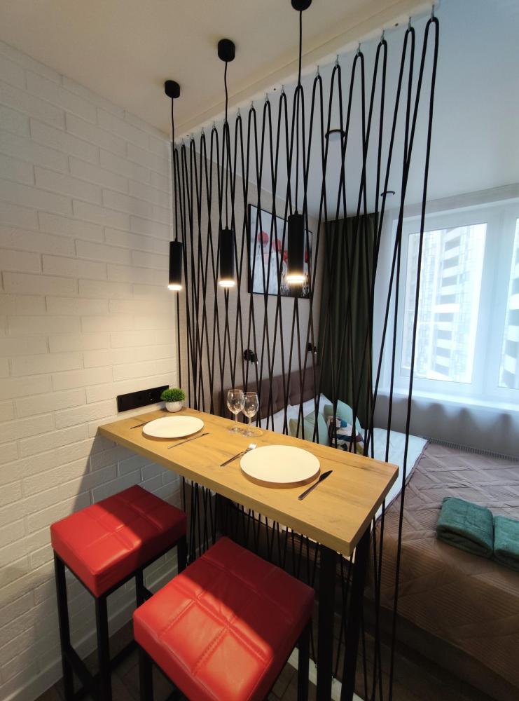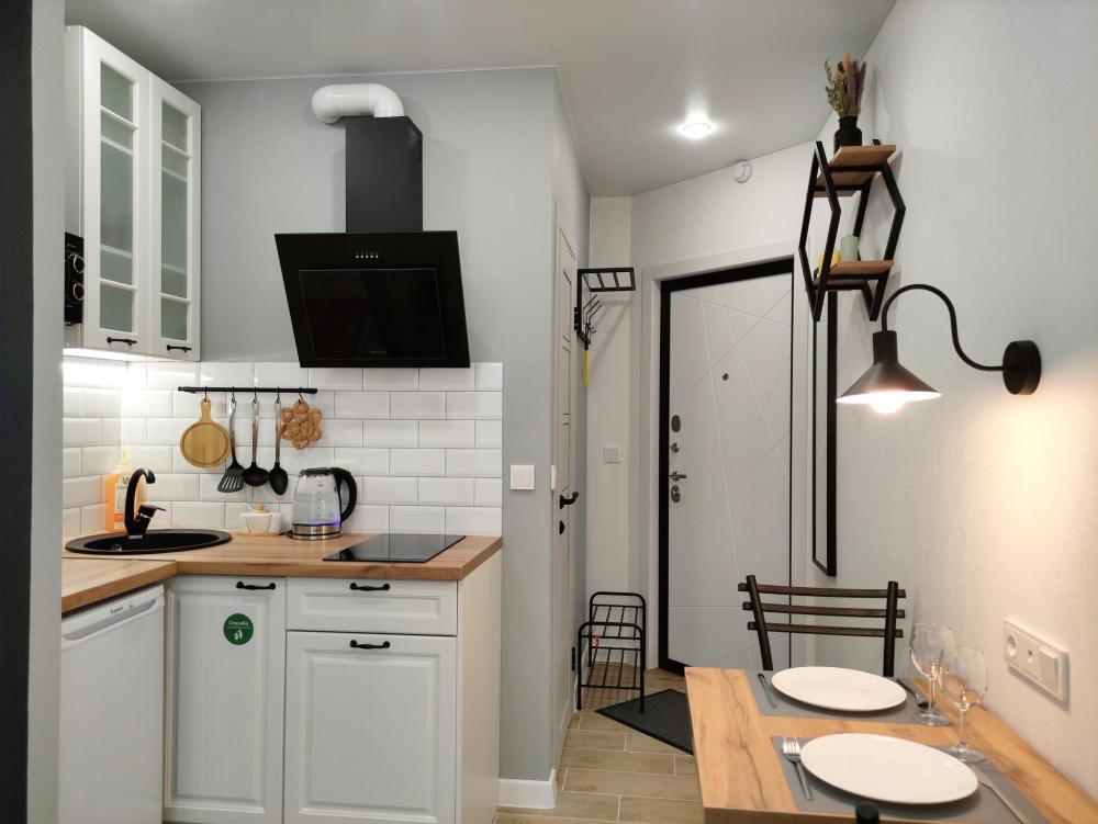Уютные апартаменты студия, оборудованные всем необходимым для комфортного проживания. В апартаментах: двуспальная кровать, барная стойка и барные стулья, Wi-Fi телевизор со Smart-TV, холодильник, встроенная варочная панель, микроволновая печь, чай, кофе, необходимый набор кухонных принадлежностей, стиральная машина и сушилка для вещей утюг и гладильная доска.