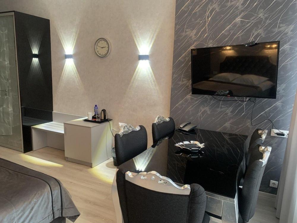 Атмосфера роскоши, просторный интерьер с отдельной спальней и гостинной, эксклюзивная отделка и шикарная мебель - эти номера для самых требовательных гостей и особых случаев. В номере:кондиционер,кабельное ТВ,Интернет через WI-FI,холодильник с мини-баром,сейф,фен и индивидуальный гостевой набор. №8, №9