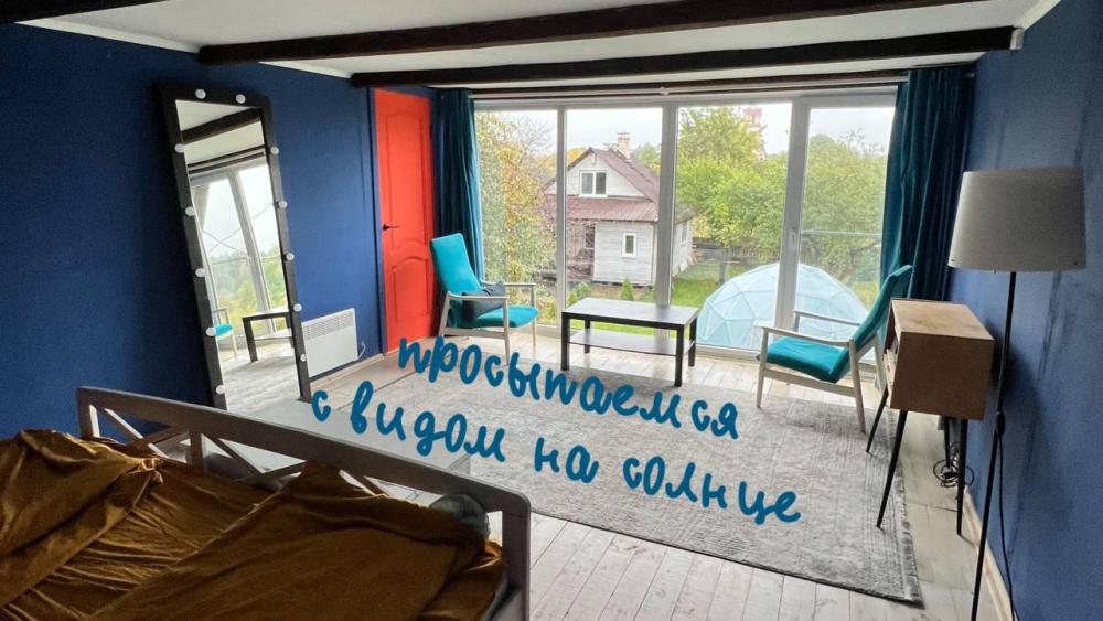 Первый этаж: кухня с окном и видом на озеро, санузел с горячей водой, кабинет номер 1 с кикером, настольным хоккеем и настольными играми (в обычное время используется как музыкальная студия) большая уютная гостиная с камином, прихожая. Второй этаж: Спальня с панорамными окнами с видом на церковь 16 века, гардеробная, отдельный кабинет