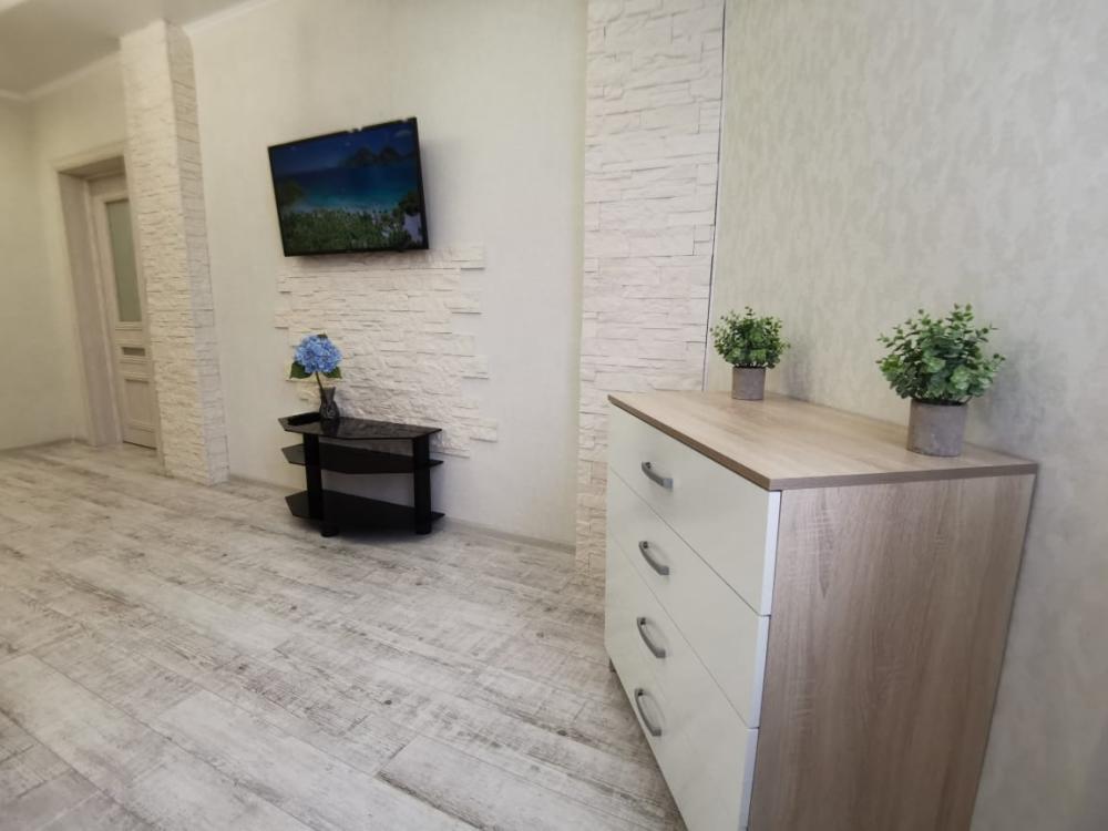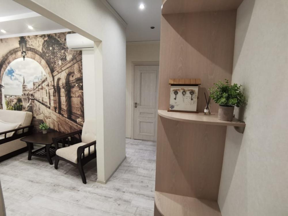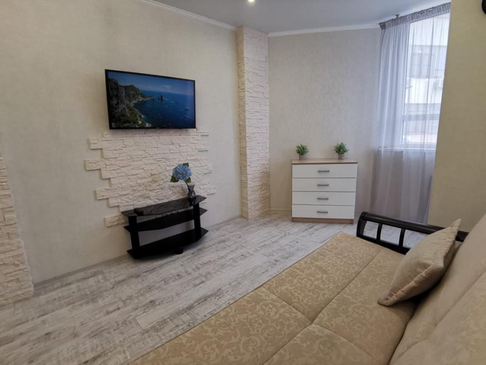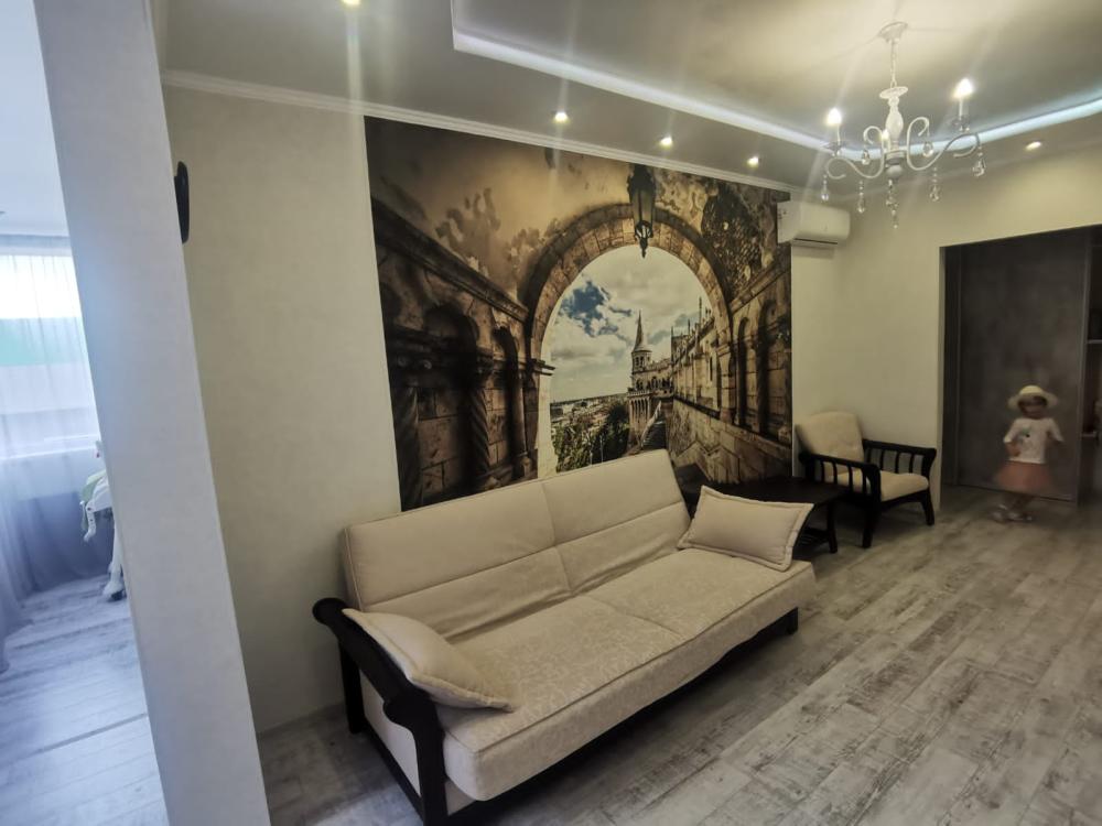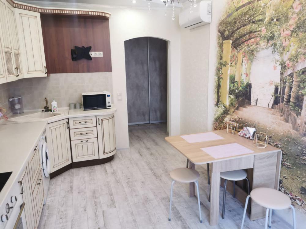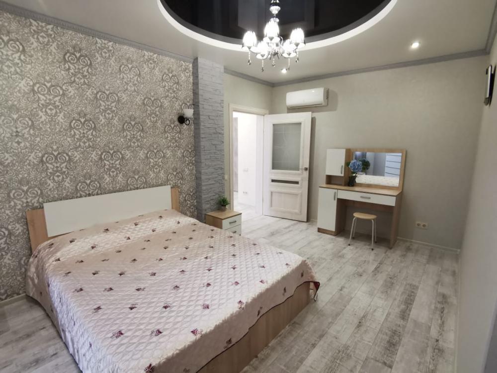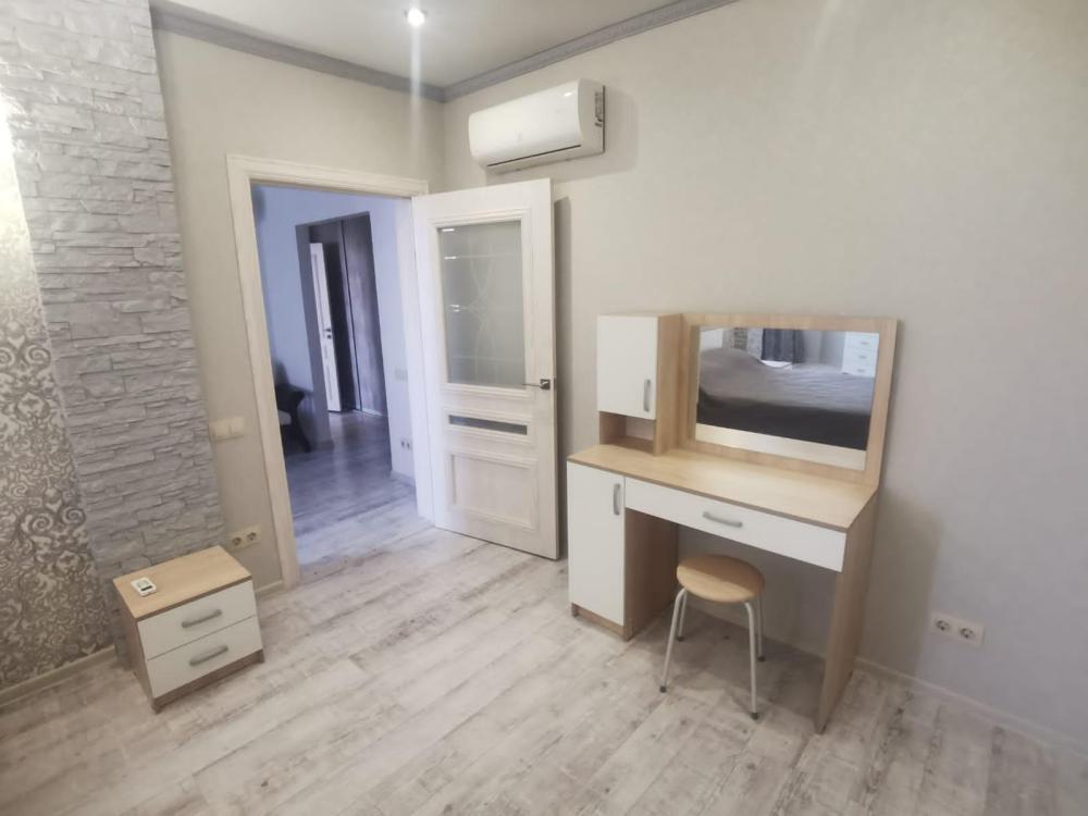 Двухкомнатная квартира в Южном районе г. Новороссийске. Квартира просторная, имеет 2 комнаты, одна из них проходная, в ней диван раскладной 140*200, комод, телевизор со смарт тв и есть приложение в котором около 3000 каналов (спортивные, детские итд), столик журнальный, кресло. Вторая комната очень просторная с большой гардеробной (там можно отлично развесить вещи, поставить чемоданы, сумки и использовать её как гладильную), в гардеробной есть гладильная доска, утюг, сушилка для белья. В комнате двухспальная кровать 160*200, комод, макияжный столик с табуретом, 2 тумбочки , сплит. В кухне: кухонный гарнитур, холодильник с морозильной камерой, стиральная машина, микроволновая печь, варочная панель духовой шкаф, электрический чайник, сплит, стол - книжка, табуреты, набор посуды, также для гостей с маленькими детьми имеется детский стульчик для кормления. В прихожей большой шкаф-купе. Санузел совмещённый, холодная и горячая вода круглосуточно, стоит водонагреватель, фен. Wi-Fi.
