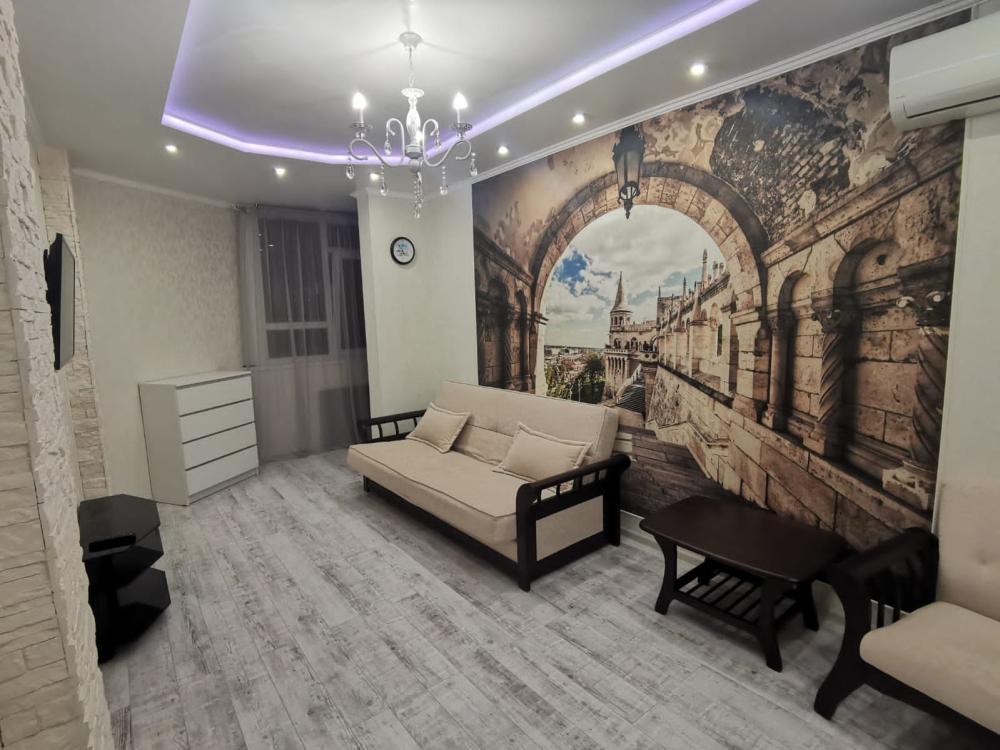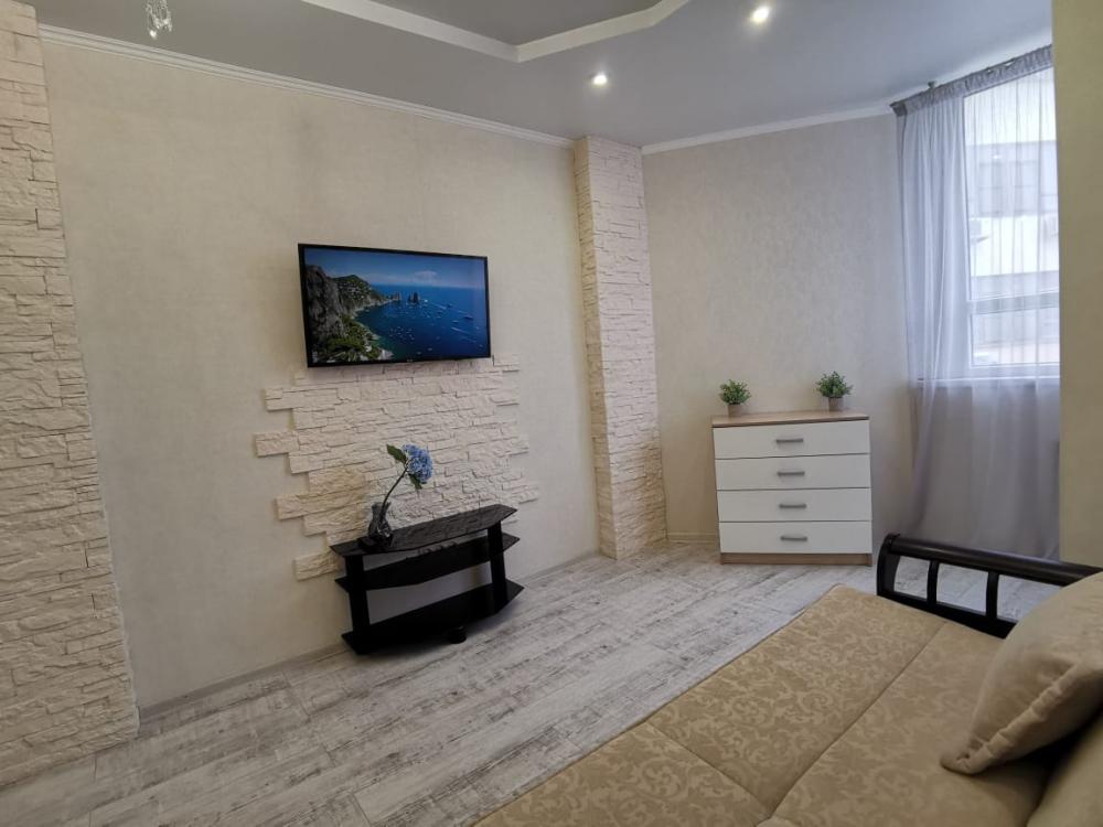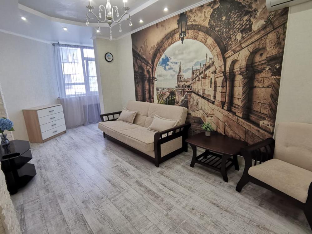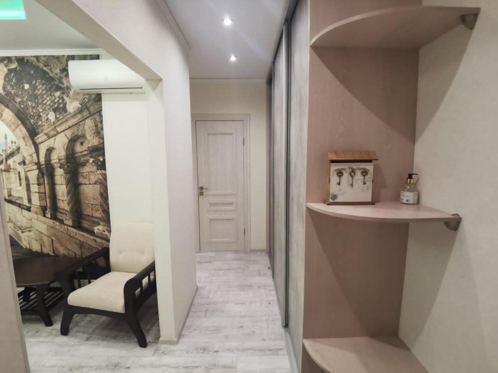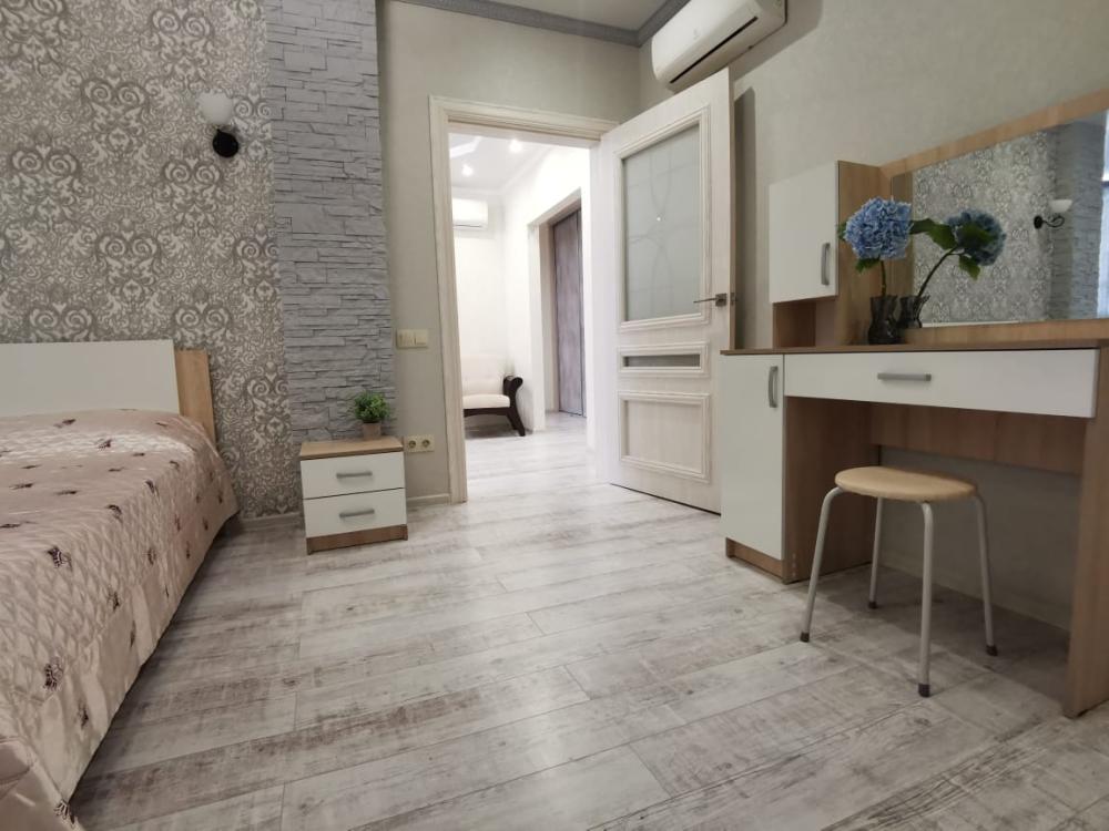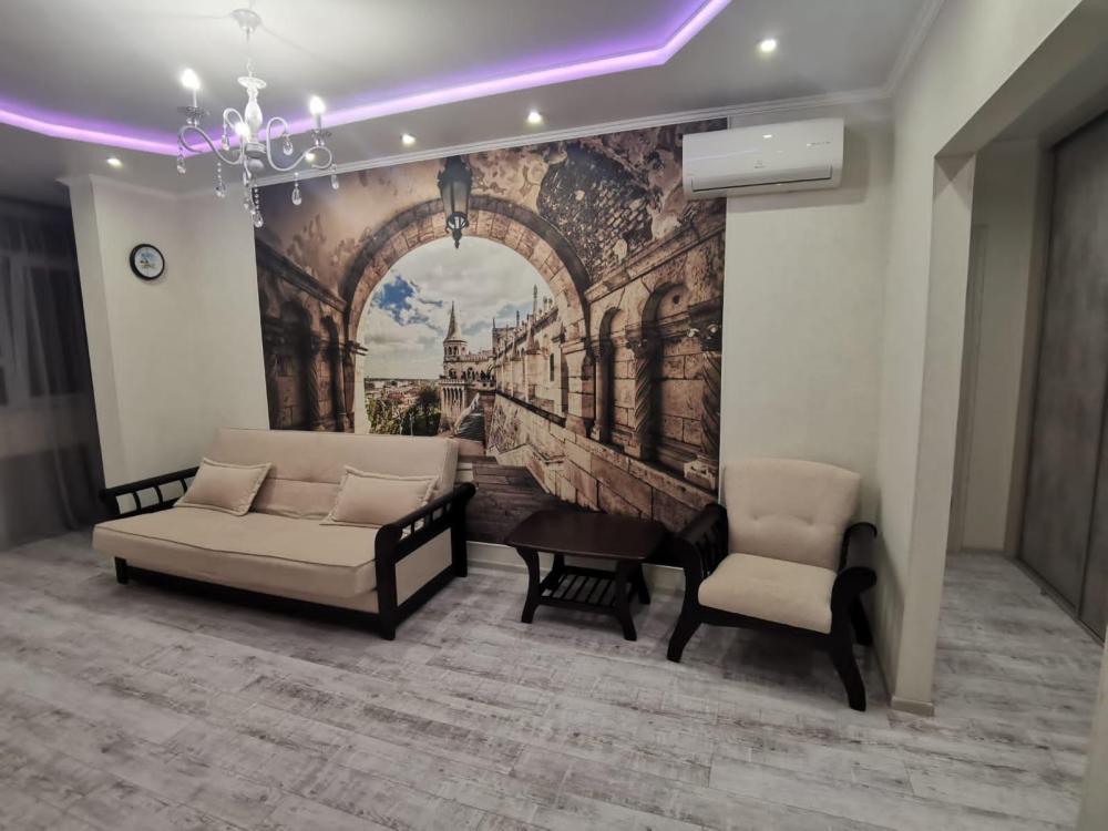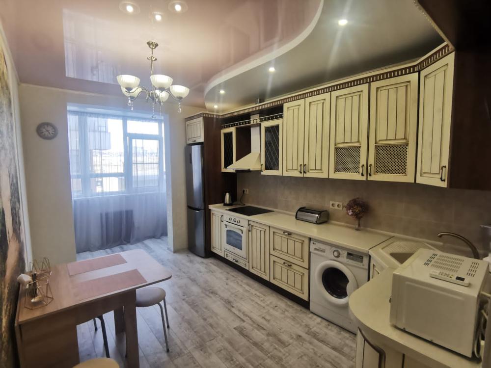 Двухкомнатная квартира в Южном районе г. Новороссийске. Квартира просторная, имеет 2 комнаты, одна из них проходная, в ней диван раскладной 140*200, комод, телевизор со смарт тв и есть приложение в котором около 3000 каналов (спортивные, детские итд), столик журнальный, кресло. Вторая комната очень просторная с большой гардеробной (там можно отлично развесить вещи, поставить чемоданы, сумки и использовать её как гладильную), в гардеробной есть гладильная доска, утюг, сушилка для белья. В комнате двухспальная кровать 160*200, комод, макияжный столик с табуретом, 2 тумбочки , сплит. В кухне: кухонный гарнитур, холодильник с морозильной камерой, стиральная машина, микроволновая печь, варочная панель духовой шкаф, электрический чайник, сплит, стол - книжка, табуреты, набор посуды, также для гостей с маленькими детьми имеется детский стульчик для кормления. В прихожей большой шкаф-купе. Санузел совмещённый, холодная и горячая вода круглосуточно, стоит водонагреватель, фен. Wi-Fi.