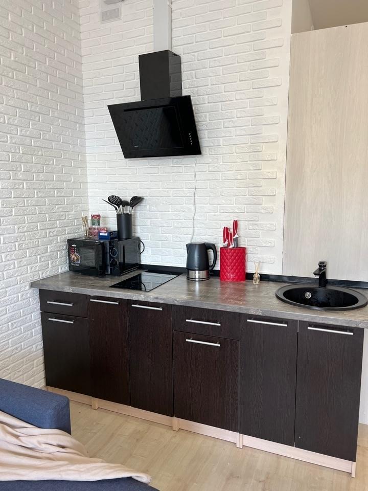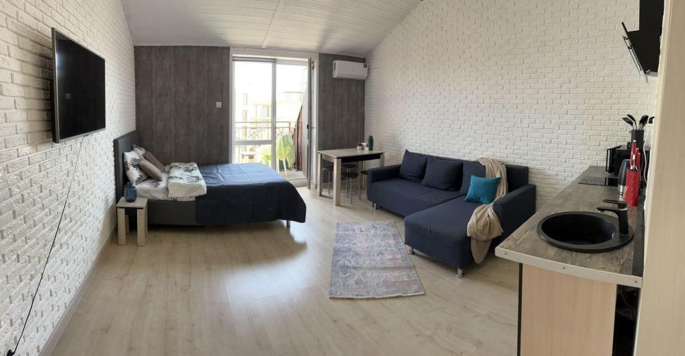 Апартаменты-студия на улице Рыбацкая. Для удобства гостей в апартаментах: двухместный диван и двухместная кровать, постельное белье, банные полотенца, высокоскоростной интернет Wi-Fi, кондиционер, утюг, гладильная доска, набор посуды и столовых приборов, микроволновка, электрочайник, стиральная машинка, туалетно-косметические принадлежности.