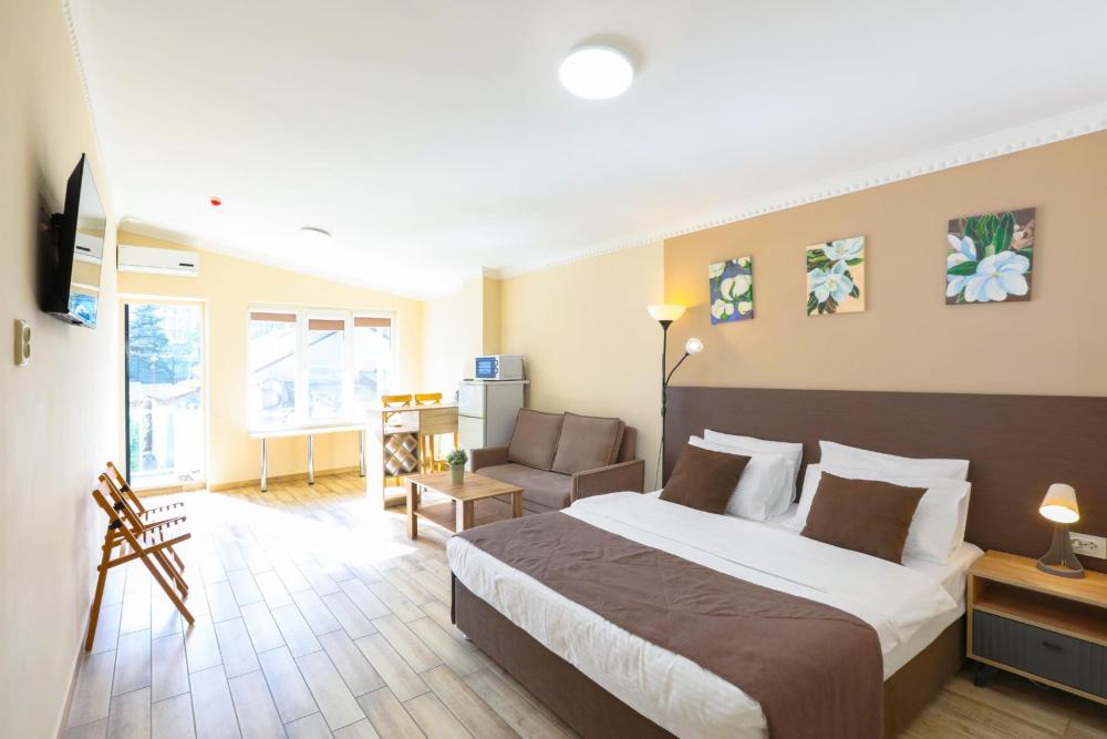 Комната делюкс с двуспальной кроватью и дополнительной кроватью. Услуги: Предоставление гладильных принадлежностей, Услуги стирки и глаженья, Дополнительное место, Гигиенические принадлежности, Кондиционер, Ванная, Холодильник, Душевая, Телевизор, Wi-Fi в номере.