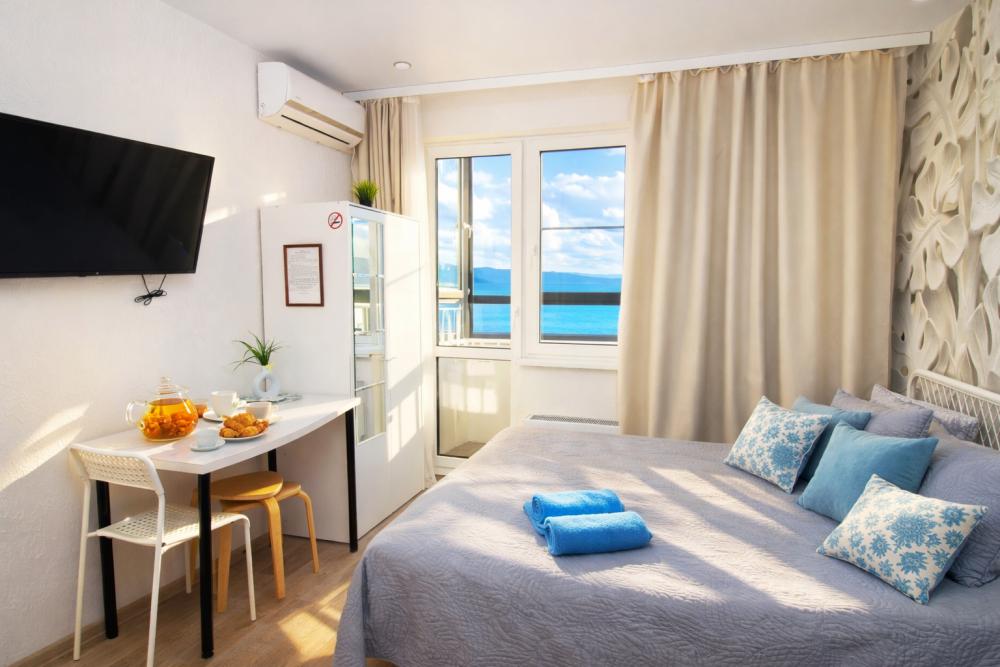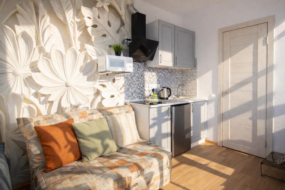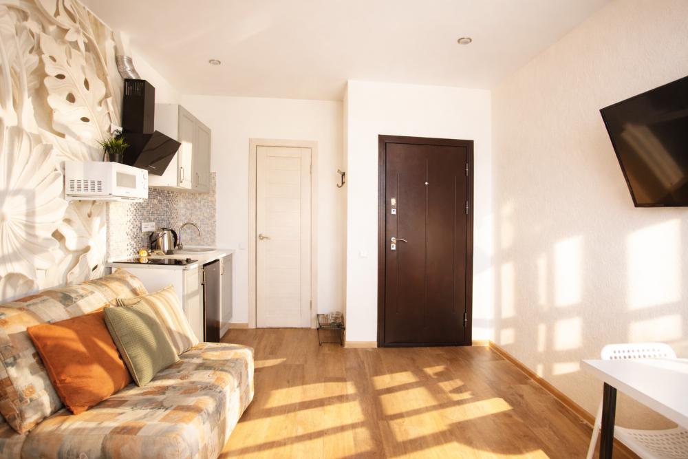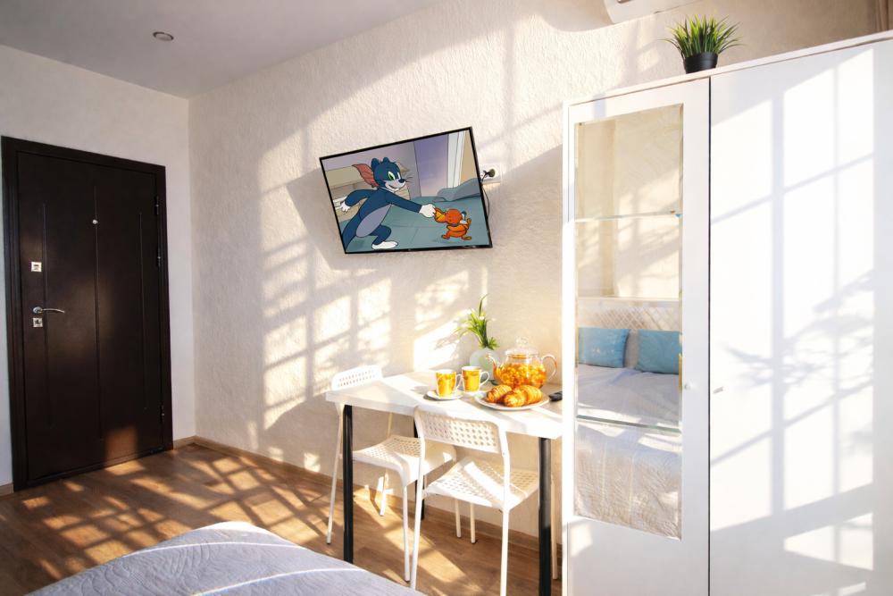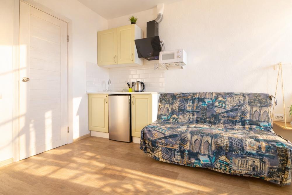 В квартире-студии 3 спальных места: двуспальная кровать и раскладной диван. Для удобства гостей имеются: стиральная машина, холодильник, кухонная плита, СВЧ-печь, утюг с гладильной доской, кондиционер, душ. Предоставляется чистое постельное белье, банные полотенца. К услугам гостей: бесплатная парковка во дворе дома, wi-fi, телевизор, кухня для самостоятельного приготовления пищи. Рядом удобная транспортная развязка, остановка общественного транспорта, спортивный комплекс, южный рынок, магазин Магнит, Пионерская роща.