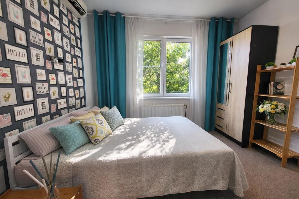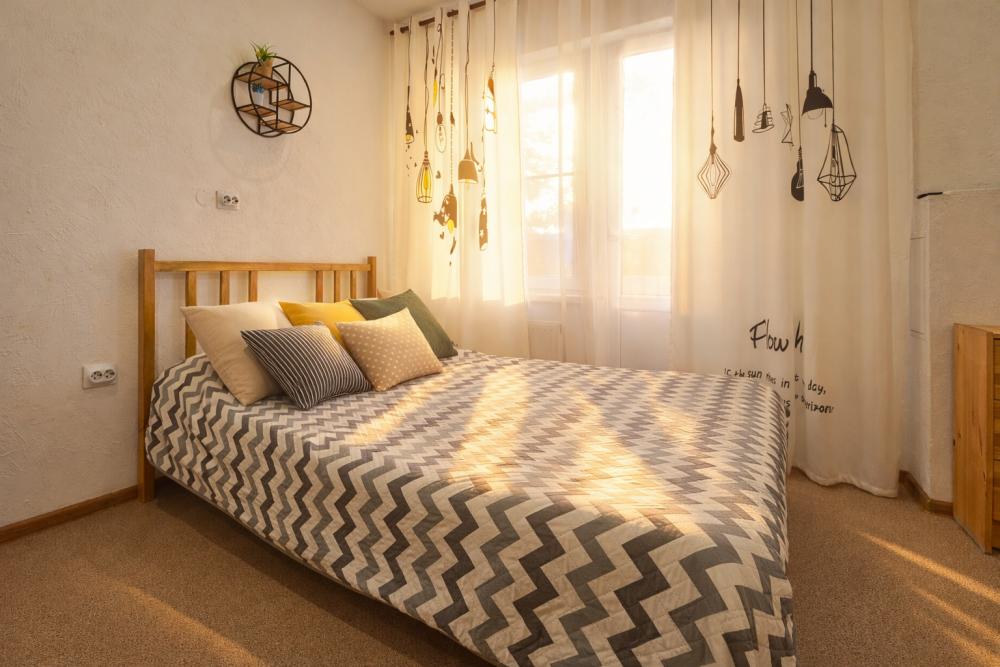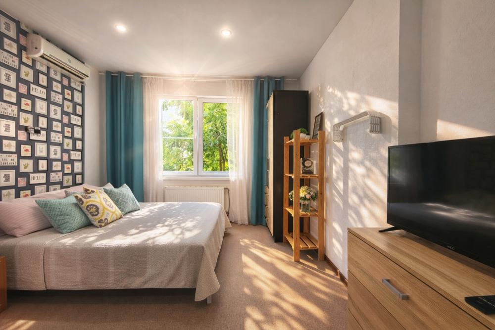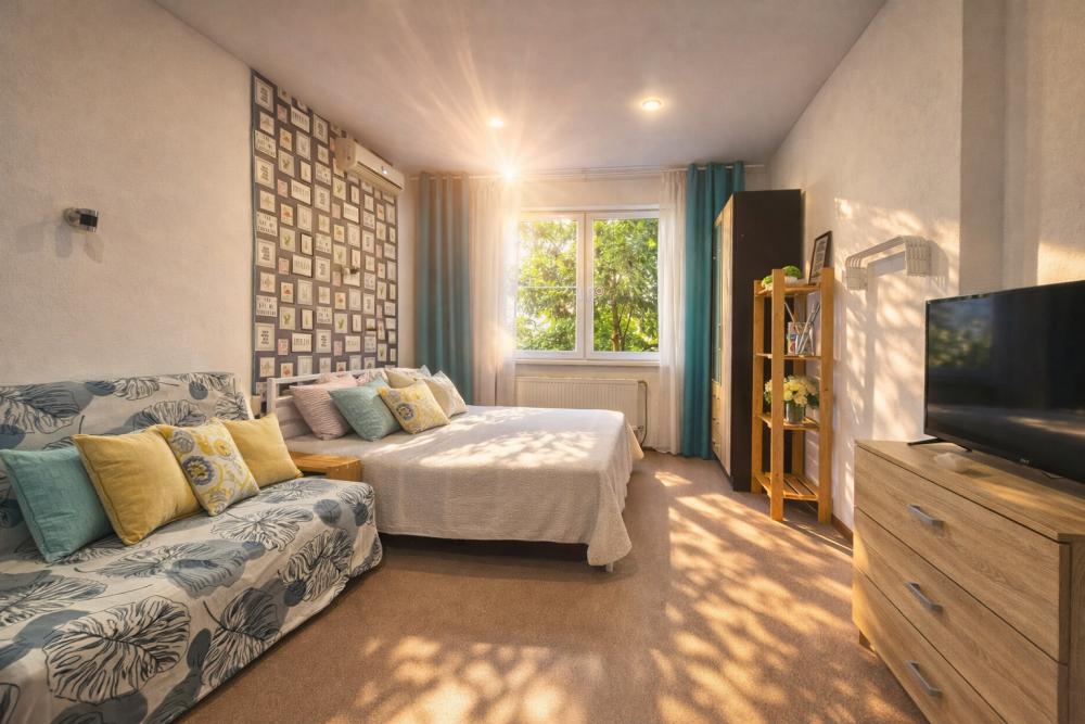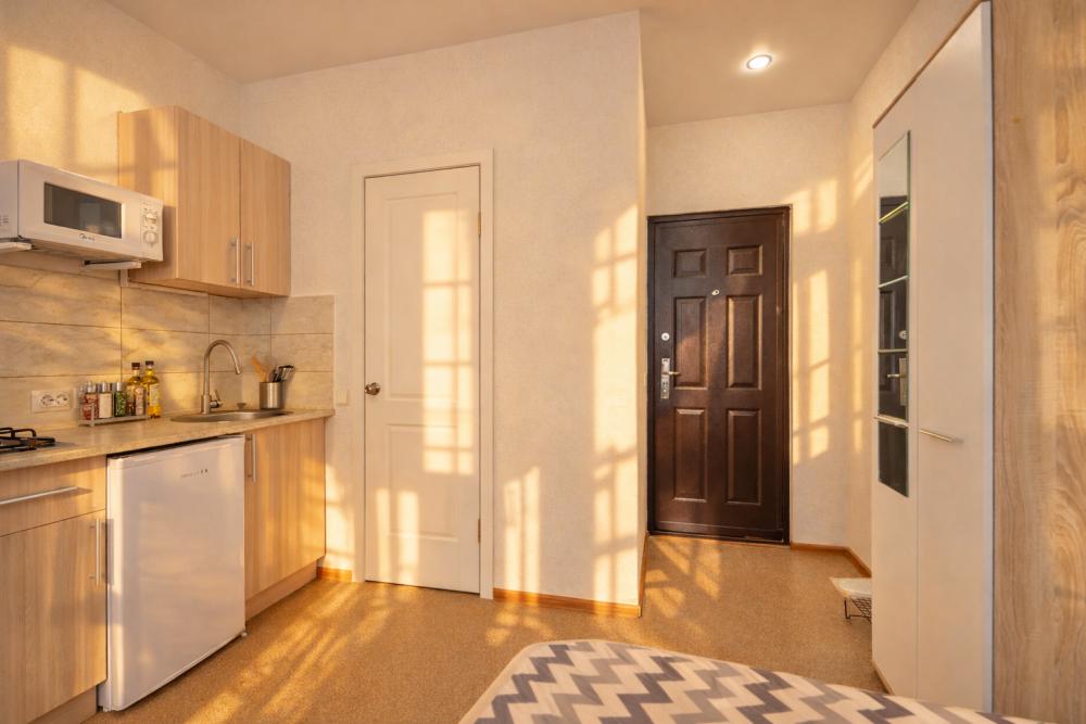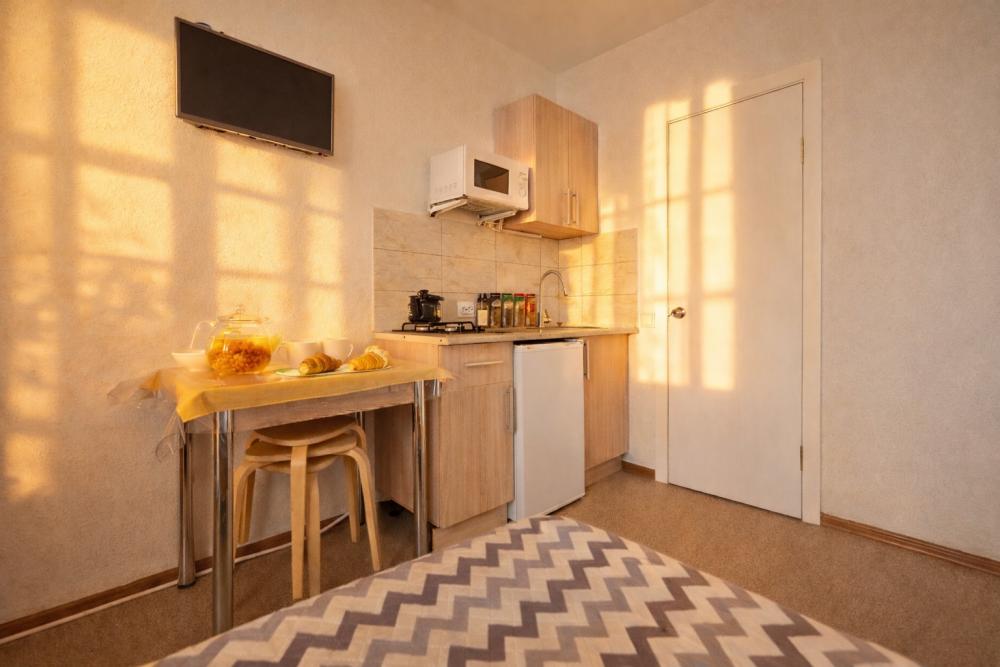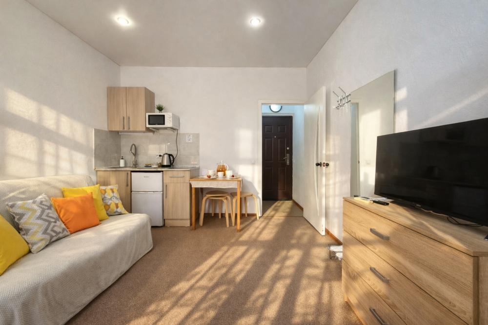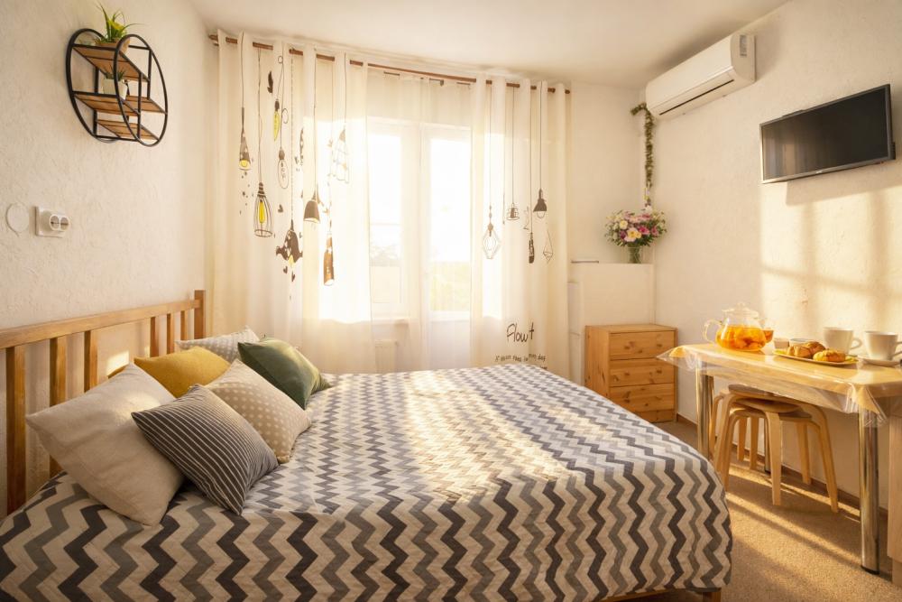 В апартаментах для удобства гостей есть: стиральная машина, интернет Wi-Fi, телевизор, кондиционер, холодильник, кухонная плита, СВЧ-печь, утюг с гладильной доской, ванные принадлежности, душ, набор посуды и столовых приборов по количеству персон. В студии возможно размещение до 4 гостей, спальные места: двуспальная кровать и двуспальный диван. Апартаменты расположены на 1 этаже.