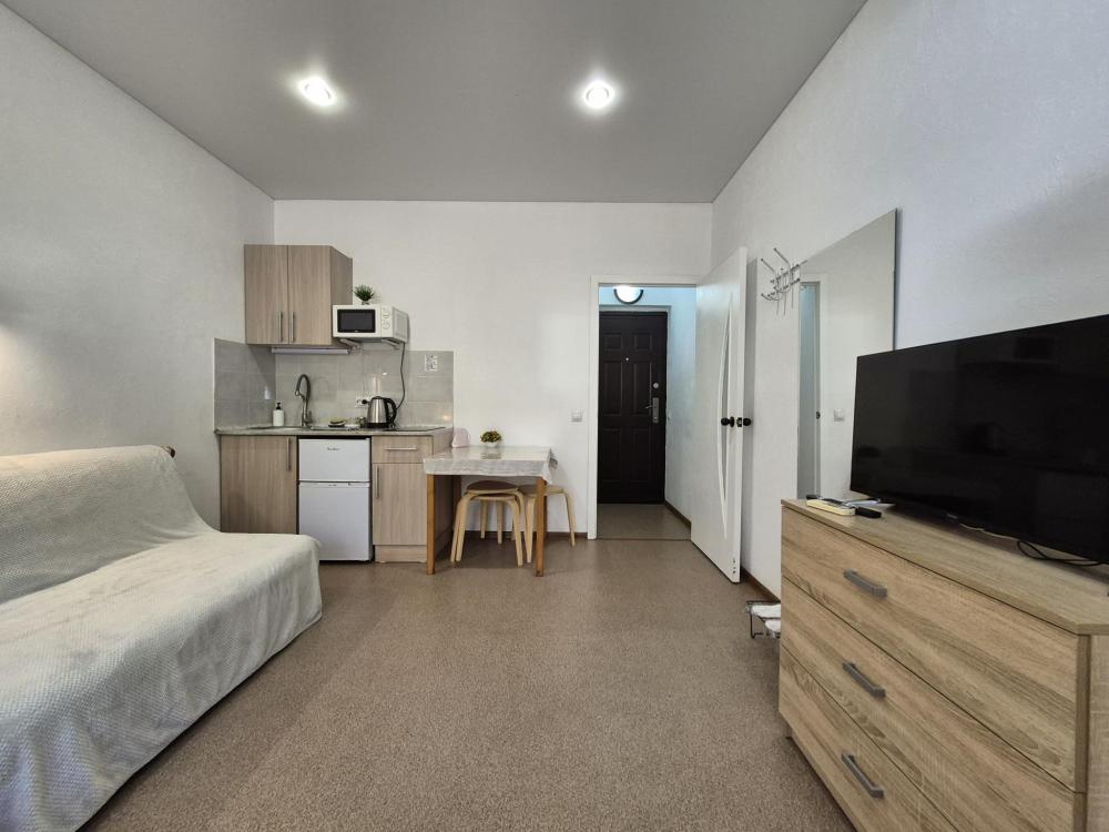 В апартаментах для удобства гостей есть: стиральная машина, интернет Wi-Fi, телевизор, кондиционер, холодильник, кухонная плита, СВЧ-печь, утюг с гладильной доской, ванные принадлежности, ванна, набор посуды и столовых приборов по количеству персон. В студии возможно размещение до 4 гостей, спальные места: двуспальная кровать и двуспальный диван. Апартаменты расположены на 1 этаже.