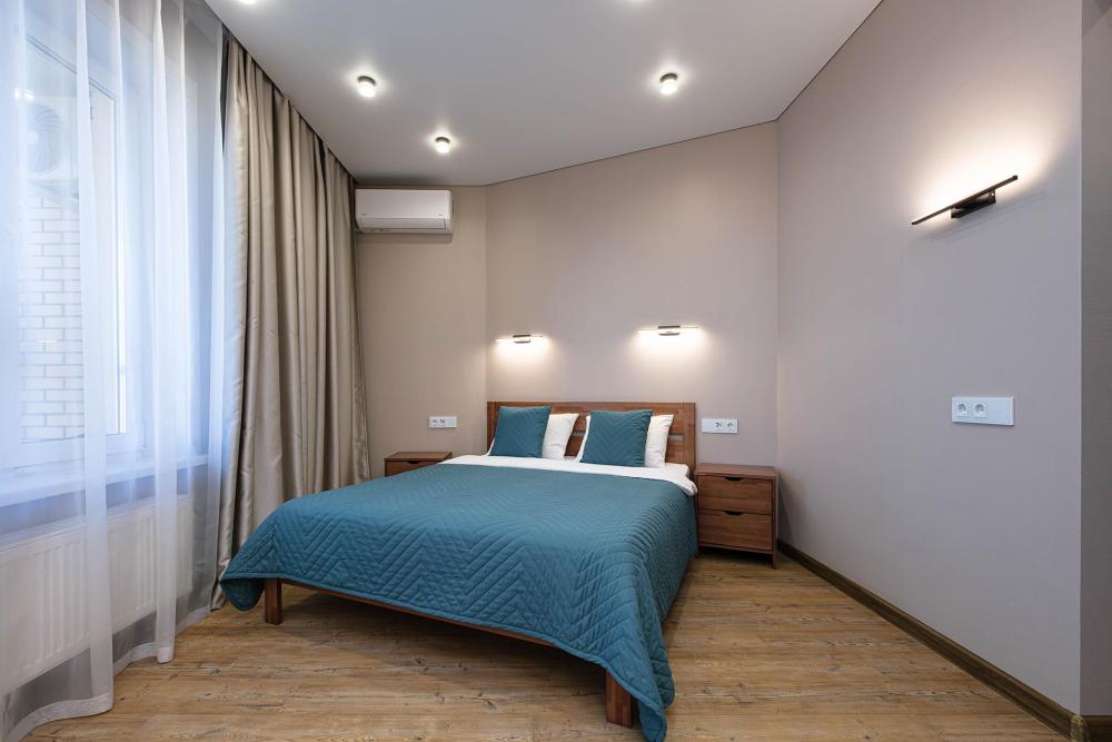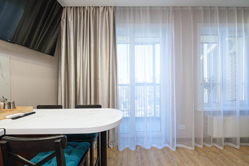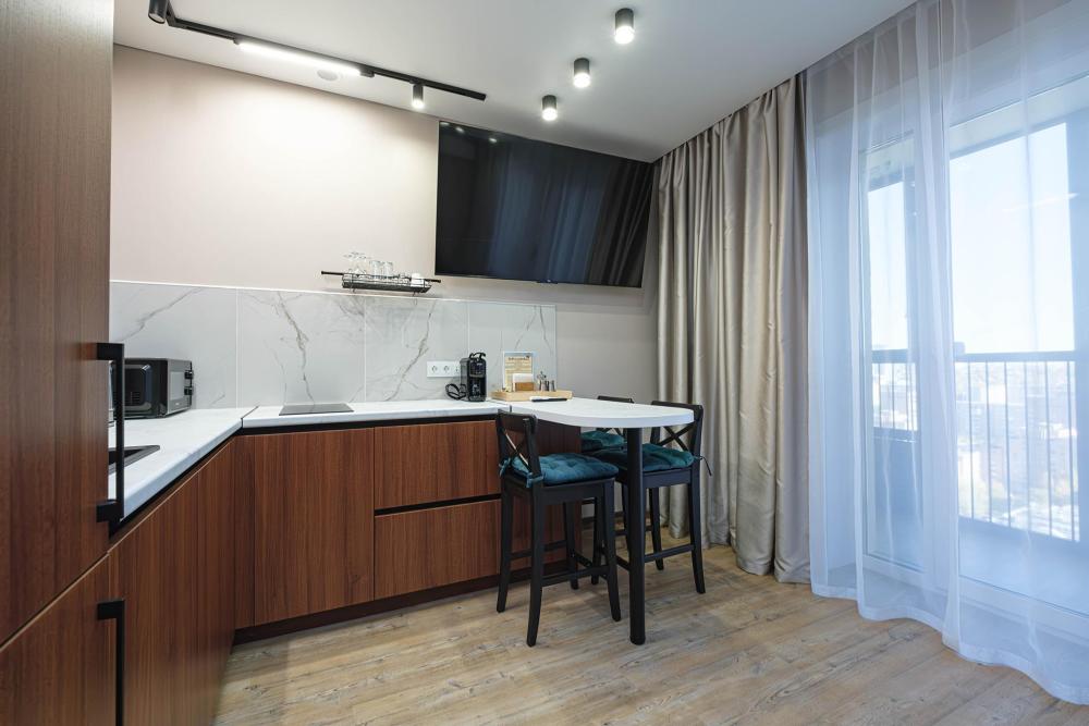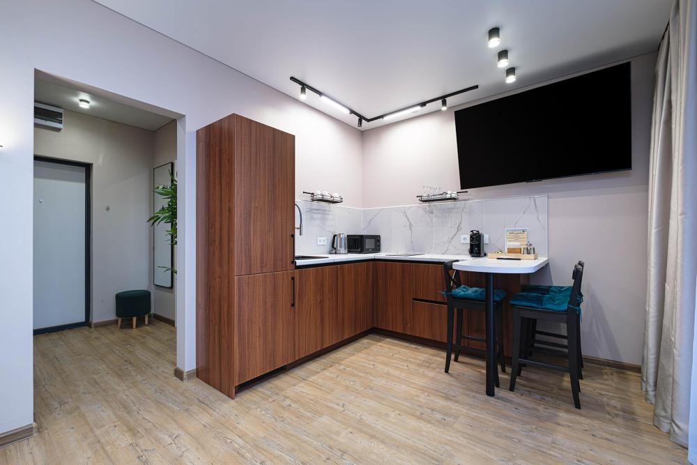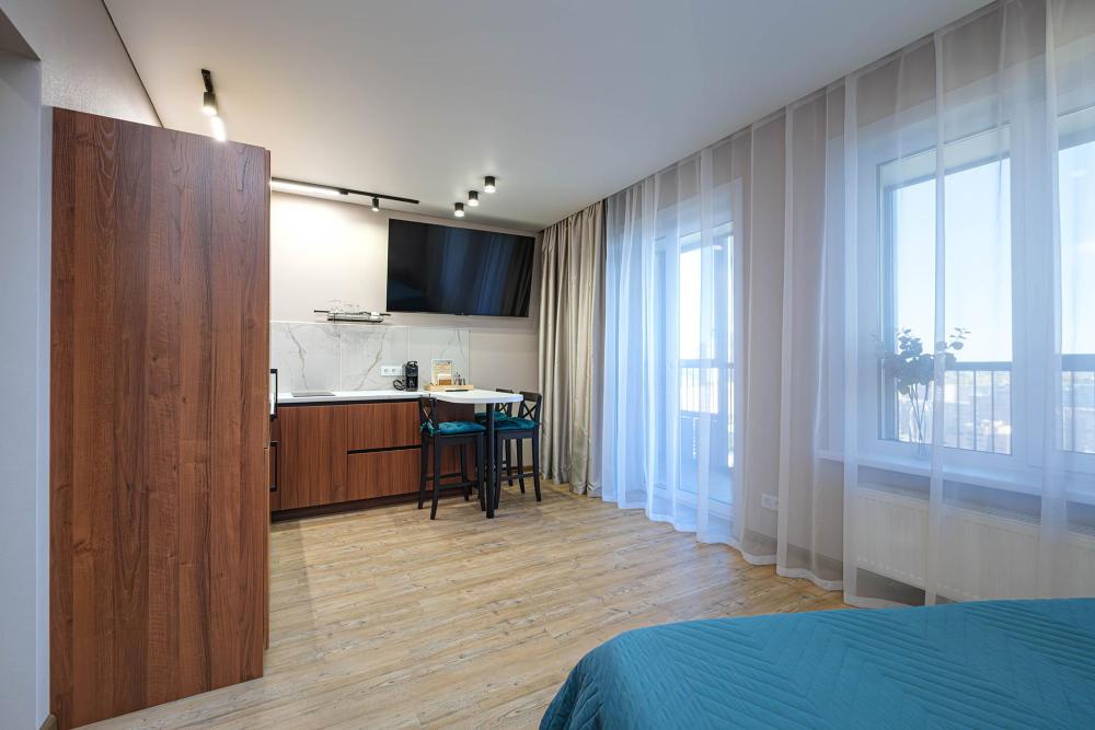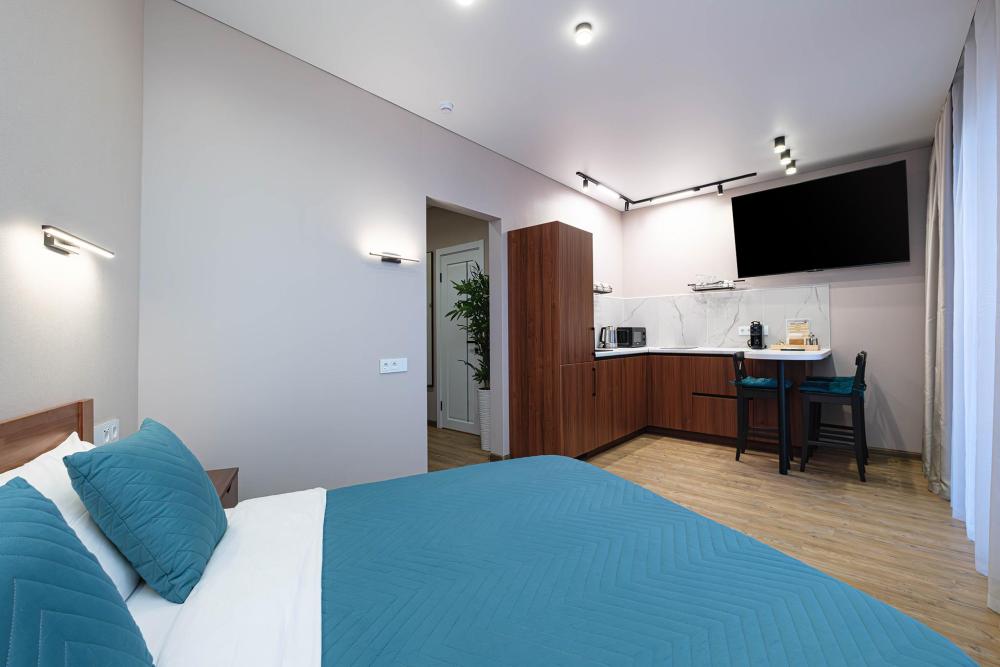 В апартаментах: большая двуспальная кровать с ортопедическим матрасом; доп. спальное место (раскладушка), кабельное телевидение, высокоскоростной интернет, Wi-Fi. Отдельная кухонная зона с плитой, чайником, фильтром для воды, холодильником, микроволновой печью, посудой, кофемашиной и другими приятными мелочами; стиральная машина, сушилка для белья. Так же предоставляется: чистое и выглаженное постельное бельё, полотенца, фен, утюг с гладильной доской.