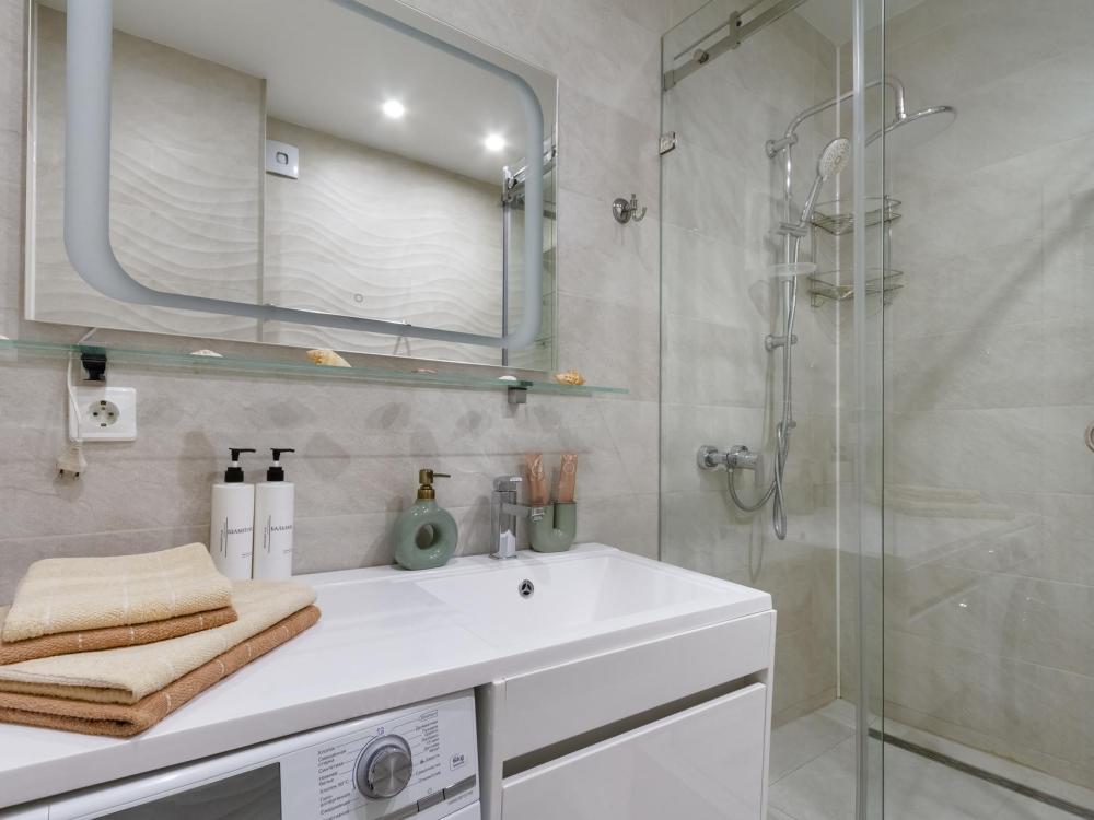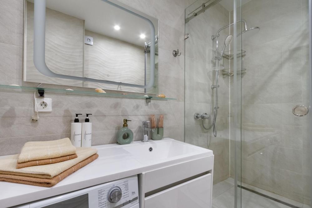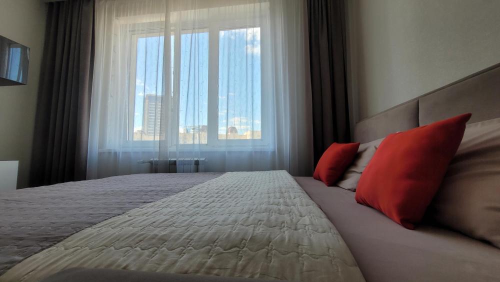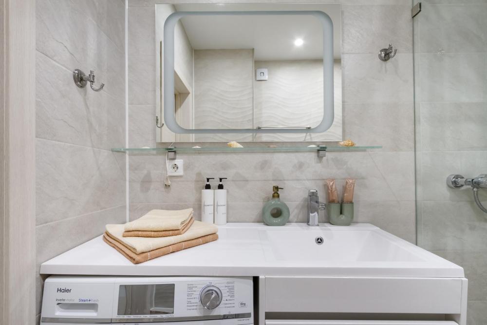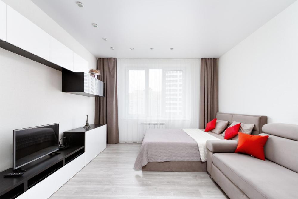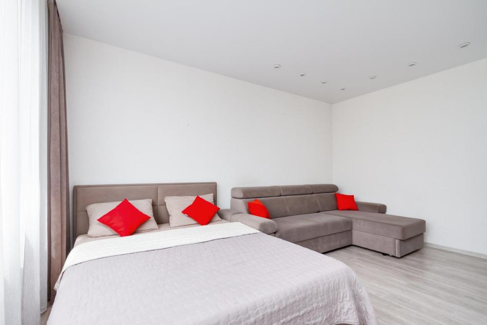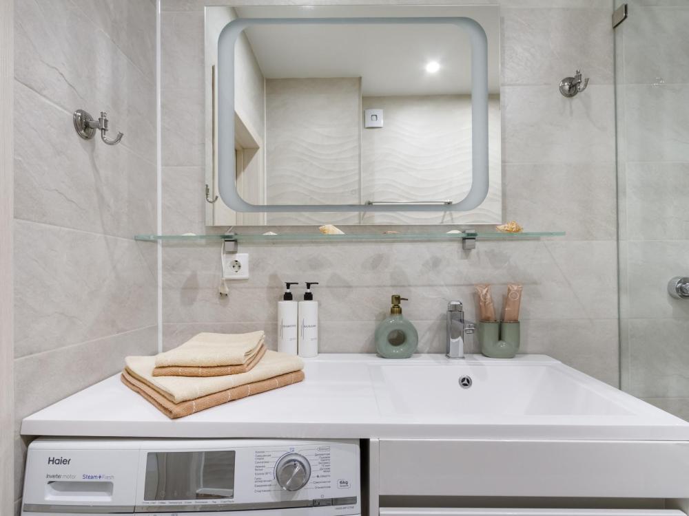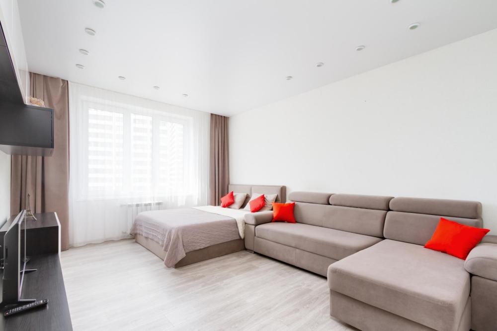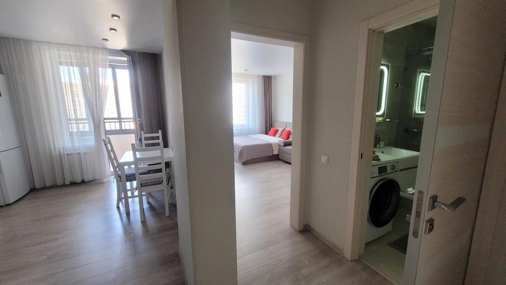 В наличии вся необходимая техника и мебель. Чистое постельное, посуда, средства гигиены и прочие приятные мелочи. В апартаментах: двуспальная кровать, диван, кухня с обеденной зоной, оборудованная необходимой техникой и посудой, санузел с душем и стиральной машиной.