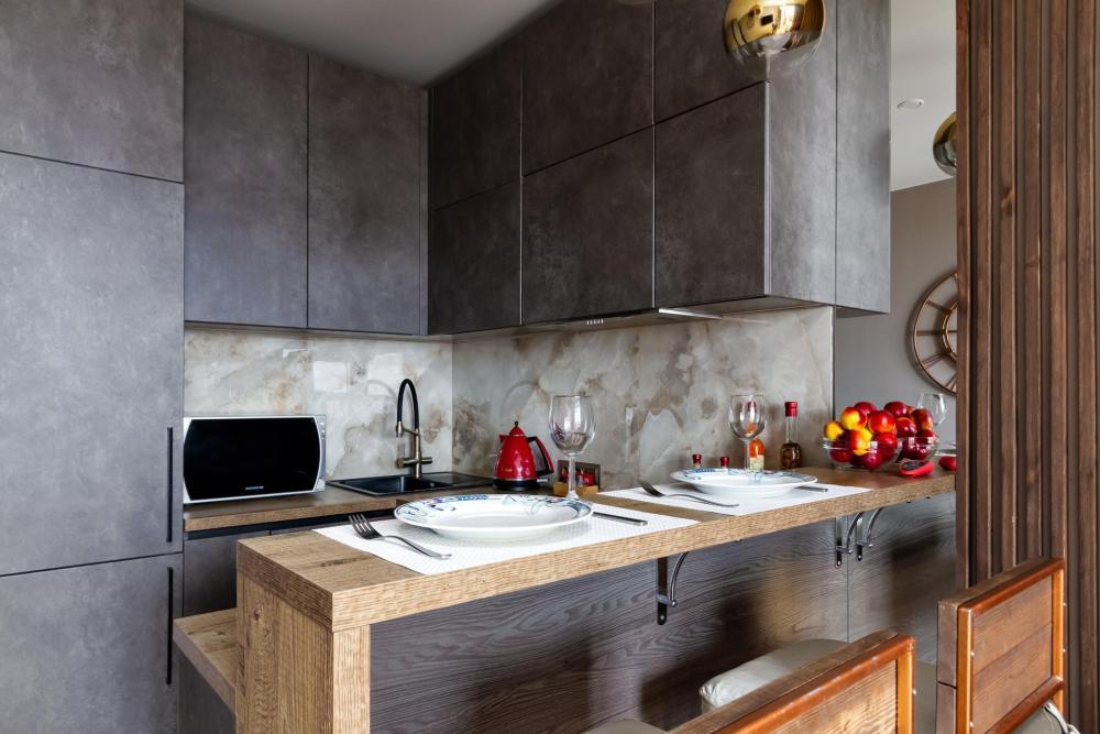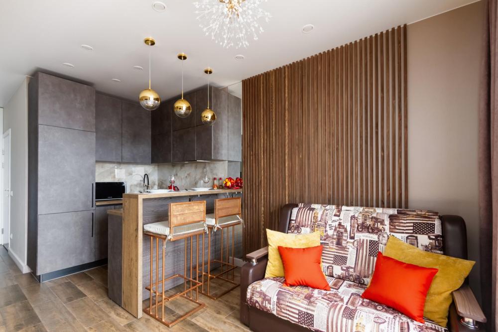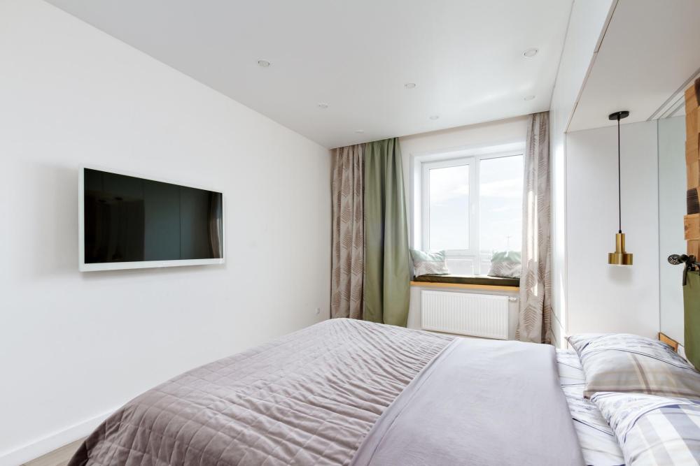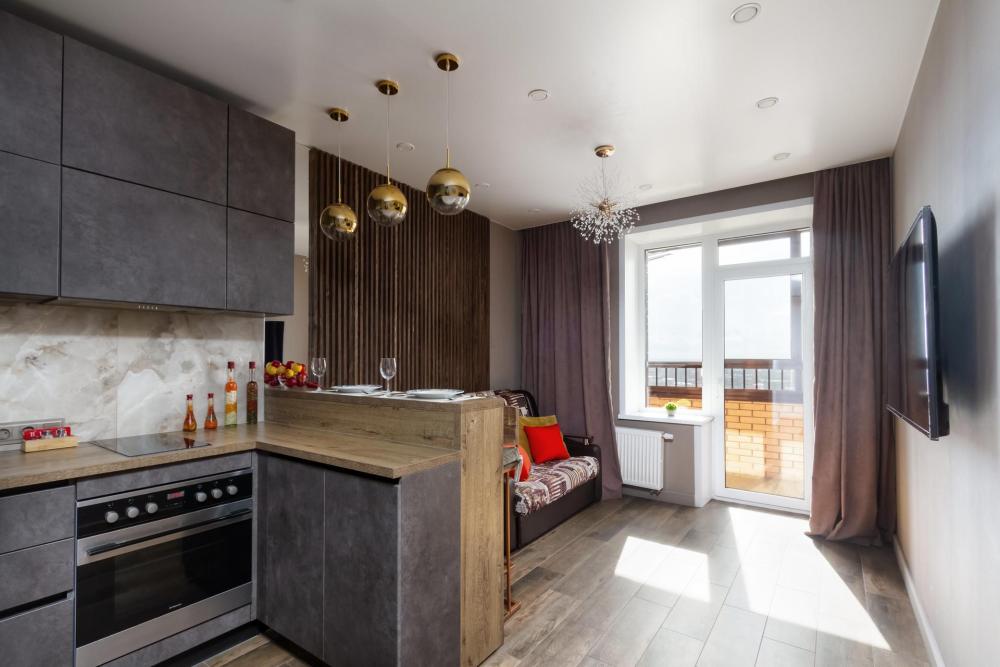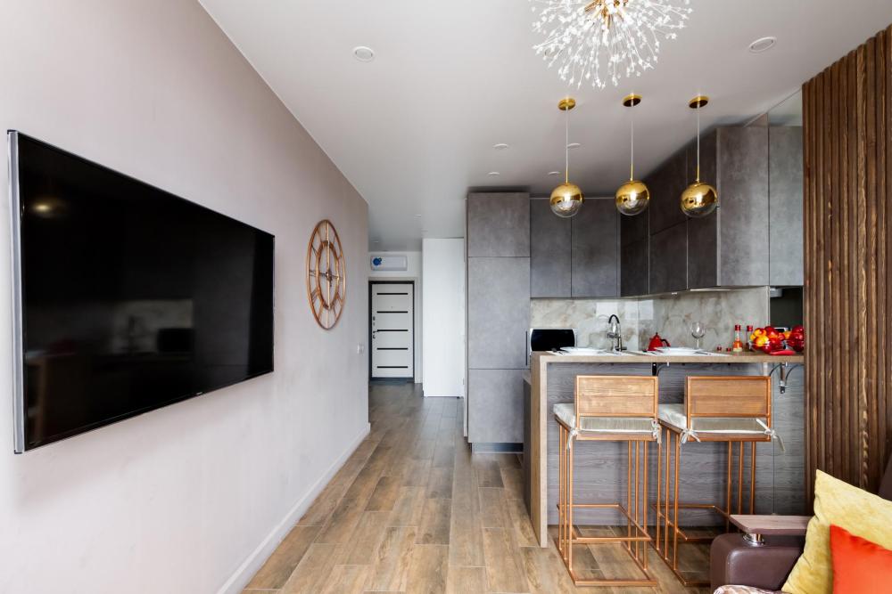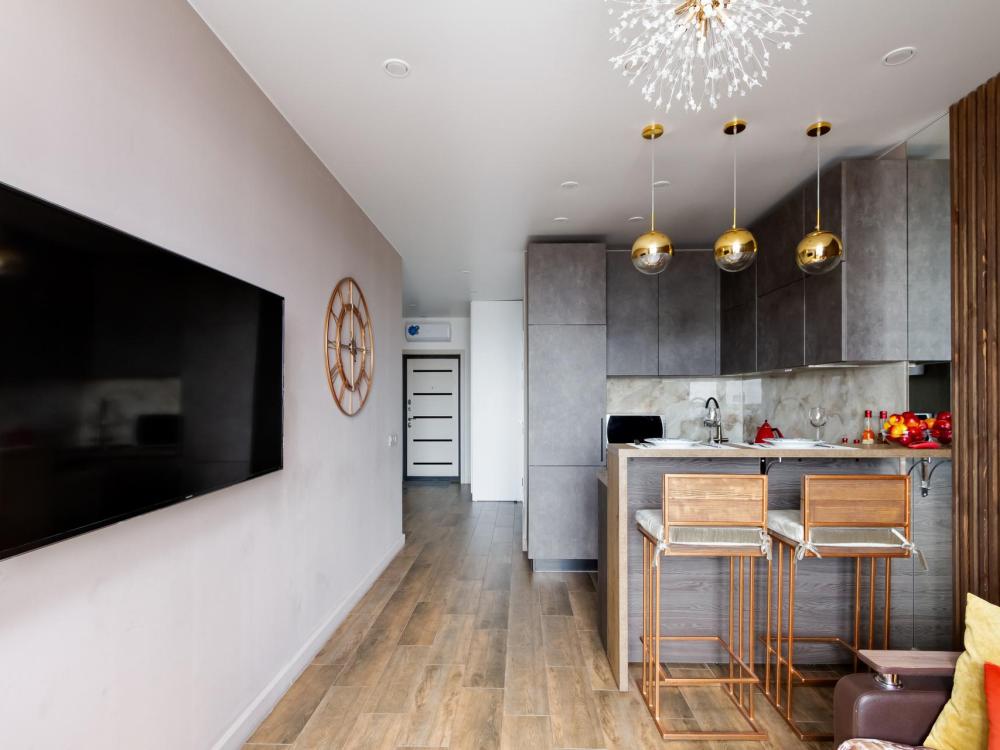 Уютные апартаменты с дизайнерским ремонтом и видом на город с высоты 24 этажа. В наличии вся необходимая техника и мебель. Чистое постельное, посуда, средства гигиены и прочие приятные мелочи. В апартаментах: двуспальная кровать, диван, кухня с обеденной зоной, оборудованная необходимой техникой и посудой, санузел с ванной и стиральной машиной.