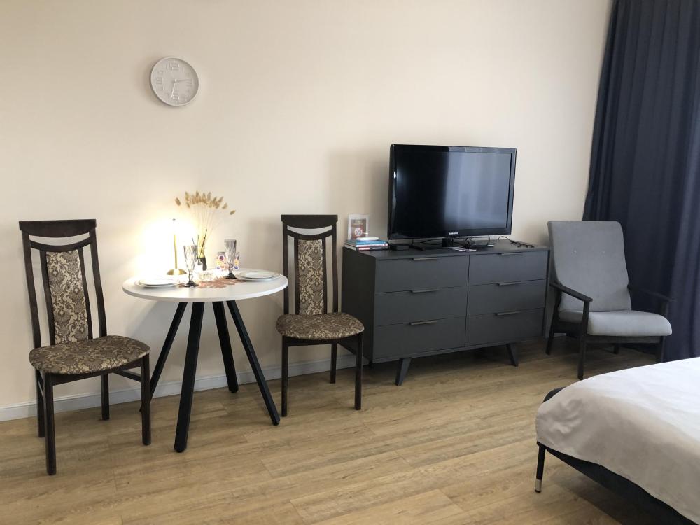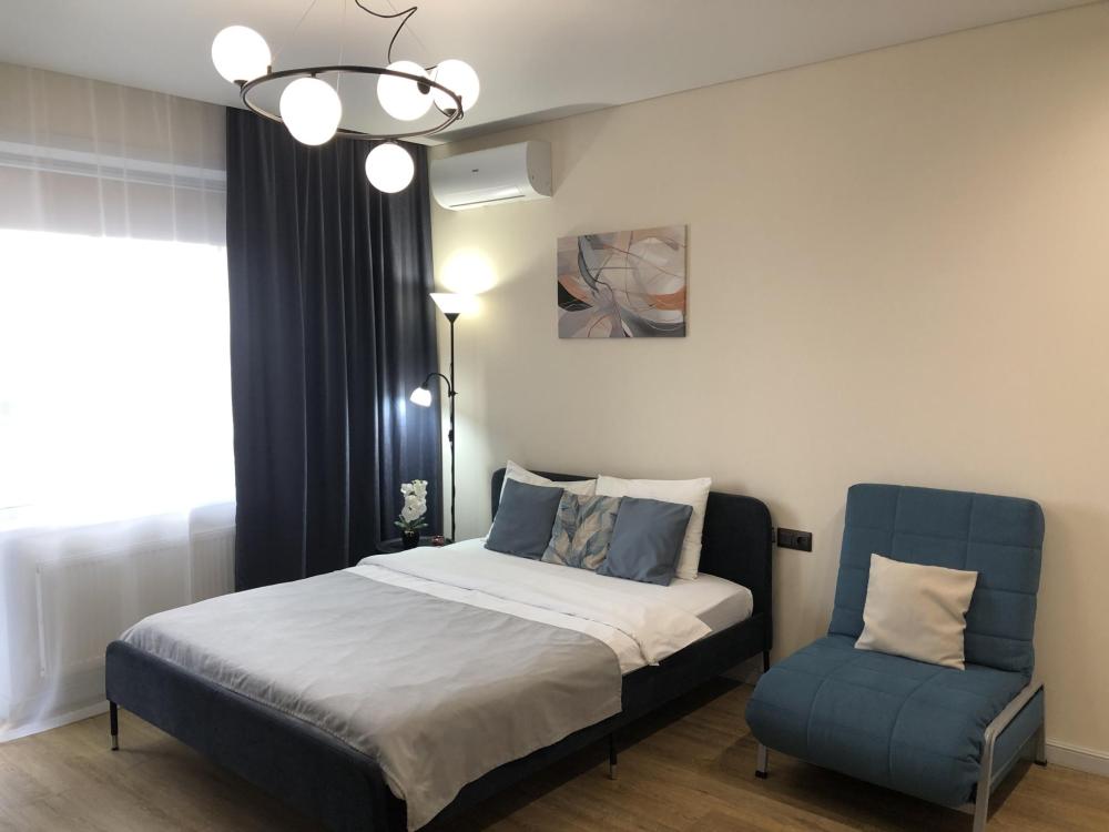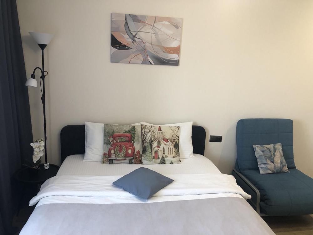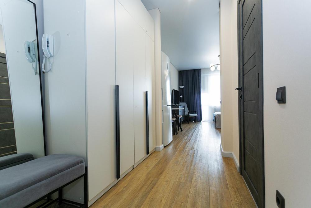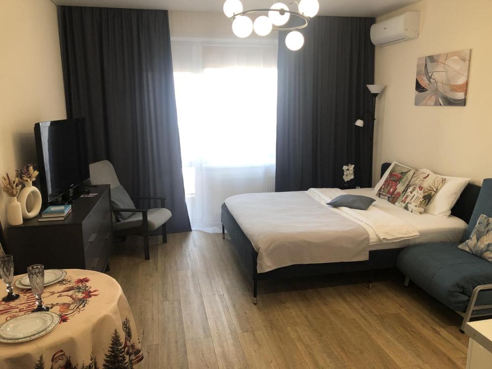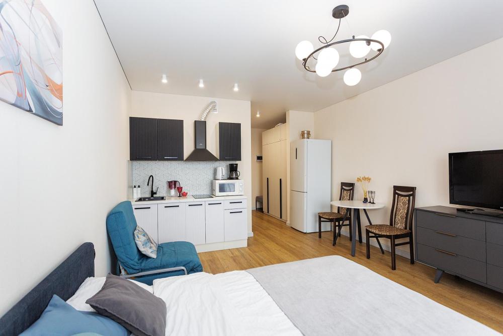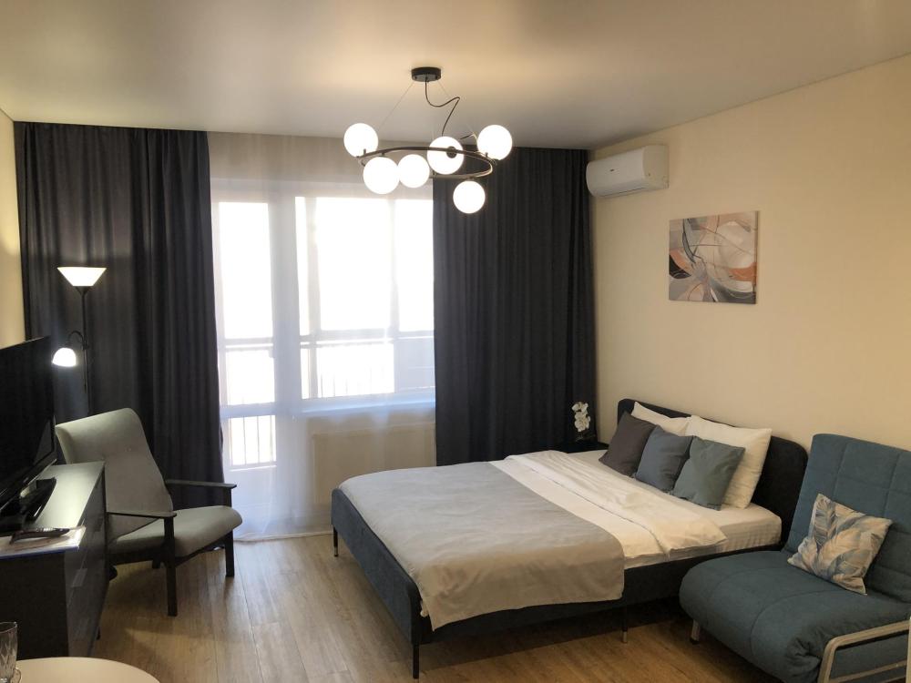 Уютные апартаменты студия, оборудованные всем необходимым для комфортного проживания. Оборудованная кухня включает варочную панель, холодильник, кофеварку, микроволновую печь, фильтр для воды, электрический чайник, сервировочную посуду, посуду для приготовления и бокалы для вина, шампанского и крепких напитков. Гостиная оборудована современной мебелью, телевизором, двуспальной кроватью с ортопедическим матрасом 160х200, креслом-кроватью односпальной, постельными принадлежностями, креслом, кондиционером, декоративным светом, утюгом и гладильной доской, шкафом и комодом, скоростным Wi-Fi и лоджией. В ванной комнате есть ванна и душ, водонагреватель, стиральная машина, фен и щипцы-выпрямитель для волос, сушилка для обуви, комплект махровых полотенец и тапочки. Средства личной гигиены включают шампунь, гель для душа, мыло, кондиционер для волос, зубную щетку и пасту, пенку для умывания и мицеллярную воду для снятия макияжа.