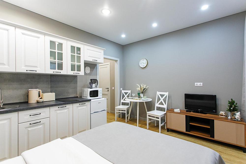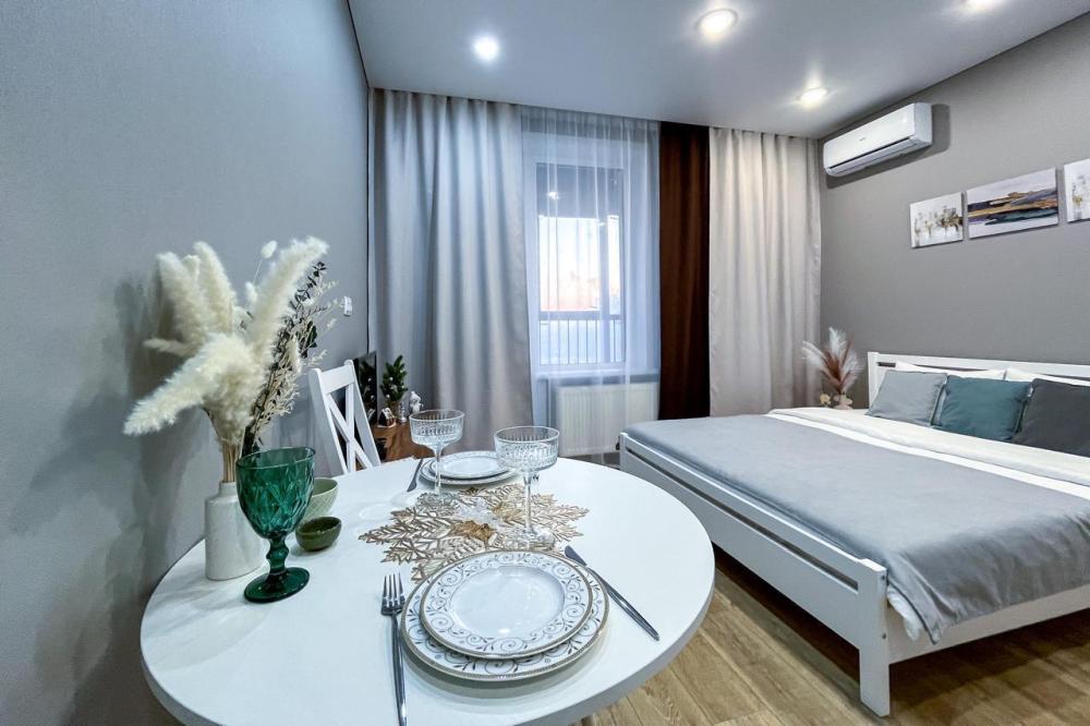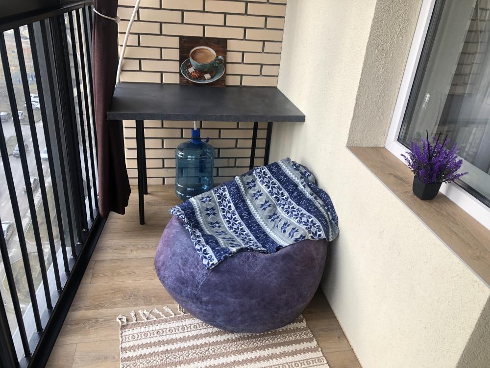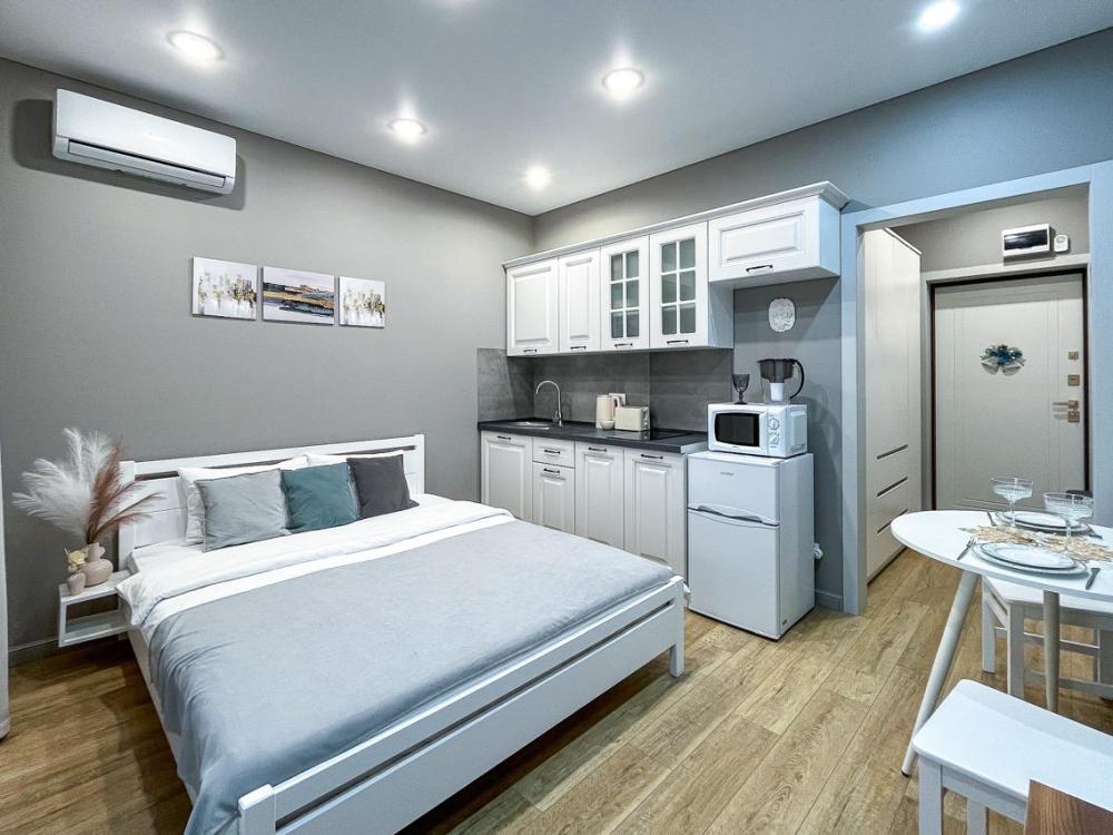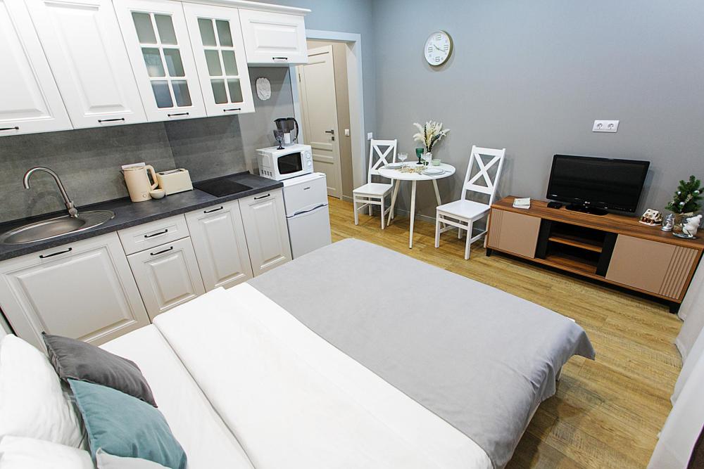 Уютные апартаменты студия, оборудованные всем необходимым для комфортного проживания. Оборудованная кухня: варочная панель, холодильник, кофеварка, микроволновая печь, фильтр для воды, электрический чайник, сервировочная посуда, посуда для приготовления, бокалы для вина и шампанского, крепких напитков, электрочайник. Гостиная: современная мебель, телевизор, двуспальная кровать с ортопедическим матрасом, кондиционер, декоративный свет, утюг, гладильная доска, шкаф, скоростной Wi-Fi, лоджия. Ванная комната: ванная и душ, водонагреватель, стиральная машина, фен, комплект махровых полотенец (3 шт.), тапочки, средства личной гигиены: шампунь, гель для душа, мыло, кондиционер для волос.