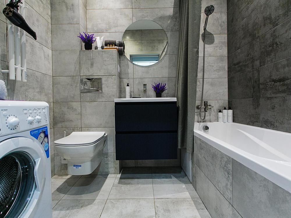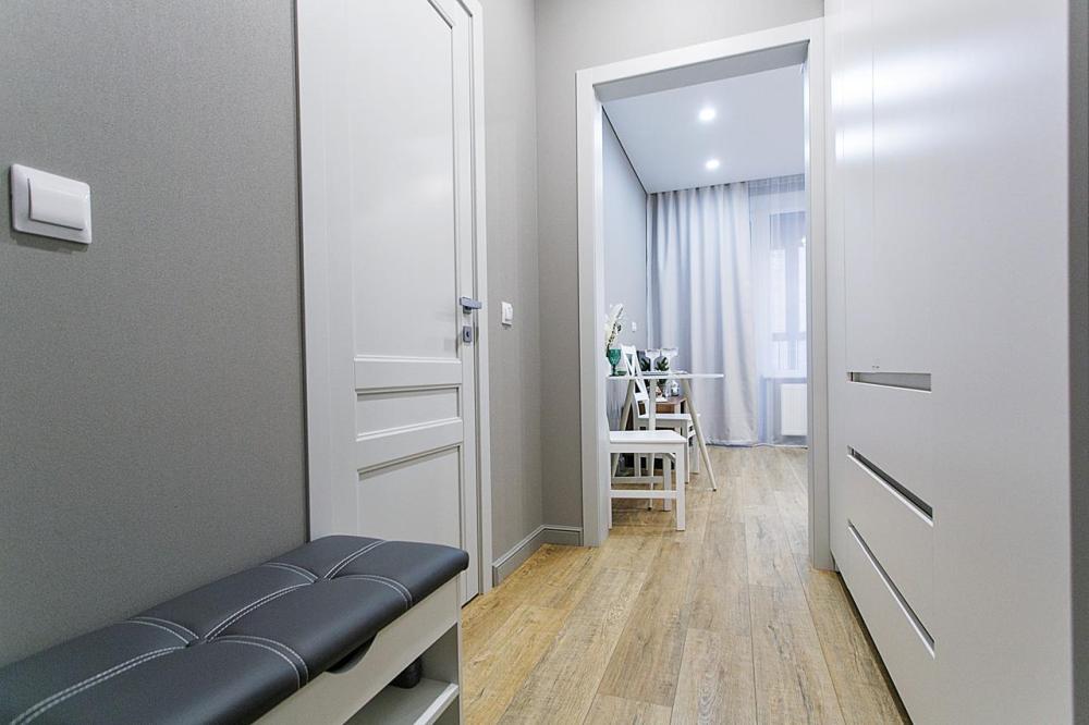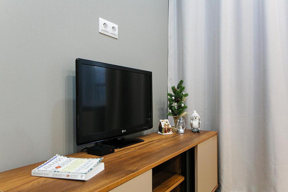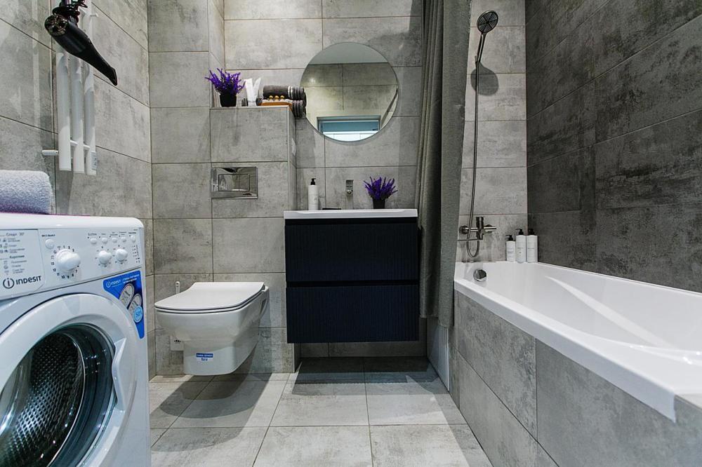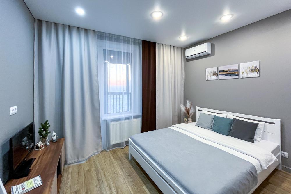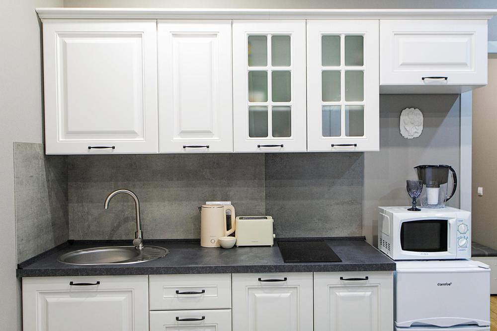 Уютные апартаменты студия, оборудованные всем необходимым для комфортного проживания. Оборудованная кухня: варочная панель, холодильник, кофеварка, микроволновая печь, фильтр для воды, электрический чайник, сервировочная посуда, посуда для приготовления, бокалы для вина и шампанского, крепких напитков, электрочайник. Гостиная: современная мебель, телевизор, двуспальная кровать с ортопедическим матрасом, кондиционер, декоративный свет, утюг, гладильная доска, шкаф, скоростной Wi-Fi, лоджия. Ванная комната: ванная и душ, водонагреватель, стиральная машина, фен, комплект махровых полотенец (3 шт.), тапочки, средства личной гигиены: шампунь, гель для душа, мыло, кондиционер для волос.