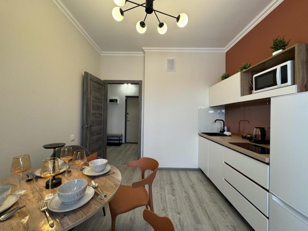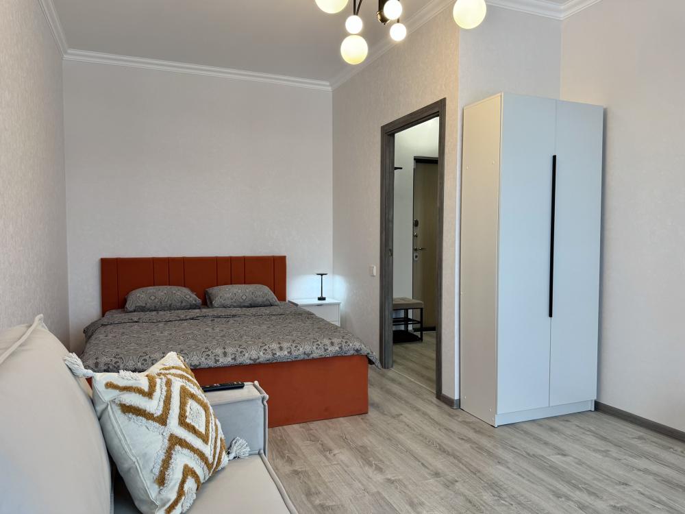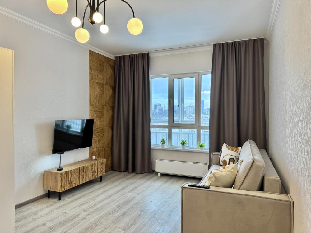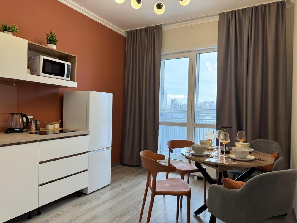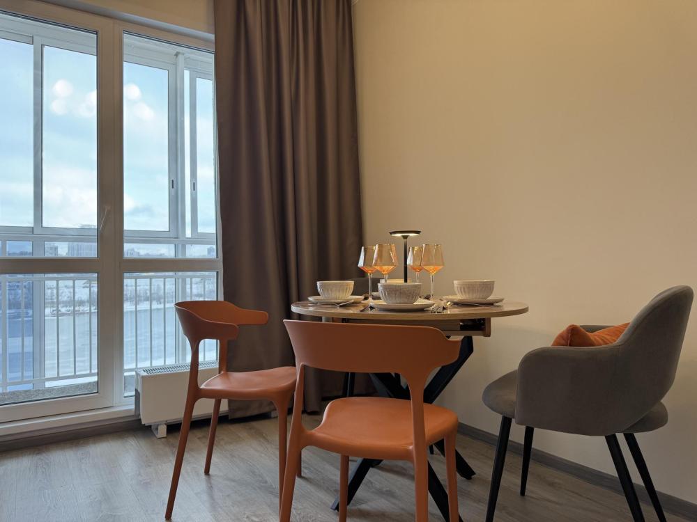 Однокомнатная с акцентом у Набережной в новом микрорайоне Ясный берег. Комфортное расположение до 4-х гостей: двуспальная кровать queen-size, двуспальный диван-кровать, Smart-TV, безлимитный Wi-Fi, холодильник с морозильной камерой, СВЧ, варочная панель, водонагреватель, электрический чайник, стиральная машина, фен, утюг, вентилятор. Необходимая посуда и столовые приборы, а также постельное белье, полотенца на каждого гостя и средства личной гигиены.
