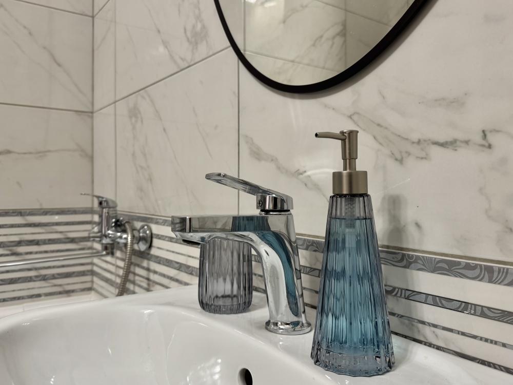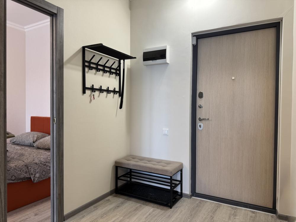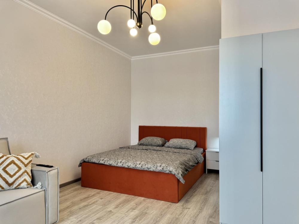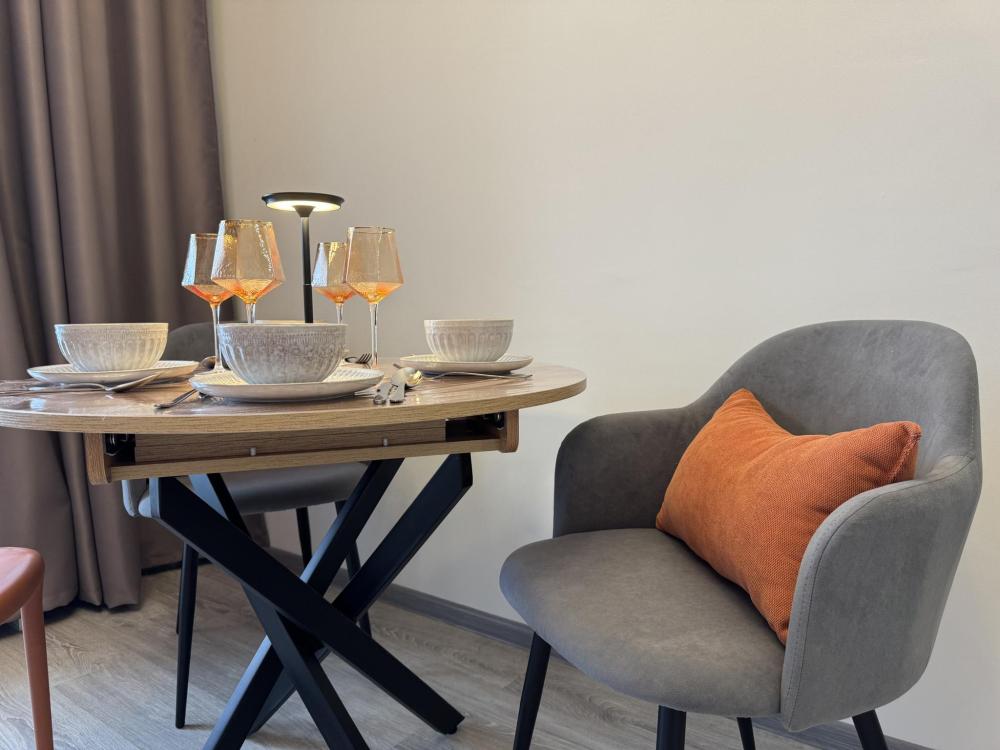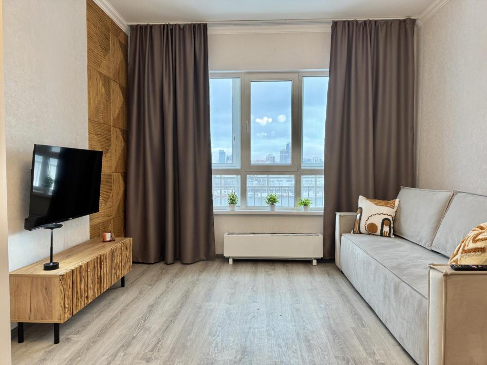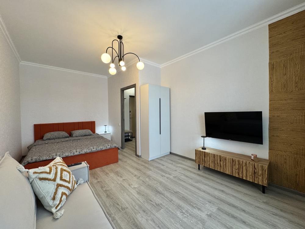 Однокомнатная с акцентом у Набережной в новом микрорайоне Ясный берег. Комфортное расположение до 4-х гостей: двуспальная кровать queen-size, двуспальный диван-кровать, Smart-TV, безлимитный Wi-Fi, холодильник с морозильной камерой, СВЧ, варочная панель, водонагреватель, электрический чайник, стиральная машина, фен, утюг, вентилятор. Необходимая посуда и столовые приборы, а также постельное белье, полотенца на каждого гостя и средства личной гигиены.