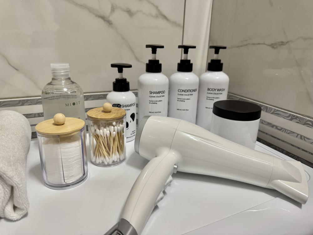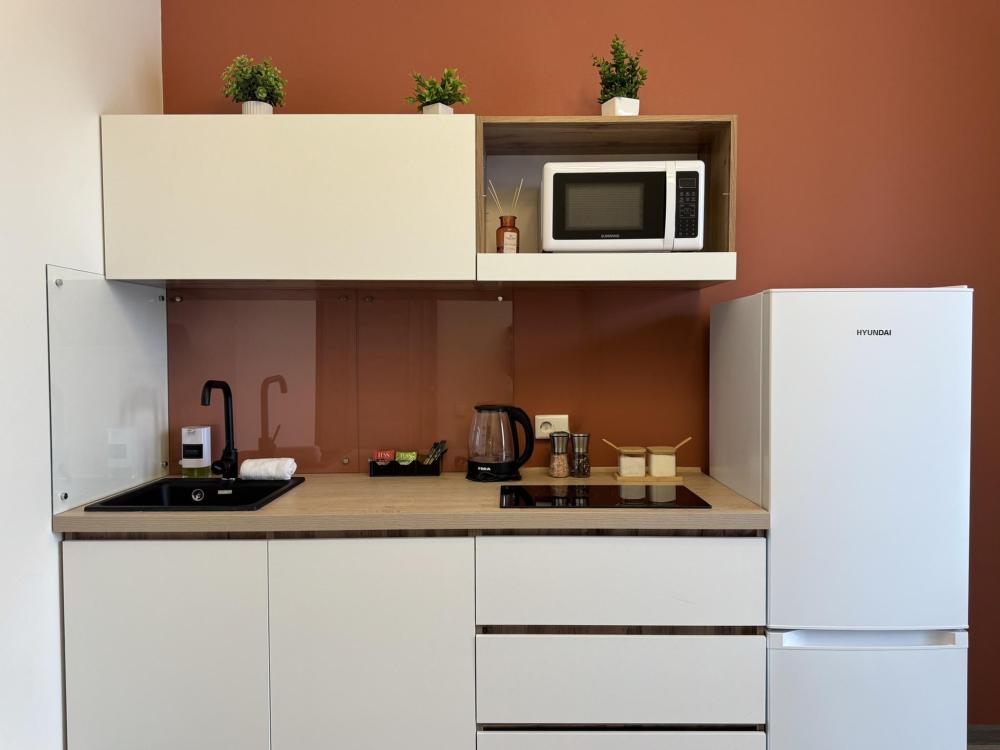 НАПОЛНЕНИЕ * мебель: кровать queen-size 160х200, двуспальный диван-кровать, шкаф платяной / гардероб, обеденный стол, стулья * техника: Smart-TV, безлимитный Wi-Fi, холодильник, СВЧ, варочная панель, электрический чайник, стиральная машина, водонагреватель, фен, утюг, кондиционер * аксессуары для дома: гладильная доска, сушилка для белья, плечики * необходимая посуда и столовые приборы * приветственные стики зелёного и чёрного чая, сахара, соль * постельное белье, полотенца на каждого гостя * средства личной гигиены
