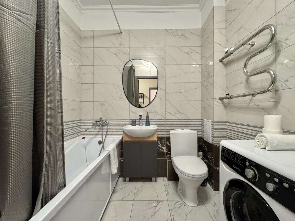 Двухкомнатные апартаменты для 5 гостей. Спальные места: диван, двуспальная и односпальная кровать. Мебель: шкаф/комод для одежды, обеденный стол, стулья. Техника: телевизор с цифровыми каналами, безлимитный wi-fi, холодильник, микроволновая печь, варочная панель/духовка, стиральная машина, электрический чайник, фен, утюг, вентилятор/кондиционер. Аксессуары для дома: гладильная доска, сушилка для белья, плечики. В квартире есть посуда и столовые приборы, постельное белье, полотенца на каждого гостя