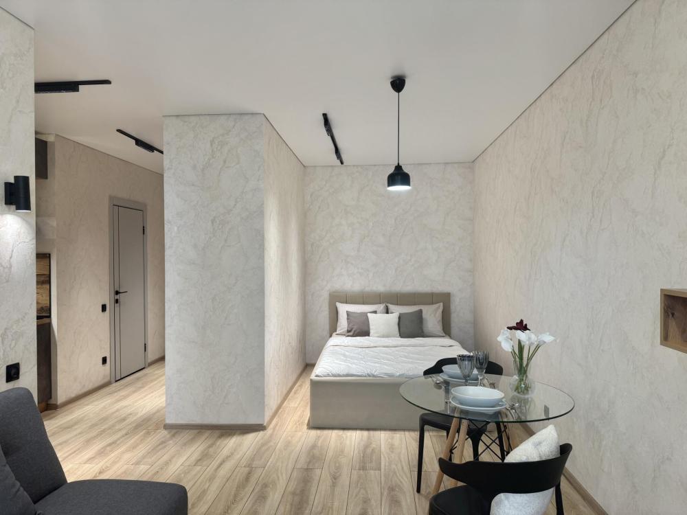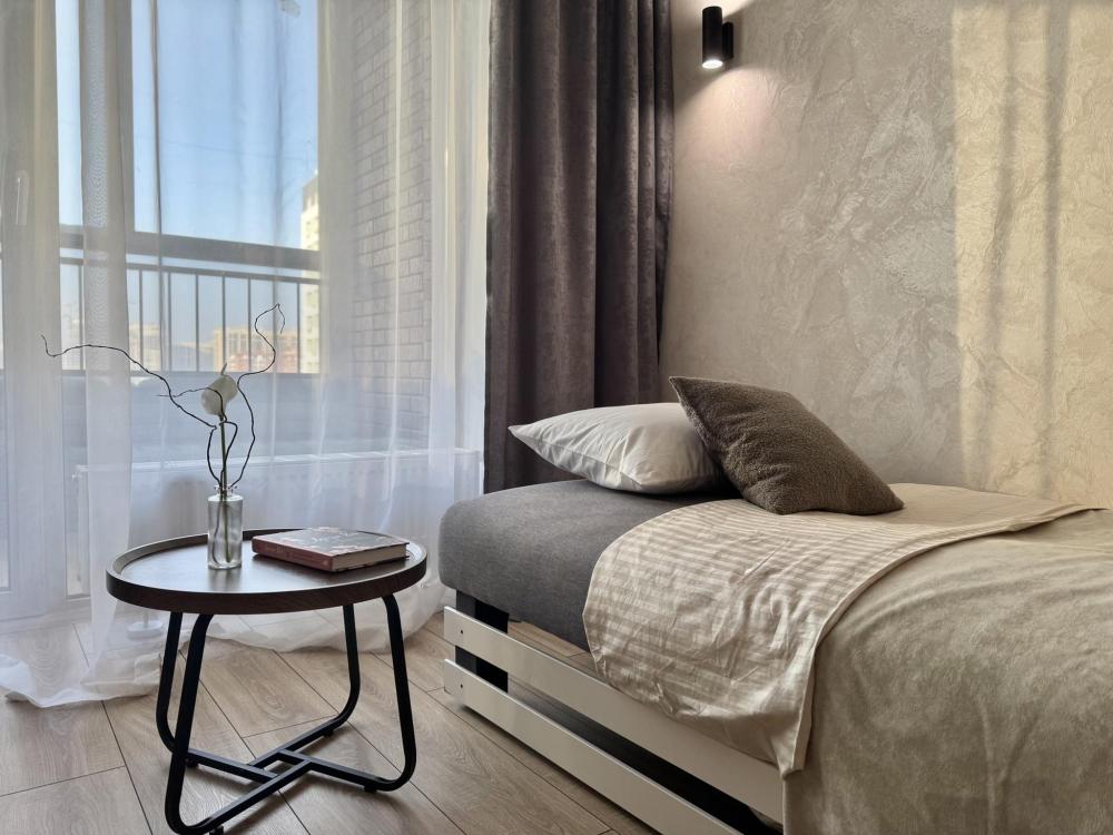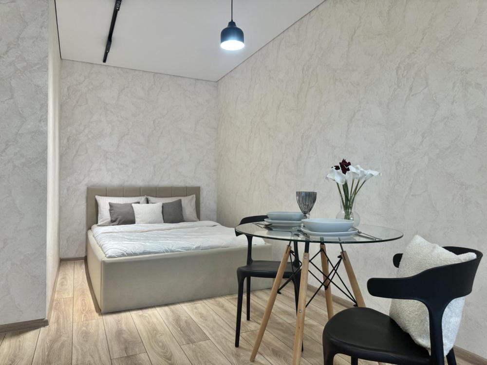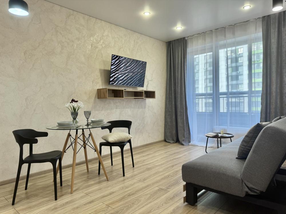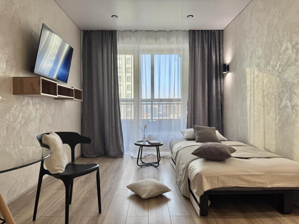Современная студия в стильном ЖК бизнес-класса "Прованс". Комфортное расположение до 3-х готсей: двуспальный диван-кровать, односпальное кресло-кровать, Smart-TV, безлимитный Wi-Fi, холодильник с морозильной камерой, СВЧ, варочная панель, вытяжка с подсветкой, водонагреватель, электрический чайник, стиральная машина, фен, утюг. Необходимая посуда и столовые приборы, а также постельное белье, полотенца на каждого гостя и средства личной гигиены.