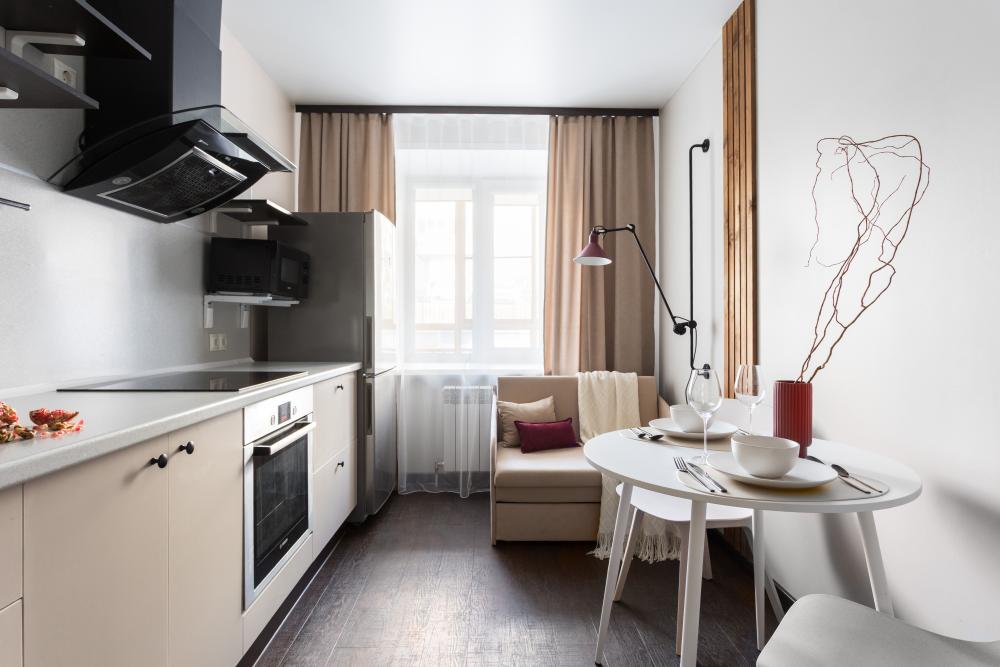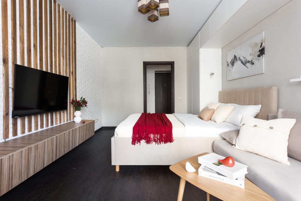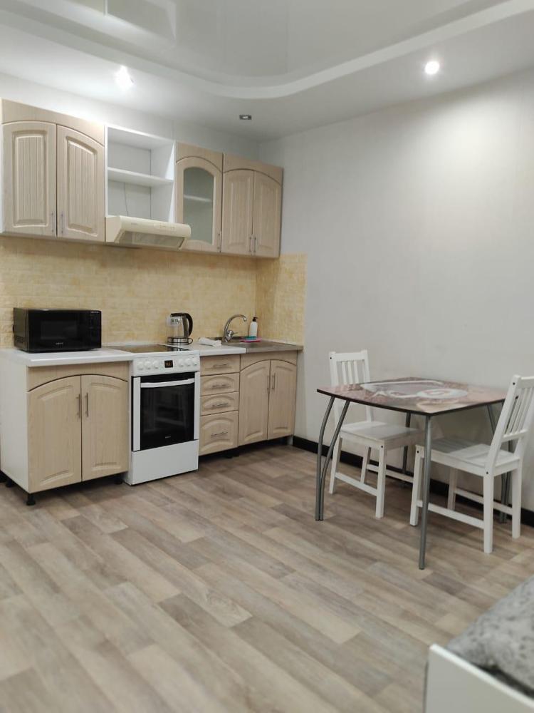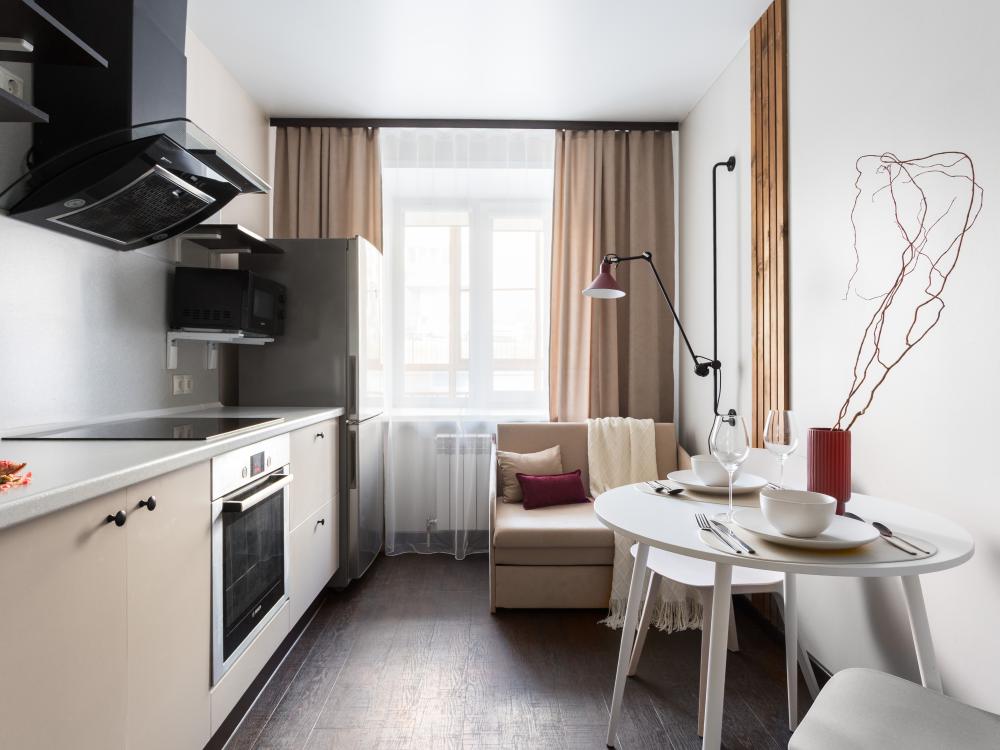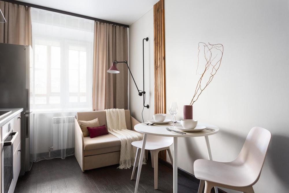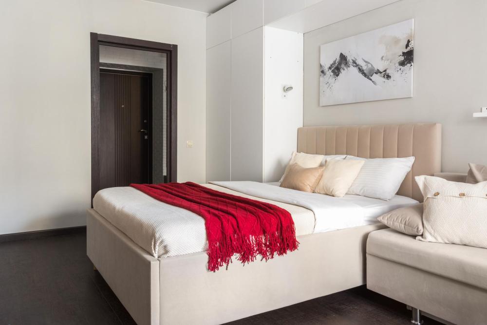 В апартаментах возможно размещение 4 человек. Спальные места: двуспальная кровать, раскладной диван. Кухня оборудована необходимой посудой и техникой: холодильник, варочная поверхность, микроволновая печь, электрический чайник. К услугам гостей также телевизор, wi-fi, стиральная машина, постельное белье, полотенца, утюг, фен.