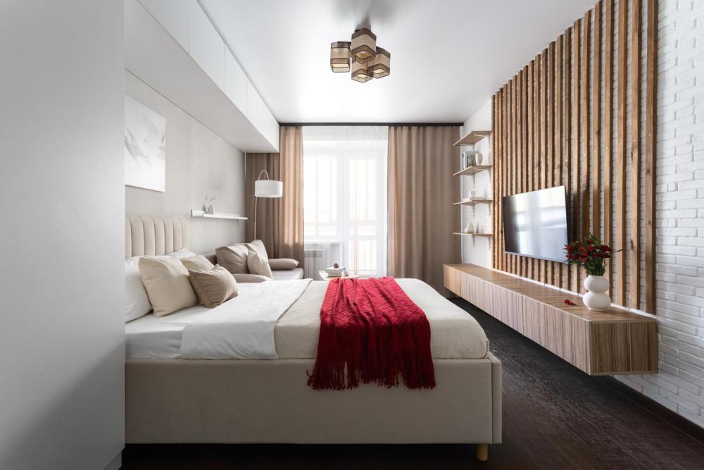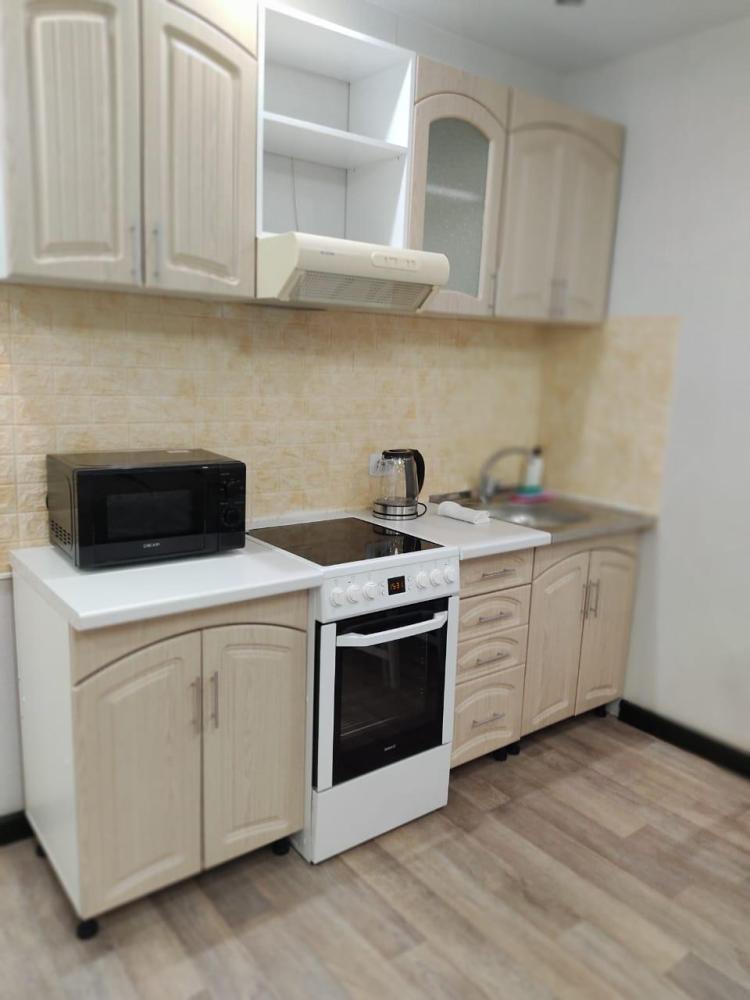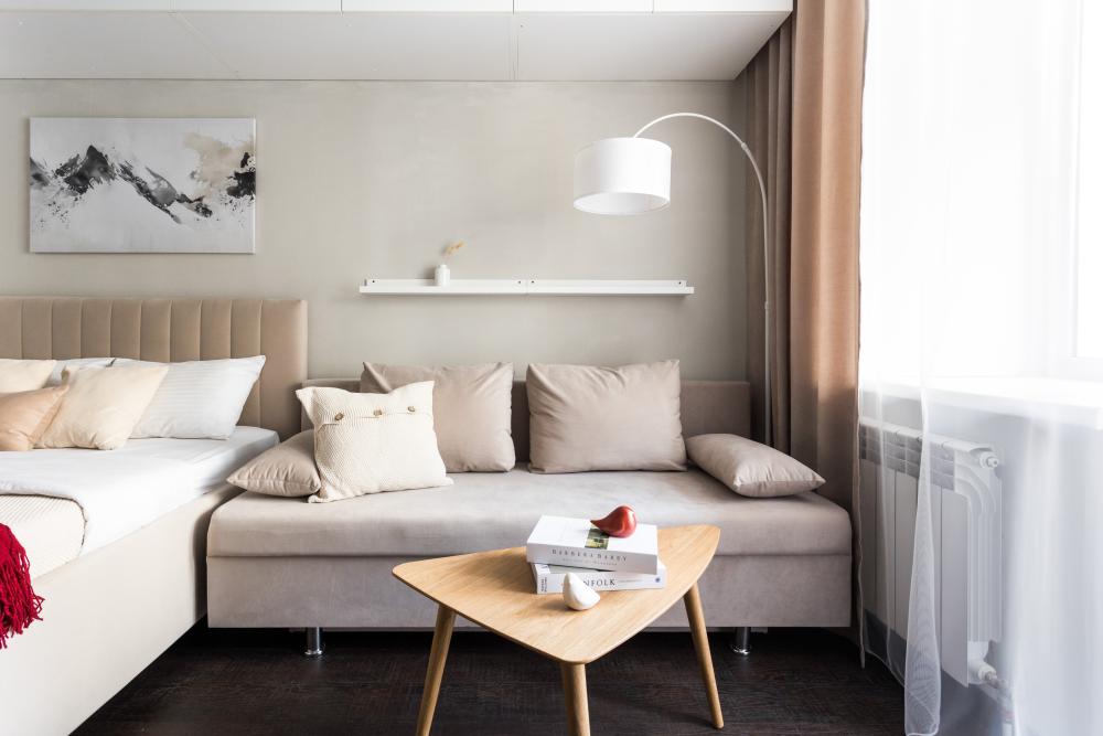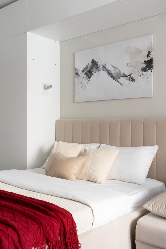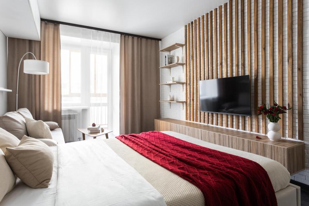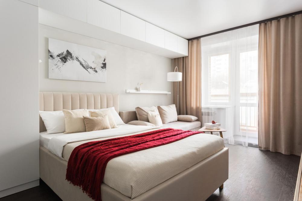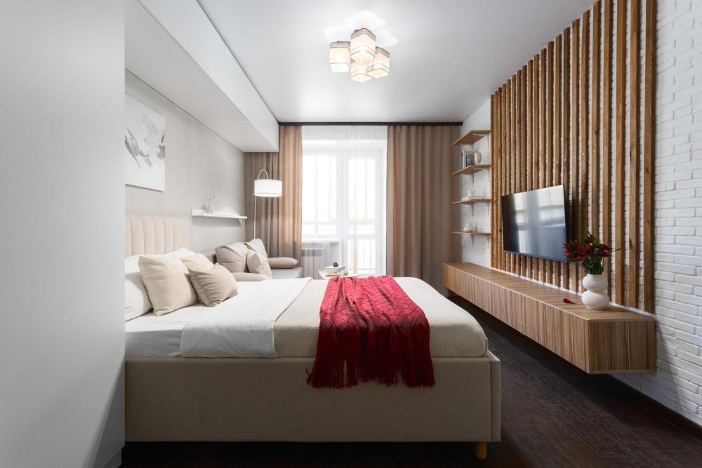 В апартаментах возможно размещение 4 человек. Спальные места: двуспальная кровать, раскладной диван. Кухня оборудована необходимой посудой и техникой: холодильник, варочная поверхность, микроволновая печь, электрический чайник. К услугам гостей также телевизор, wi-fi, стиральная машина, постельное белье, полотенца, утюг, фен.