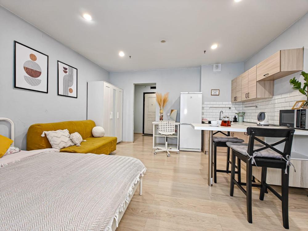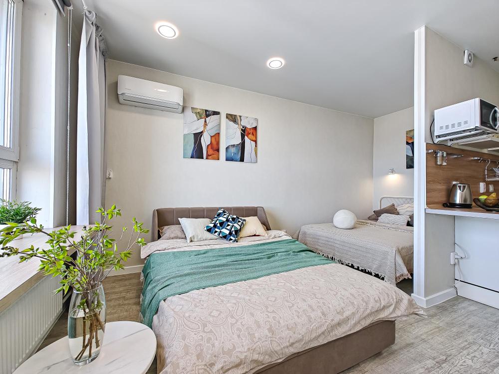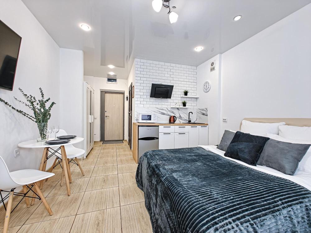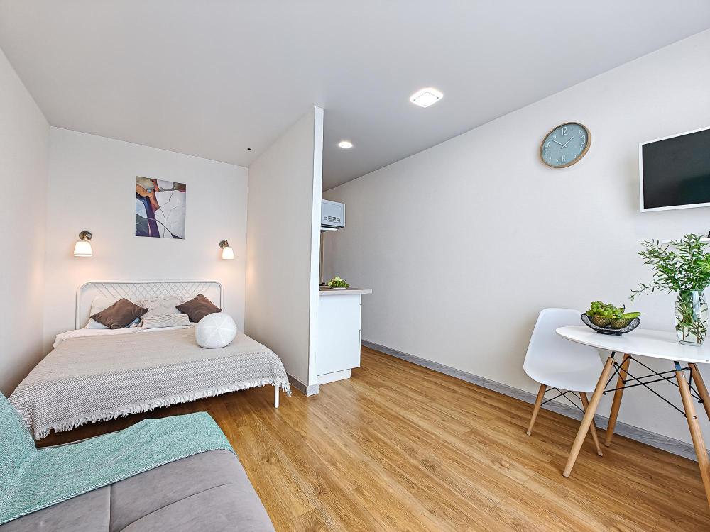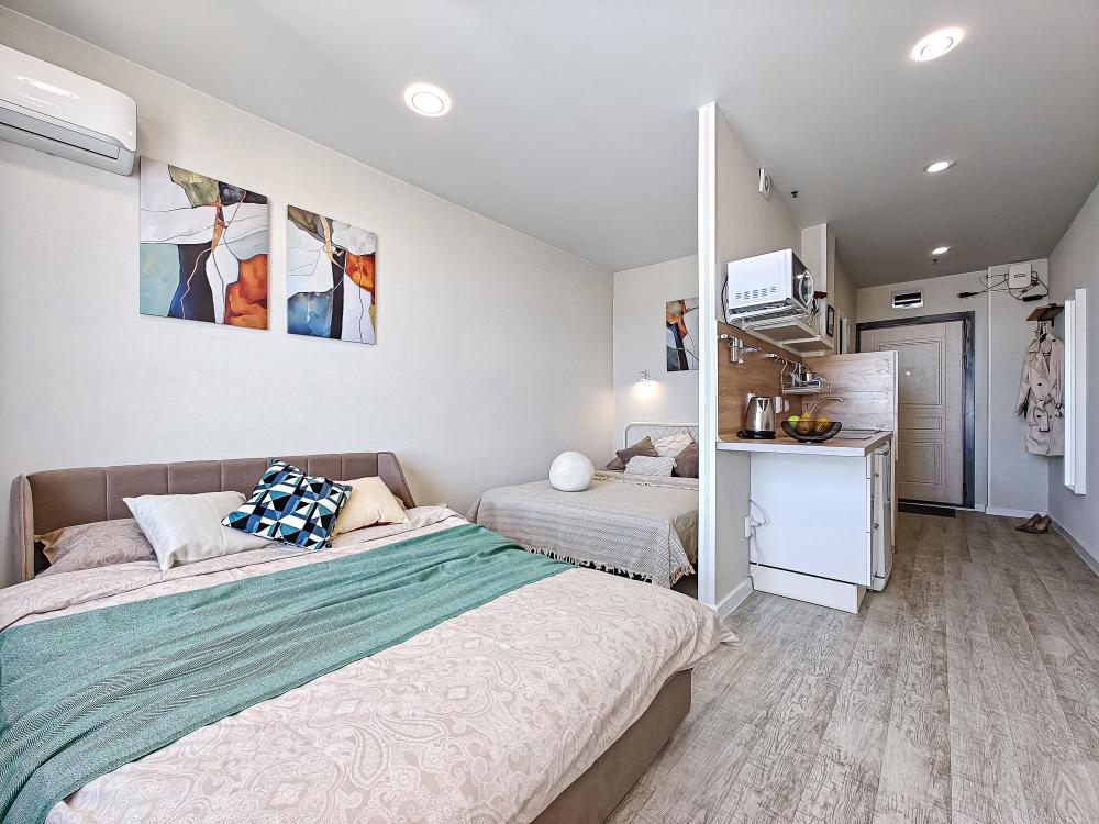 В квартире есть все необходимое для комфортного проживания: кровать с шикарным высоким ортопедическим матрасом, бытовая техника - плита, посуда,холодильник, утюг, гладильная доска, стиральная машина, фен; высокоскоростной интернет, бесплатный wi-fi, TV, кондиционер, чистое хлопковое постельное белье, полотенца, тапочки, мыло, гель для душа, средства гигиены, фильтр для воды. Халат предоставляется по запросу. В некоторых апартаментах есть балкон.
