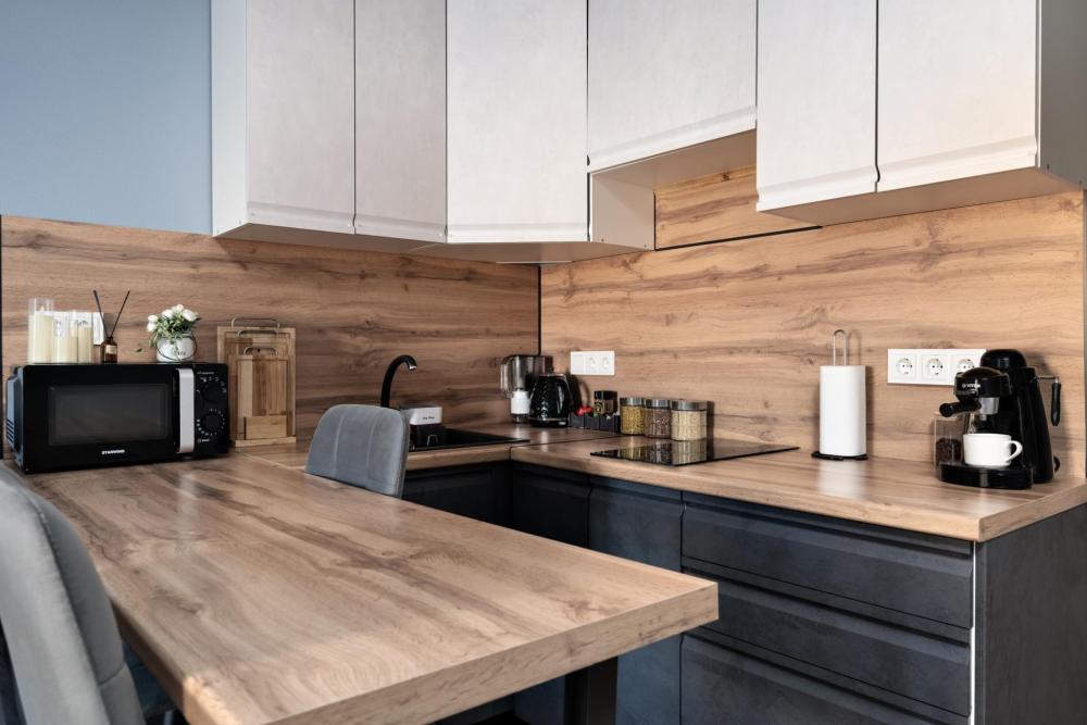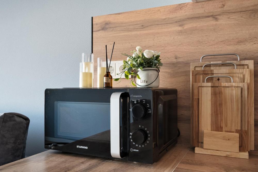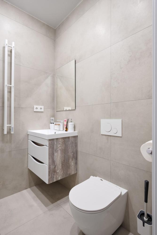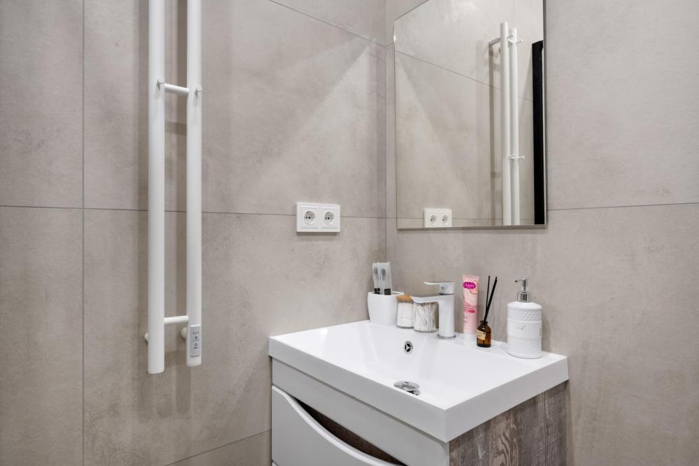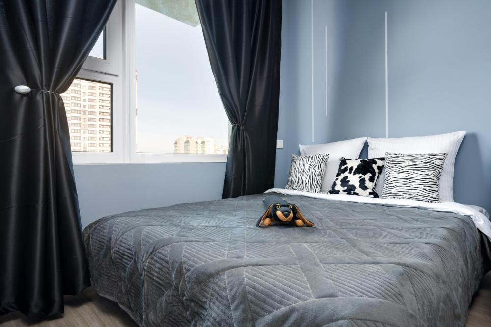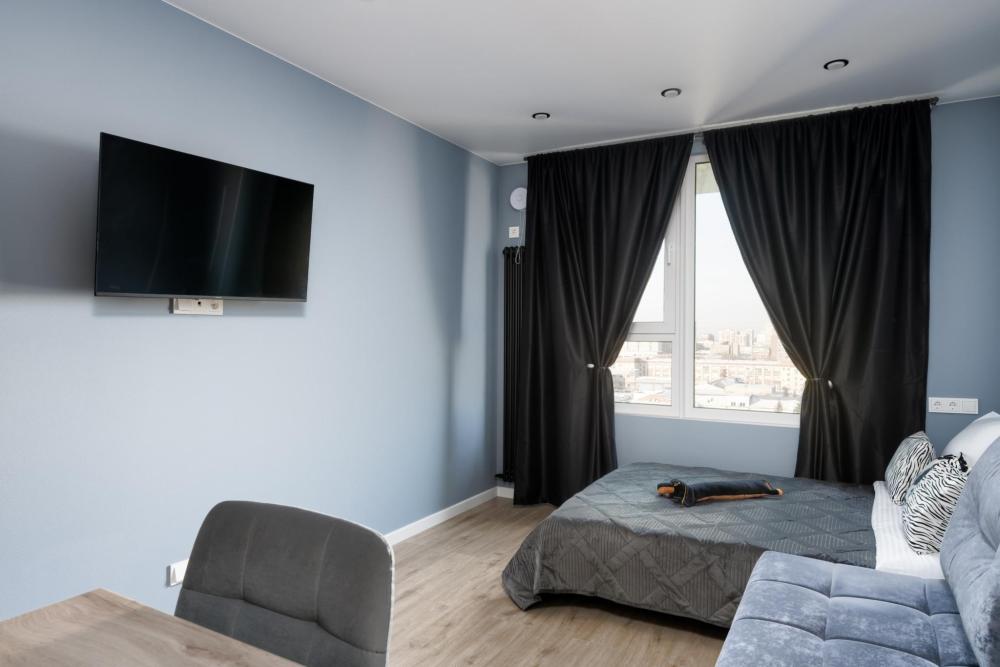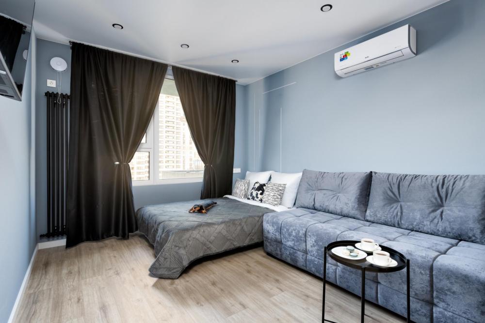 Студия расположена на 11 этаже. Она выполнена в современном стиле, удобна и функциональна. Высокие потолки и теплые, уютные цвета создают атмосферу спокойствия. Оснащение: - Двуспальная кровать (140 * 200) с ортопедическим матрасом, - двуспальный диван, - белоснежное постельное белье и мягкие полотенца, - кондиционер, - высокоскоростной Wi-Fi для вечернего просмотра фильмов, - вся бытовая техника: фен, утюг, стиральная машина, чайник, холодильник, варочная панель, СВЧ, кофеварка и тостер, - посуда и кухонные принадлежности, - сушилка для одежды и гладильная доска, - небольшой набор продуктов, чай и кофе для утреннего пробуждения.