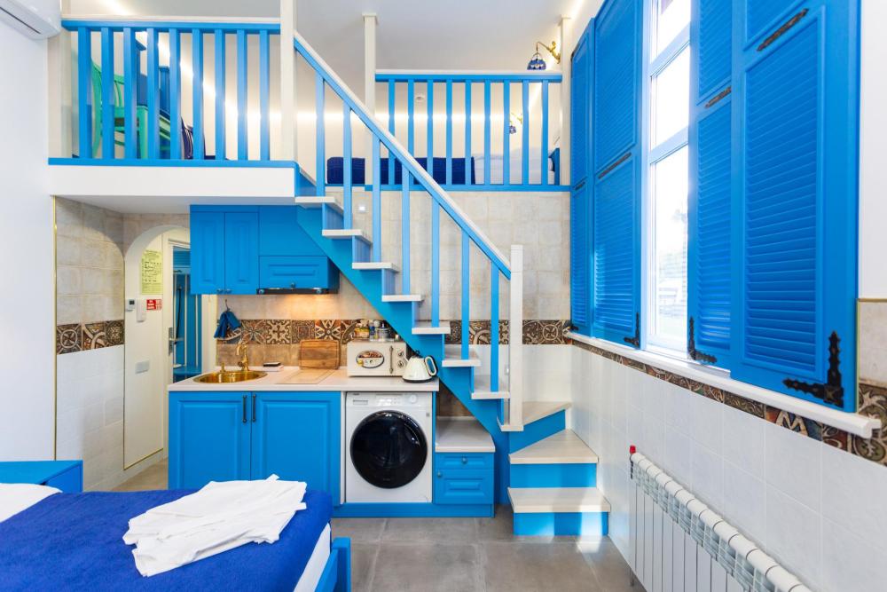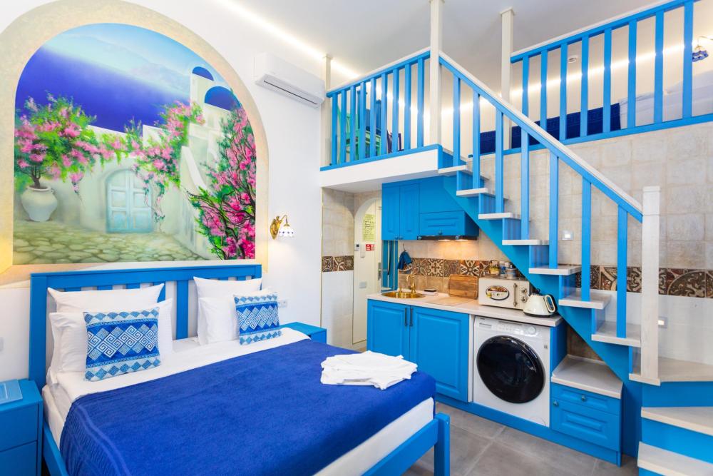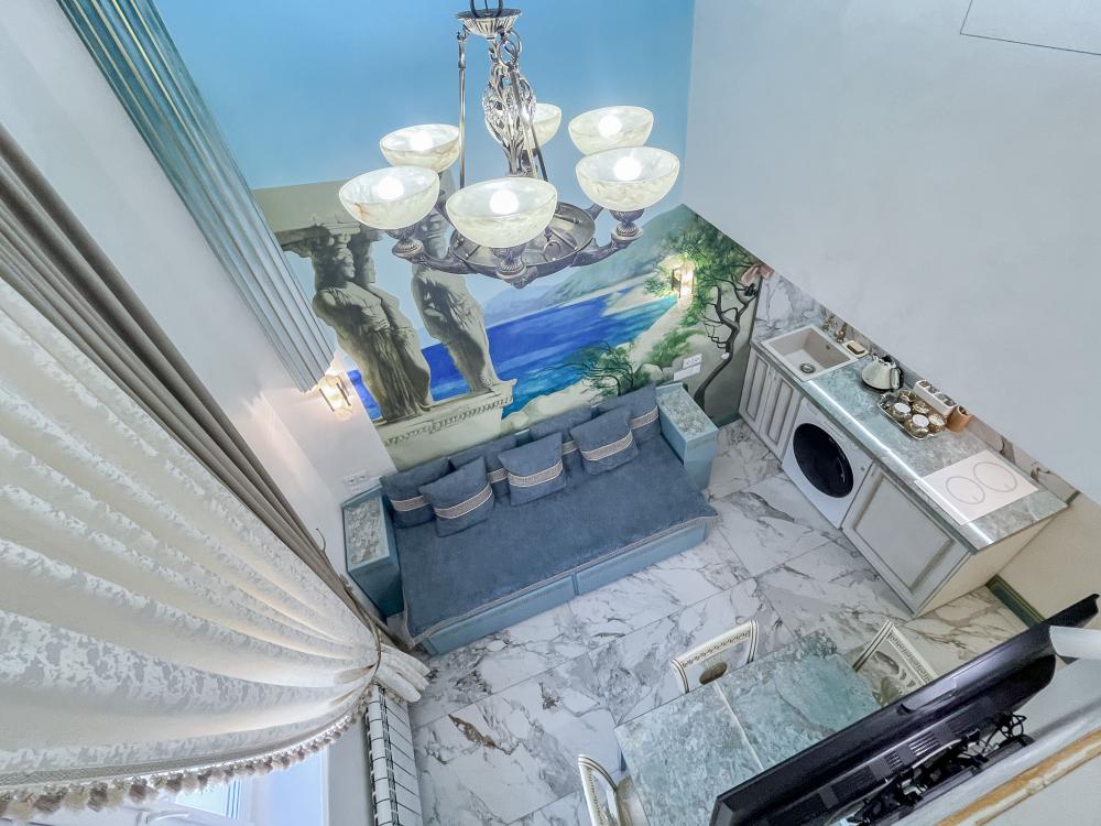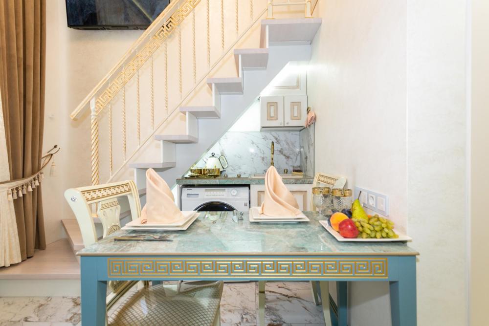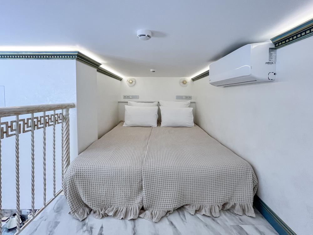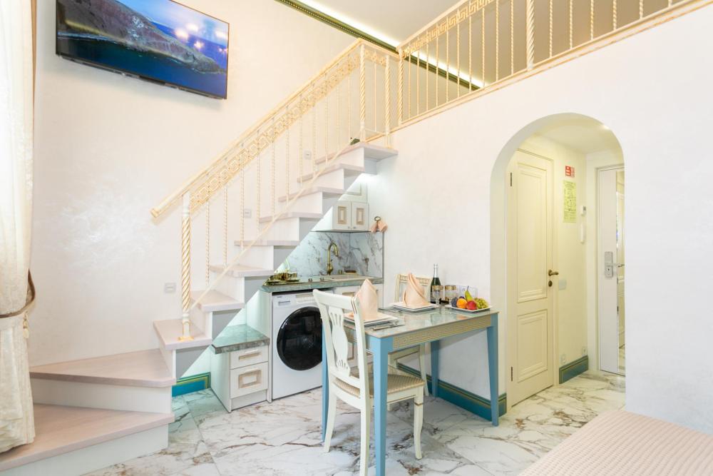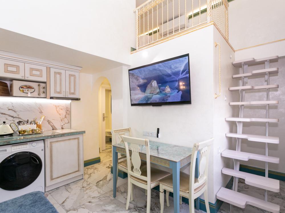 Двухуровневый номер оборудован комфортной мебелью, антикварными деталями и современными удобствами: кондиционер, телевизор, Wi-Fi, кухонная зона, стиральная машина, ванная комната.