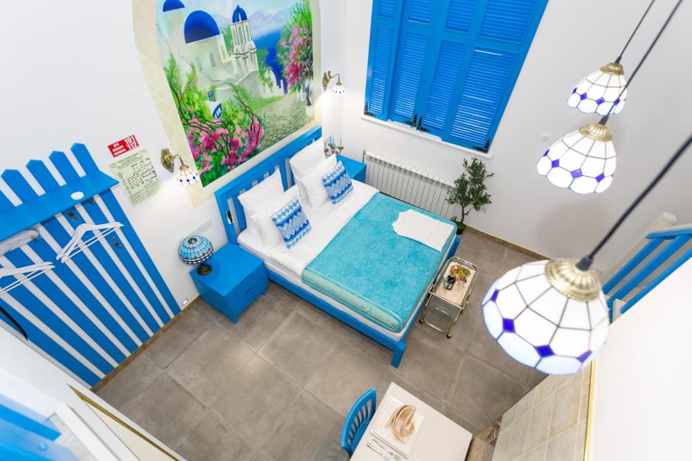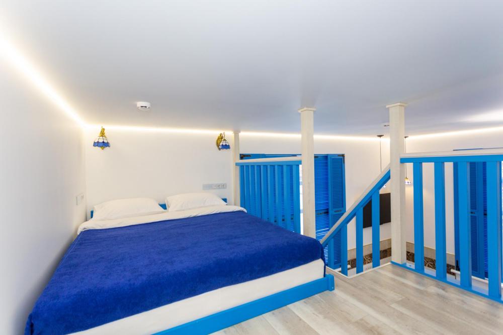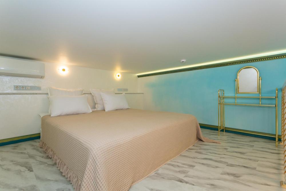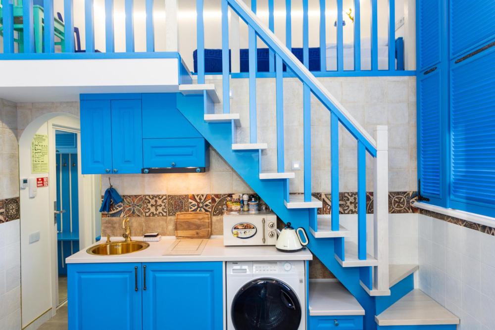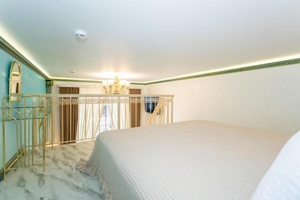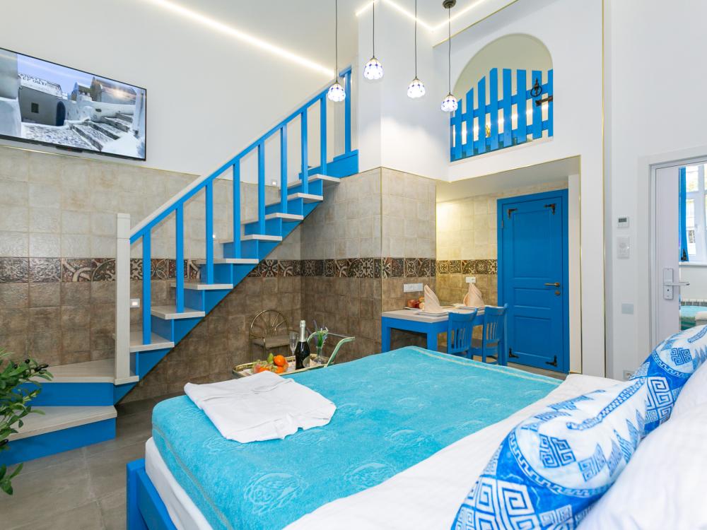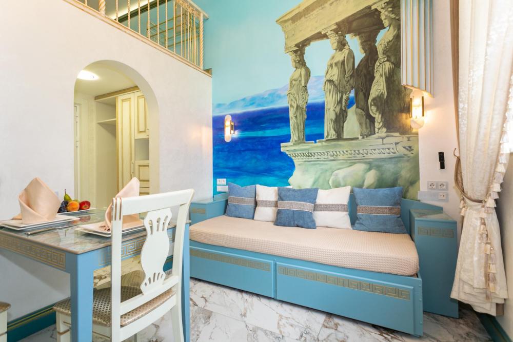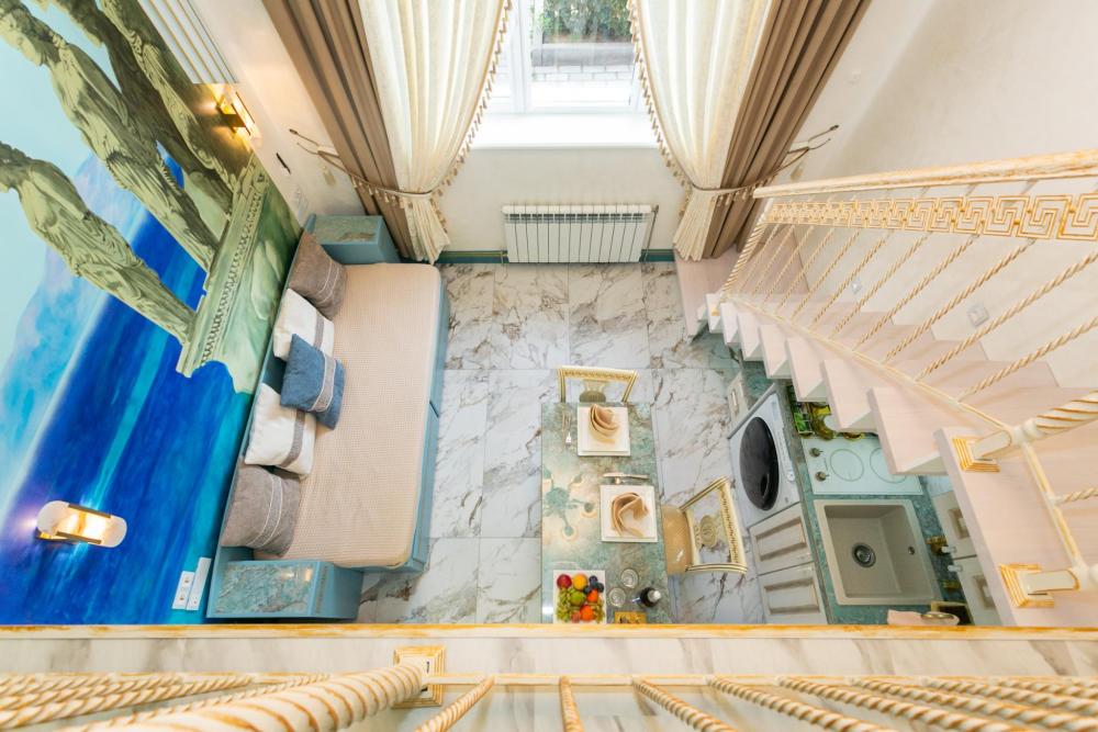Двухуровневый номер оборудован комфортной мебелью, антикварными деталями и современными удобствами: кондиционер, телевизор, Wi-Fi, кухонная зона, стиральная машина, ванная комната.
