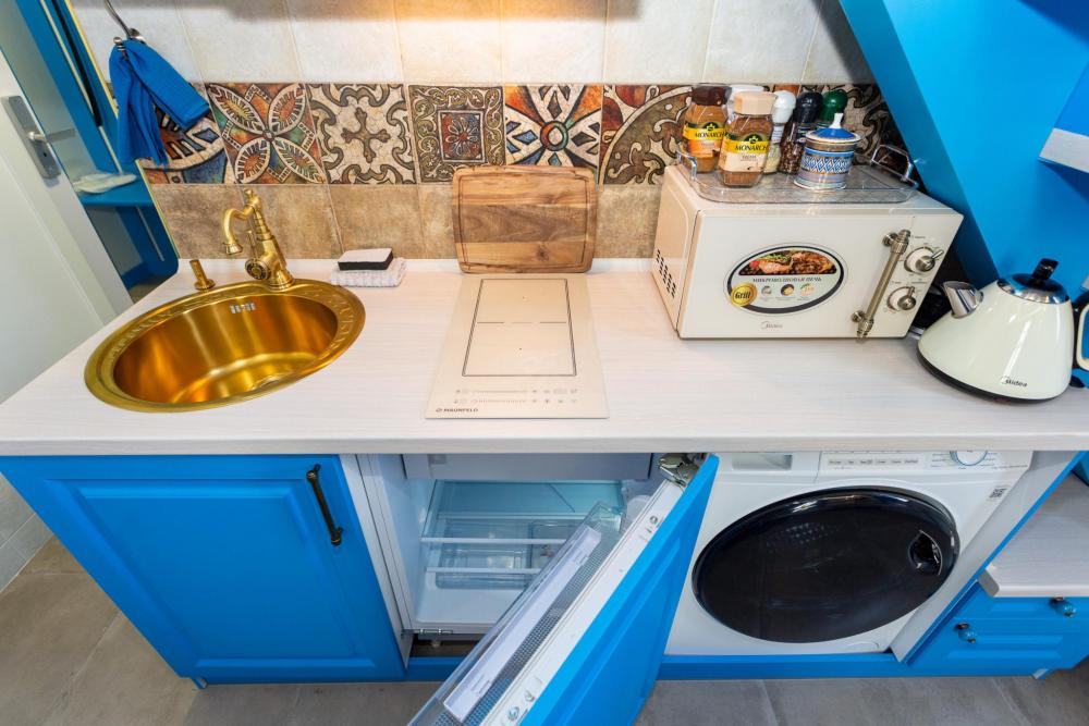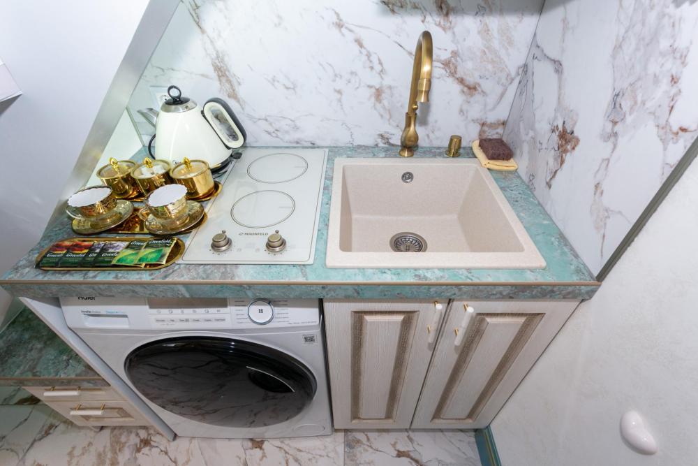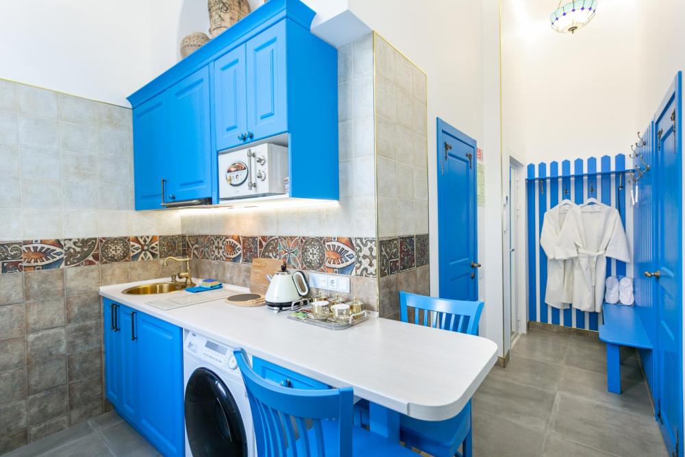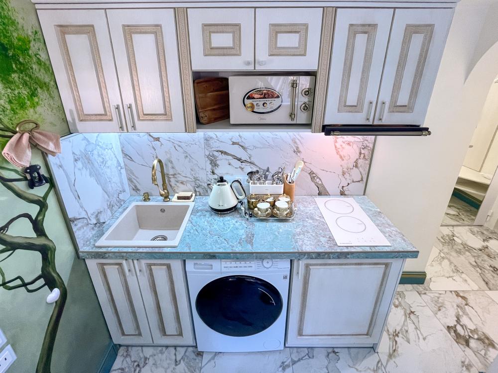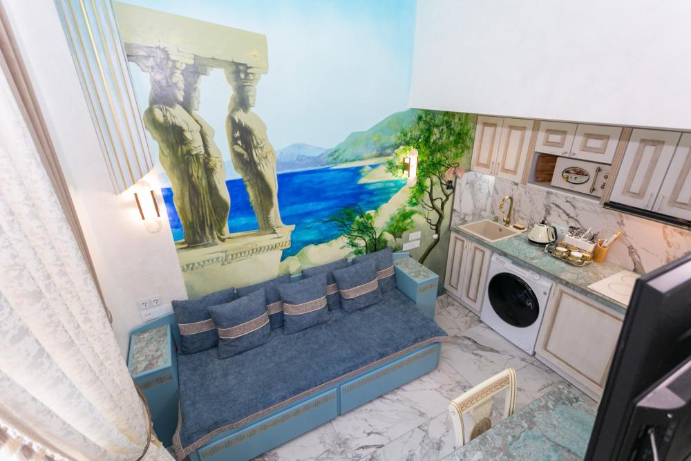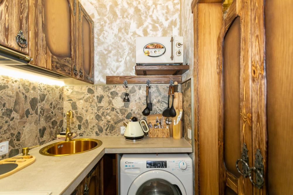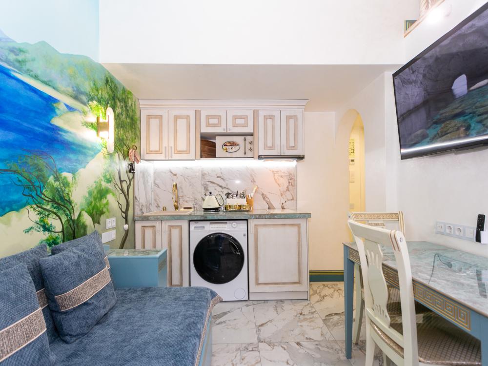 Номер оборудован комфортной мебелью, антикварными деталями и современными удобствами: кондиционер, телевизор, Wi-Fi,кухонная зона, стиральная машина, ванная комната.
