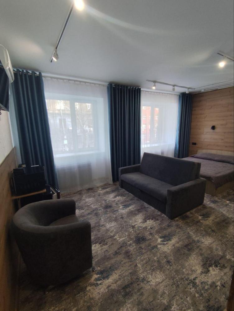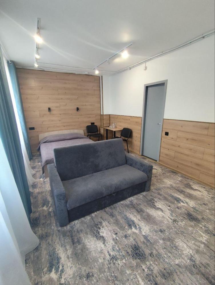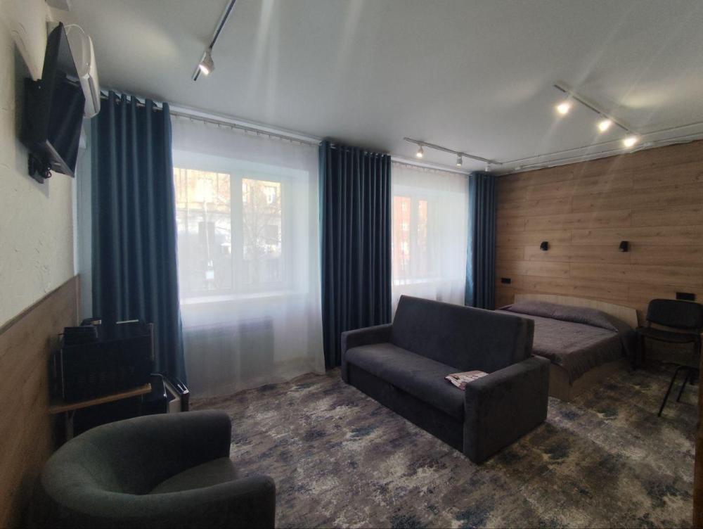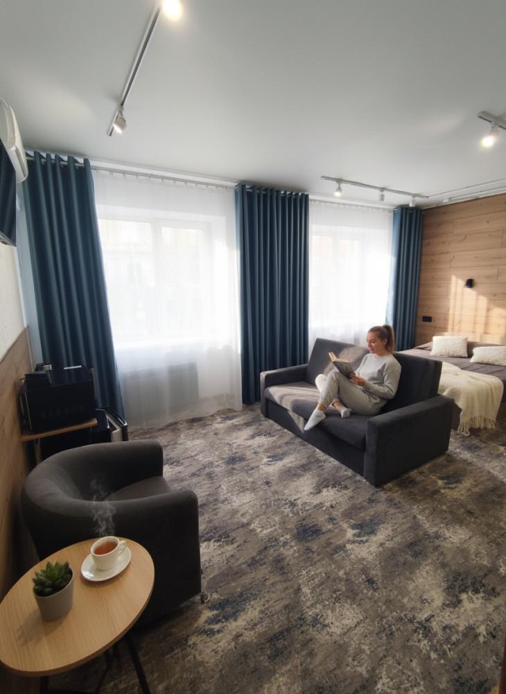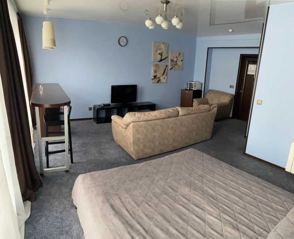 Номер студия представляет собой комнату с двуспальной кроватью, диваном и рабочим местом. В номере имеется: Двуспальная кровать (160*200), Диван, Кресло, Кондиционер, Холодильник, Чайник, Микроволновая печь, LCD телевизор с кабельным телевидением, Санузел, душ и гигиенические принадлежности, Фен, Комплект полотенец, Бесплатный Wi-Fi