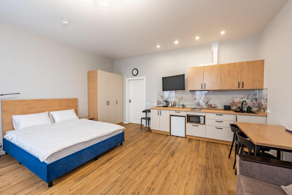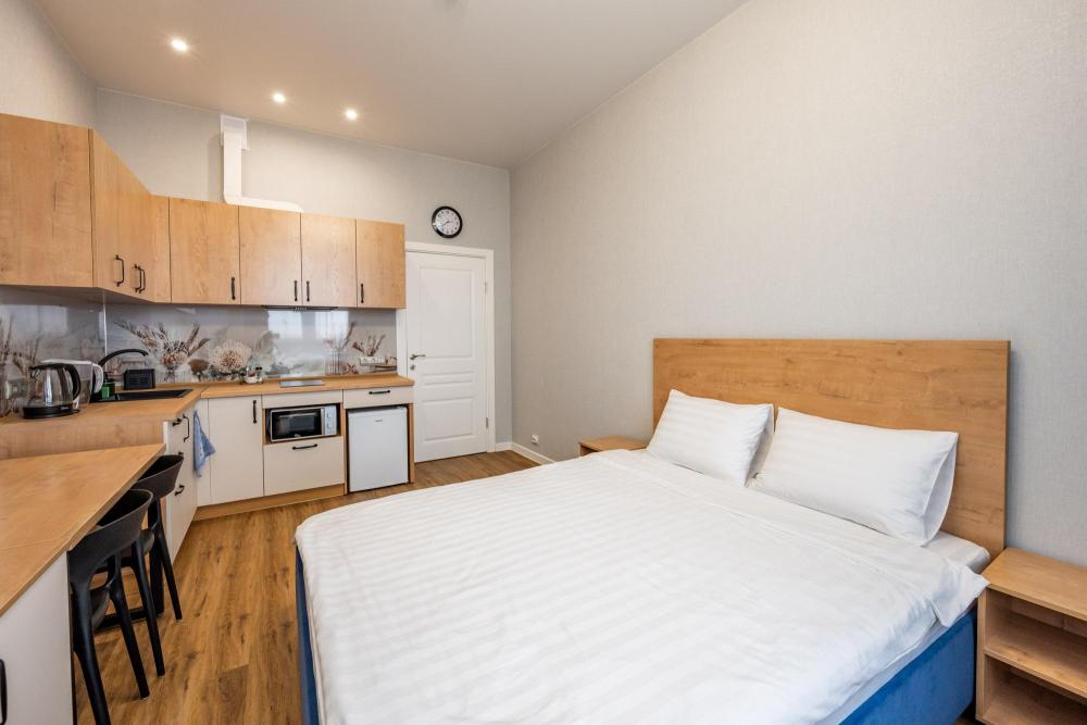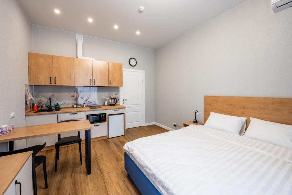 Комфортная квартира - студия с лоджией и двуспальной кроватью Белое постельное бельё, кухонная зона со всем необходимым. Предоставляем моющие средства для личной гигиены: зубной набор, шампунь, кондиционер для волос, жидкое мыло, шапочка для душа, тапочки, средство для стирки В квартире есть: — телевизор с функцией Smart TV, — кондиционер, — микроволновка, — варочная поверхность, — холодильник, — чайник, фильтр для воды, — фен, — полотенца, — посуда для приготовления и для сервировки стола, — утюг и гладильная доска. Есть Wi-Fi, пользование включено в стоимость. ВОЗМОЖНА ОПЛАТА ОТ ЮРИДИЧЕСКОГО ЛИЦА. №104