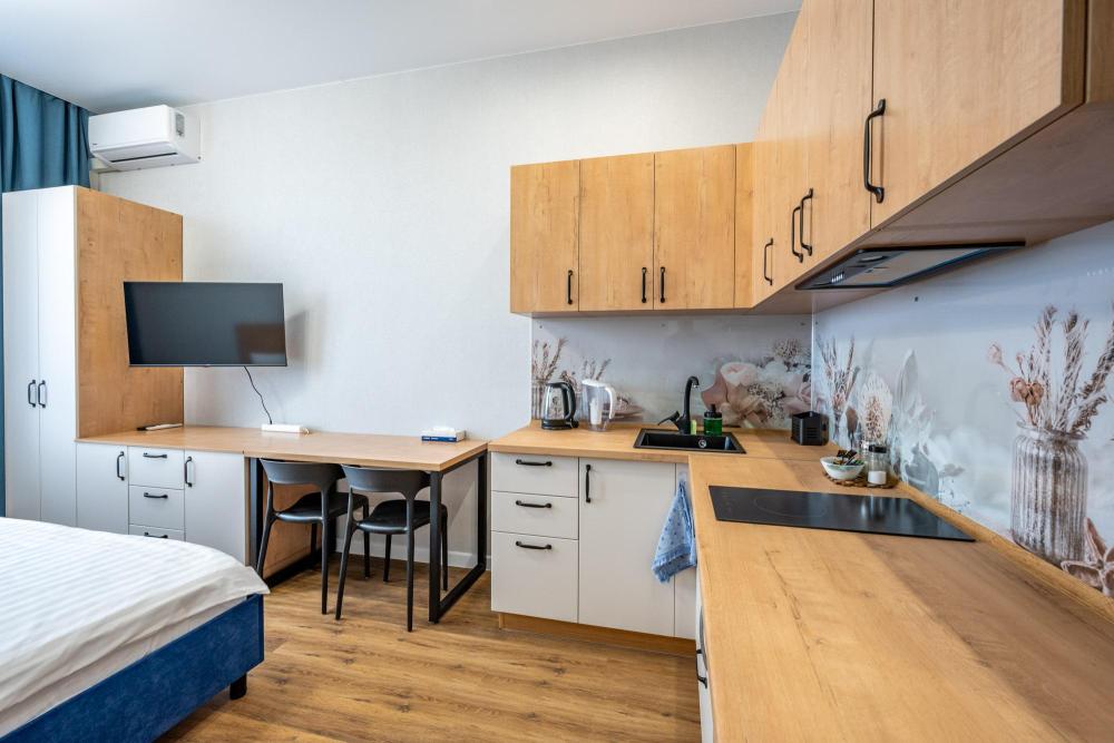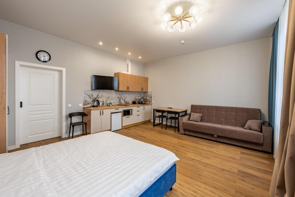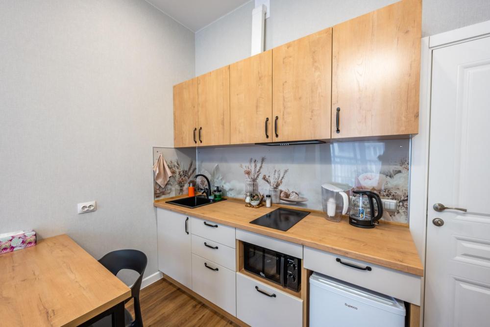 Уютная полноценная однокомнатная квартира (комната и кухня). Кровать в комнате, диван на кухне. На кухне полноценное рабочее место, с ящиками для хранения. Белое постельное бельё, кухонная зона со всем необходимым. Предоставляем моющие средства для личной гигиены: зубной набор, шампунь, кондиционер для волос, жидкое мыло, шапочка для душа, тапочки, средство для стирки. В квартире есть: телевизор с функцией Smart TV, кондиционер, микроволновка, варочная поверхность, холодильник, чайник, фильтр для воды, фен, полотенца, посуда для приготовления и для сервировки стола, утюг и гладильная доска. Wi-Fi включен в стоимость.