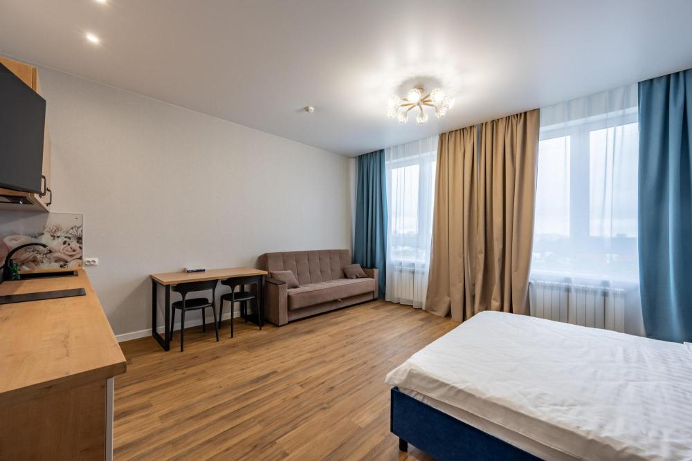 Уютная квартира - студия с двумя окнами. Белое постельное бельё, кухонная зона со всем необходимым. Удобная двуспальная кровать с ортопедическим матрасом и двуспальный диван. Предоставляем моющие средства для личной гигиены: зубной набор, шампунь, кондиционер для волос, жидкое мыло, шапочка для душа, тапочки, средство для стирки. В квартире есть: телевизор с функцией Smart TV, кондиционер, микроволновка, плита, холодильник, чайник, фильтр для воды, фен, полотенца, посуда для приготовления и для сервировки стола. Wi-Fi включен в стоимость.