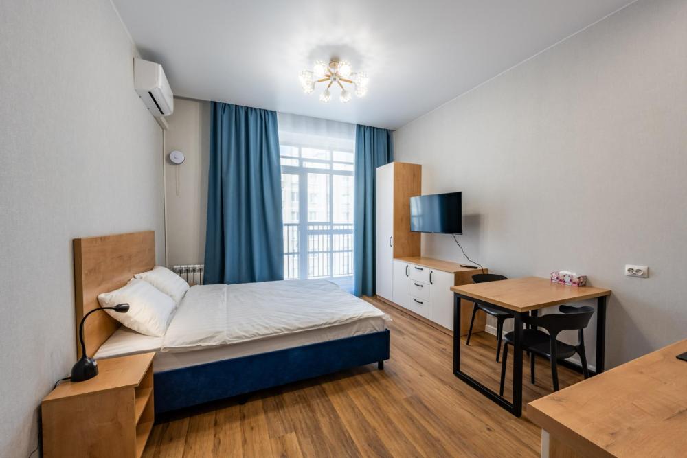 Уютная квартира - студия с балконом. Белое постельное бельё, кухонная зона со всем необходимым. Предоставляем моющие средства для личной гигиены: зубной набор, шампунь, кондиционер для волос, жидкое мыло, шапочка для душа, тапочки, средство для стирки. В квартире есть: телевизор с фукнцией Smart TV, кондиционер, микроволновка, плита, холодильник, чайник, фильтр для воды, фен, полотенца, посуда для приготовления и для сервировки стола. Интернет включен в стоимость.