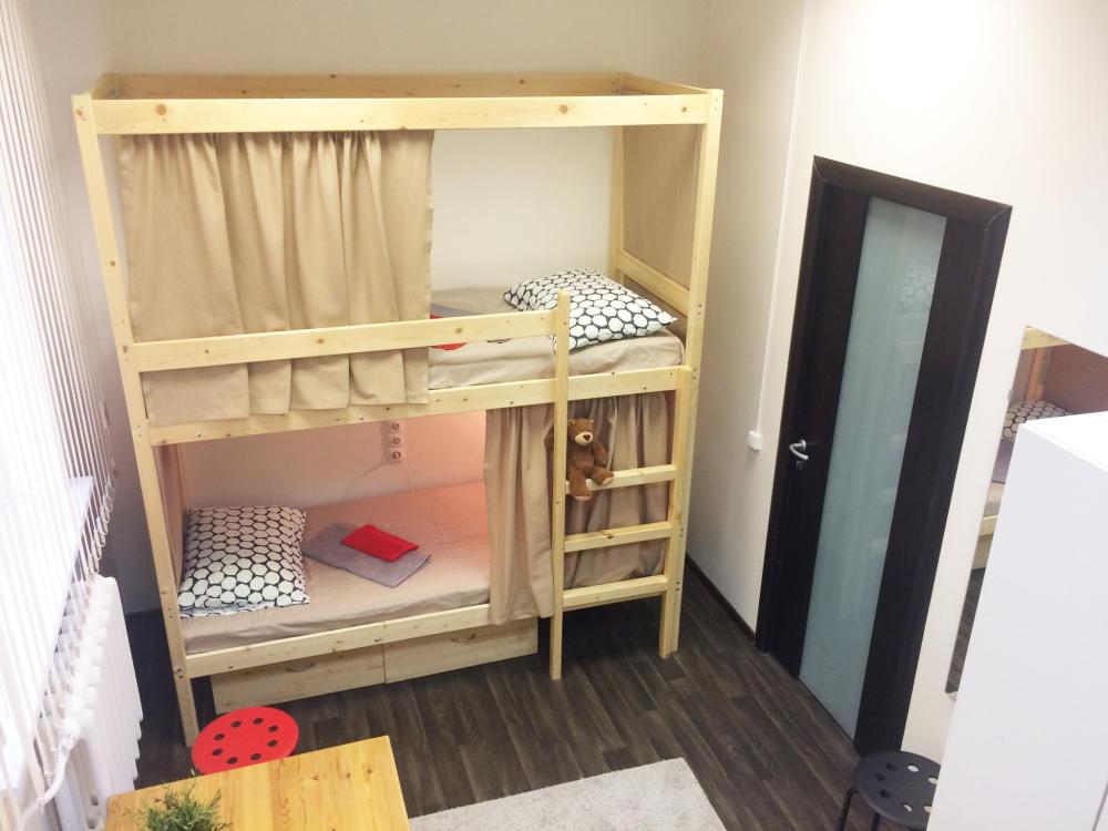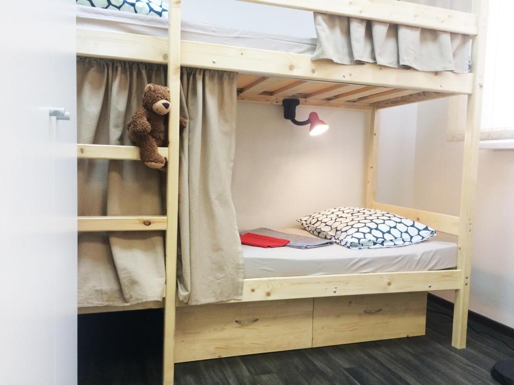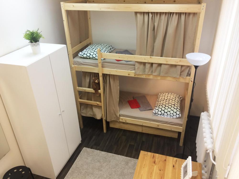 В этой комнате расположены две двухъярусные кровати (4 спальных места). Комната хостела оформлена в светлых, теплых тонах. Комната оснащена, у кровати есть персональный светильник, столом, стульями. Каждому гостю, предоставляется новое, красивое постельное белье и полотенца. Имеется бесплатный WI-FI.