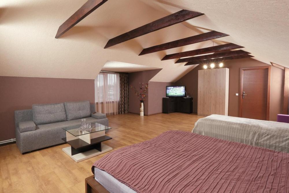 В номере имеется все необходимое для комфортного проживания : спальня с двухспальной и односпальной кроватью, шкаф, диван, телевизор, холодильник, чайник, ванная комната и туалет, кондиционер