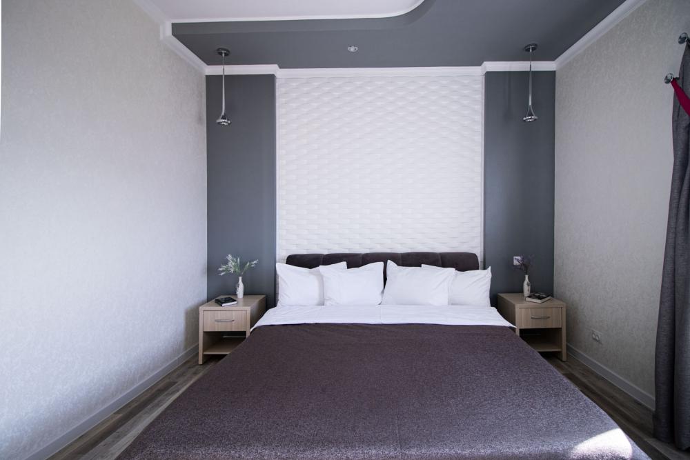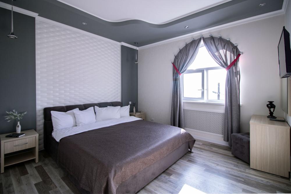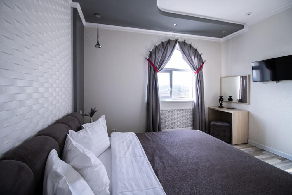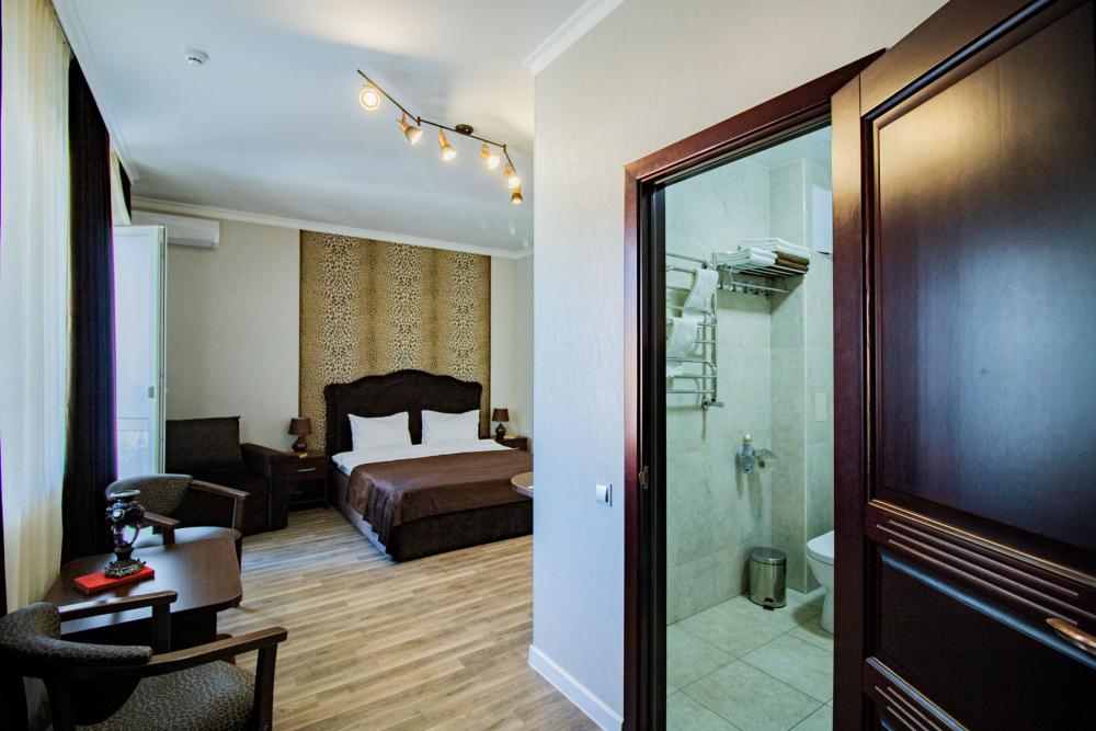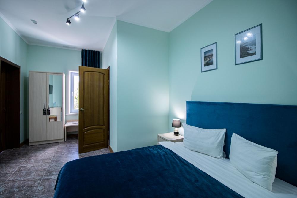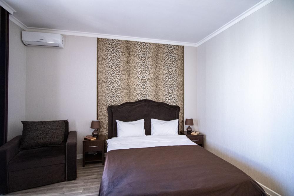 Двухместная комната с двуспальной кроватью. Комната оснащена телевизором, местом для хранения одежды, кондиционером, ванной комнатой, предоставляются туалетно-косметические принадлежности.