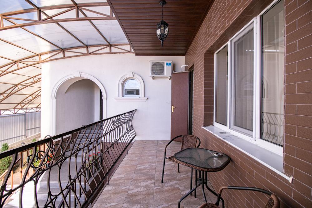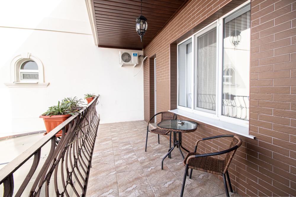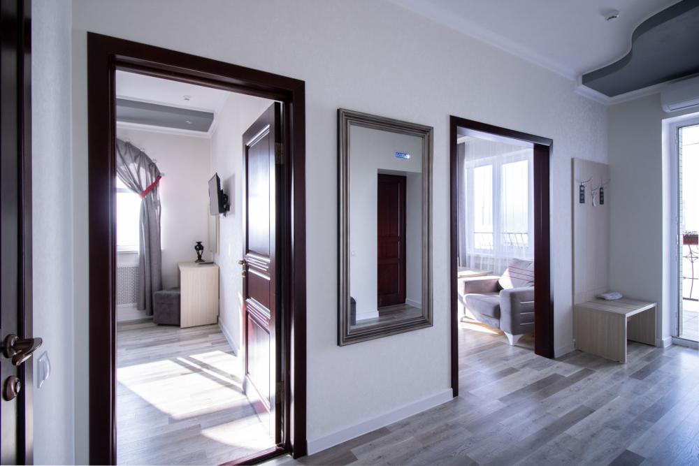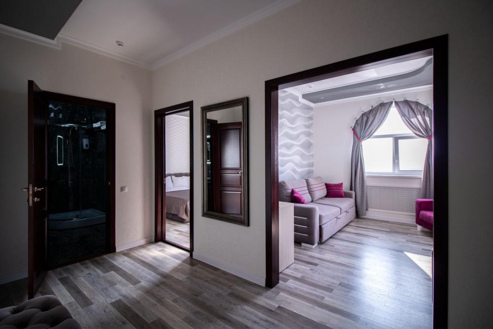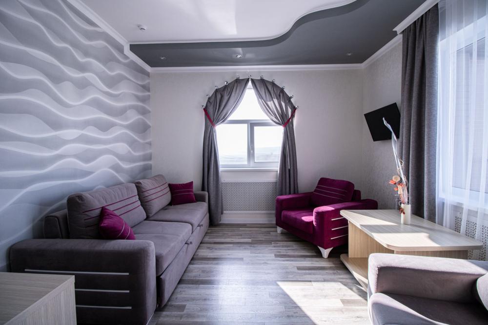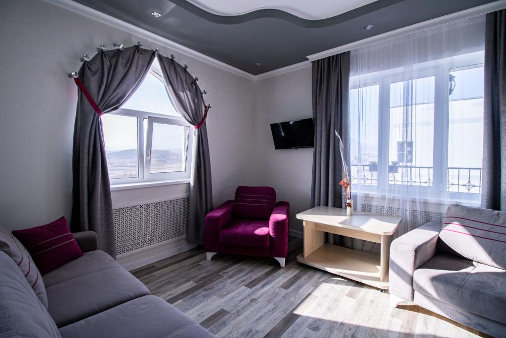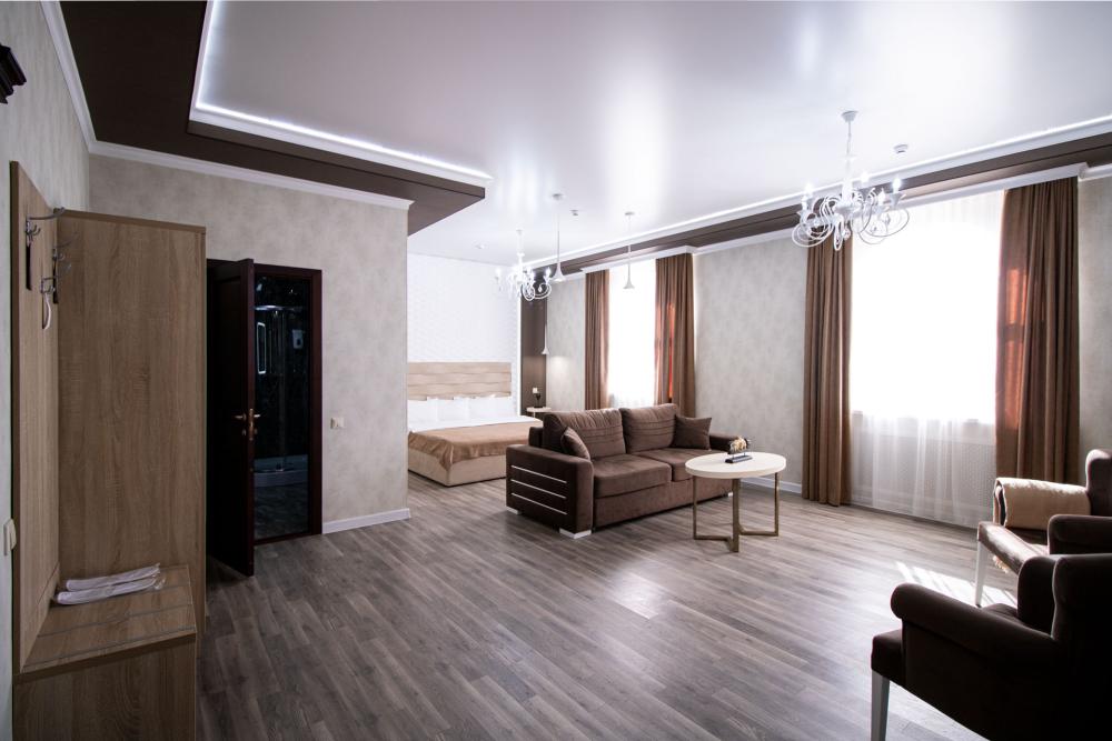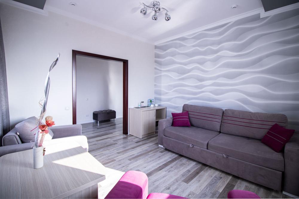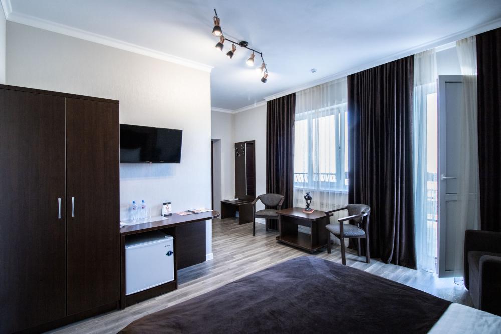 Двухкомнатная комната с двуспальной кроватью и диваном. Комната оснащена балконом, телевизором, местом для хранения одежды, кондиционером, ванной комнатой, предоставляются туалетно-косметические принадлежности.