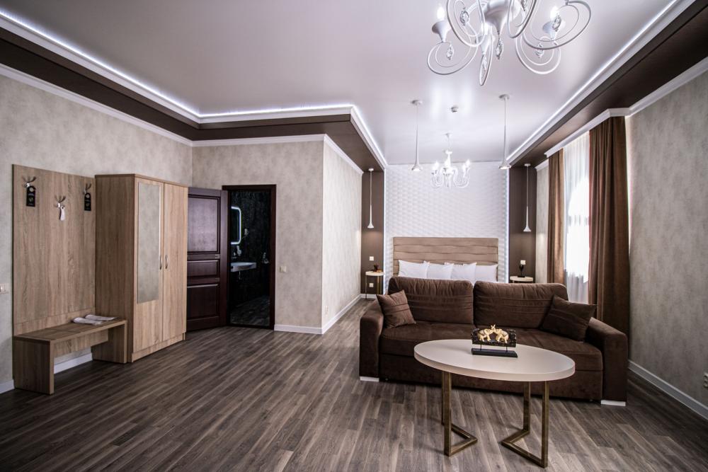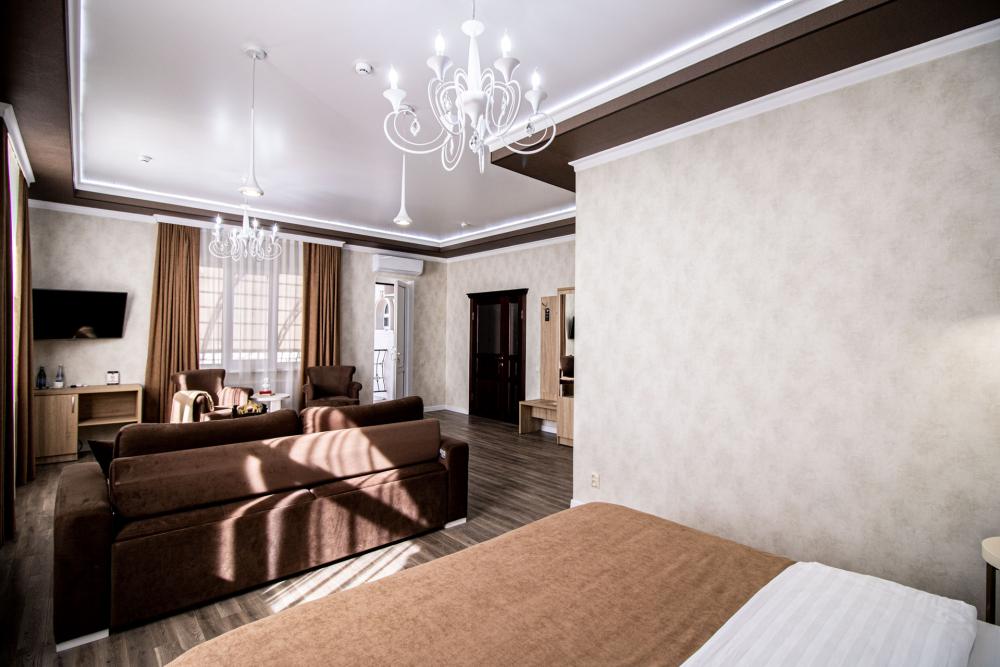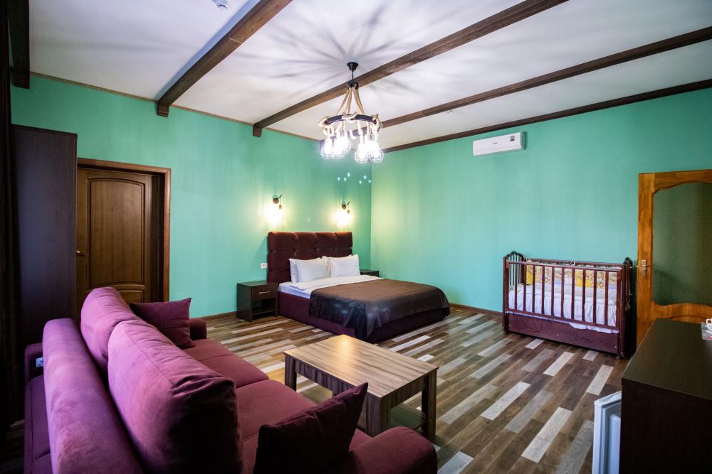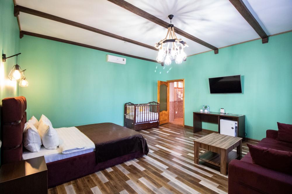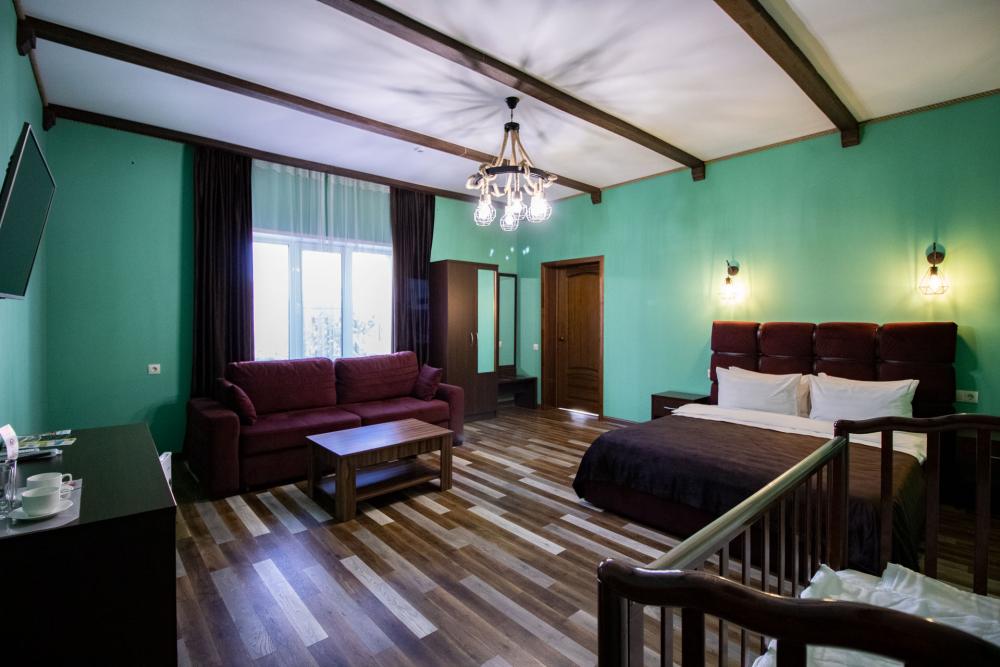 Комната с двуспальной кроватью и диваном. Комната оснащена телевизором, местом для хранения одежды, кондиционером, ванной комнатой, предоставляются туалетно-косметические принадлежности.