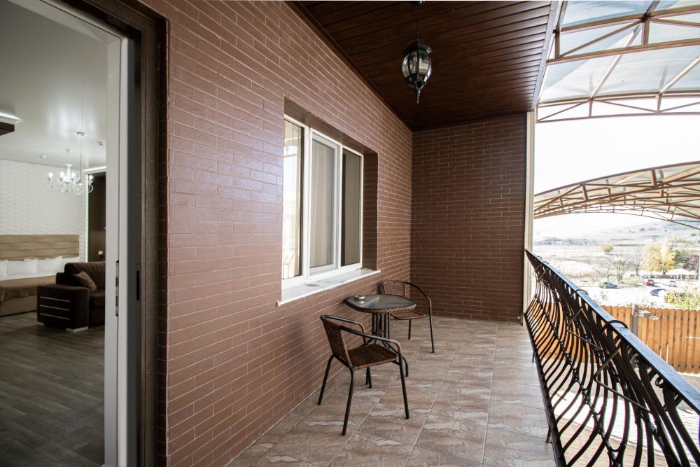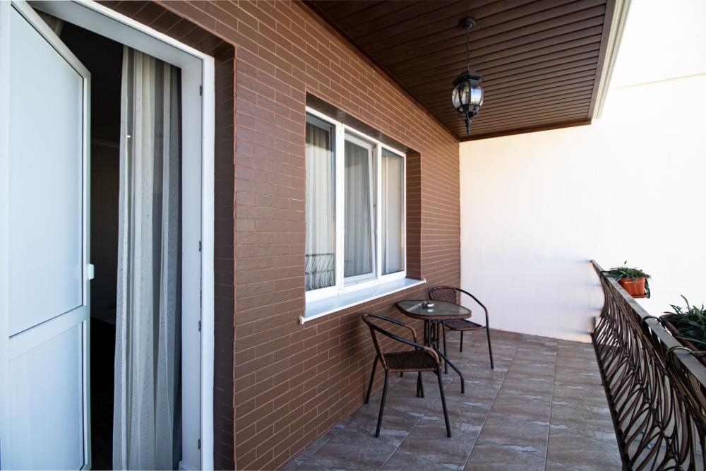 Комната с двуспальной кроватью и диваном. Комната оснащена балконом, телевизором, местом для хранения одежды, кондиционером, ванной комнатой, предоставляются туалетно-косметические принадлежности.