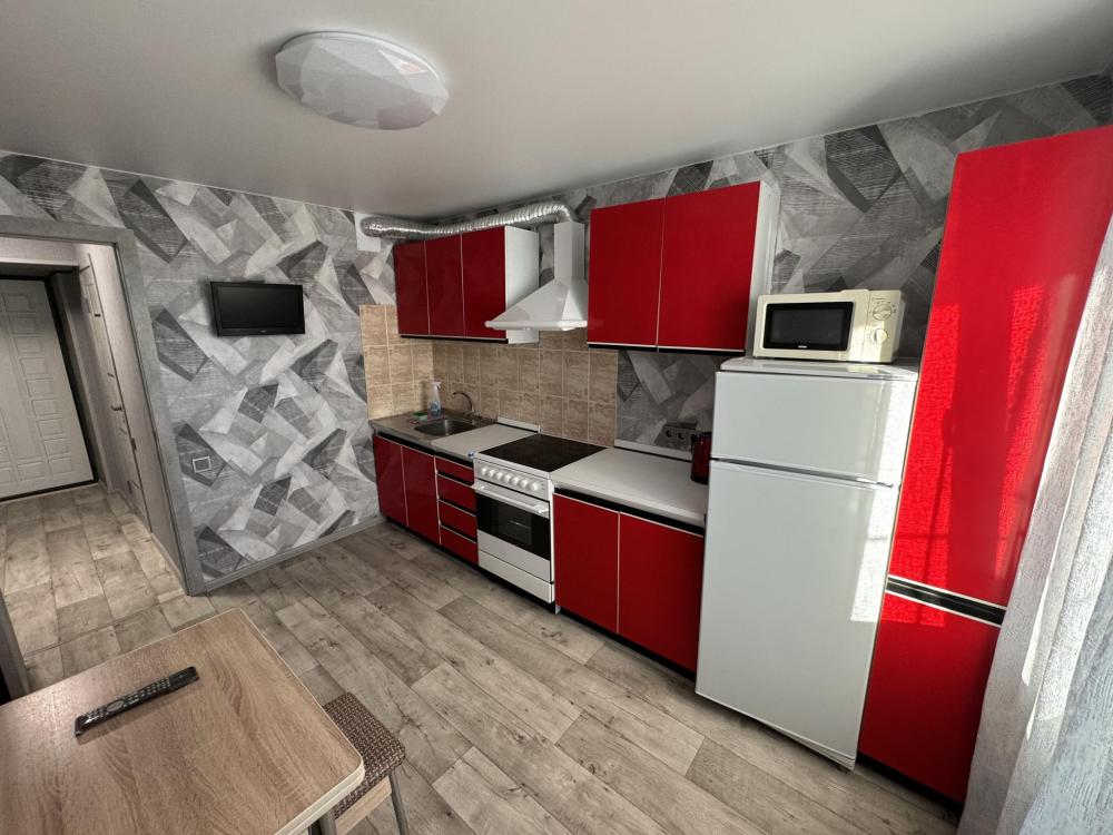 Полностью оборудованная кухня (плита, холодильник, микроволновка, чайник, посуда).