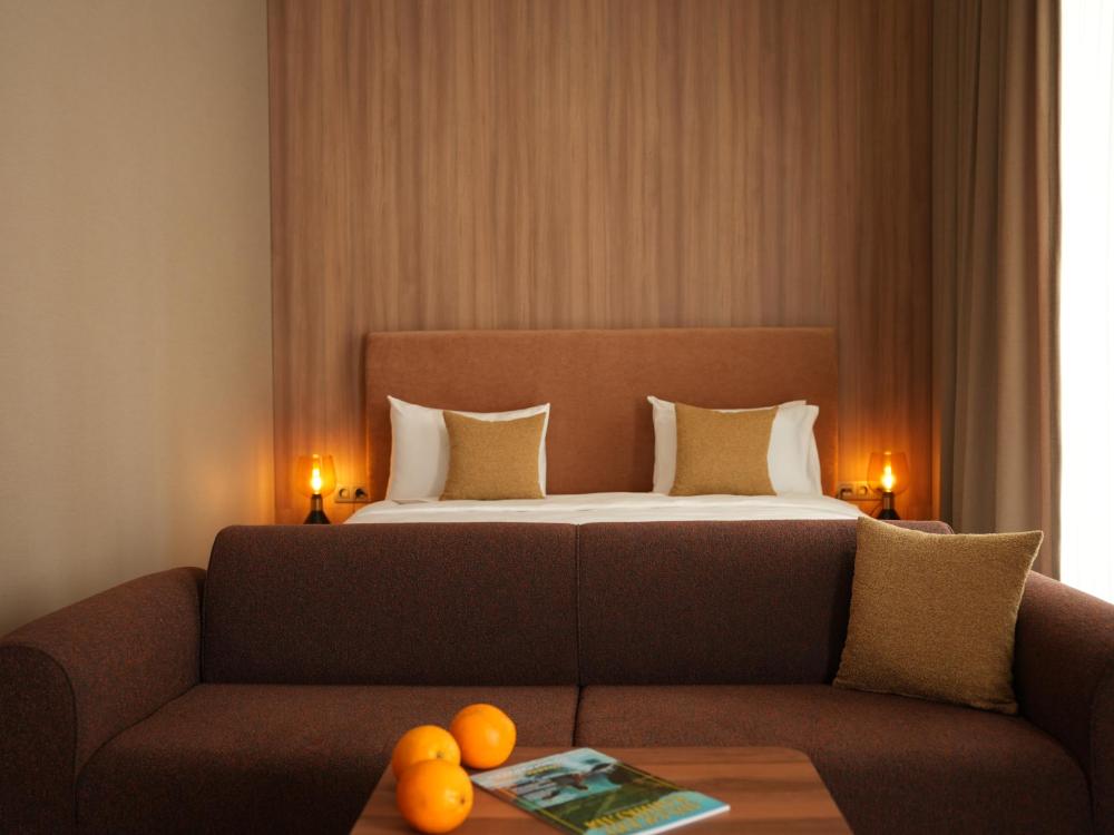 Компактный светлый номер с двуспальной кроватью, в котором царит необыкновенно душевная атмосфера. В ванной комнате — душевая кабина. Вид с балкона открывается на парковую зону и на горы.