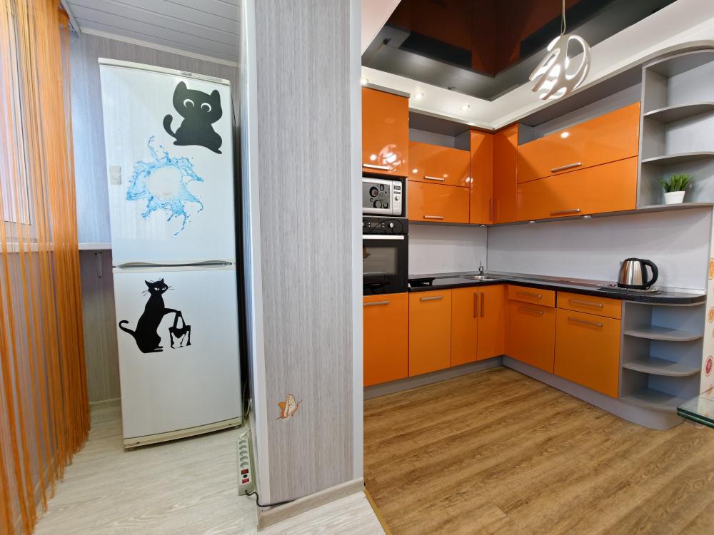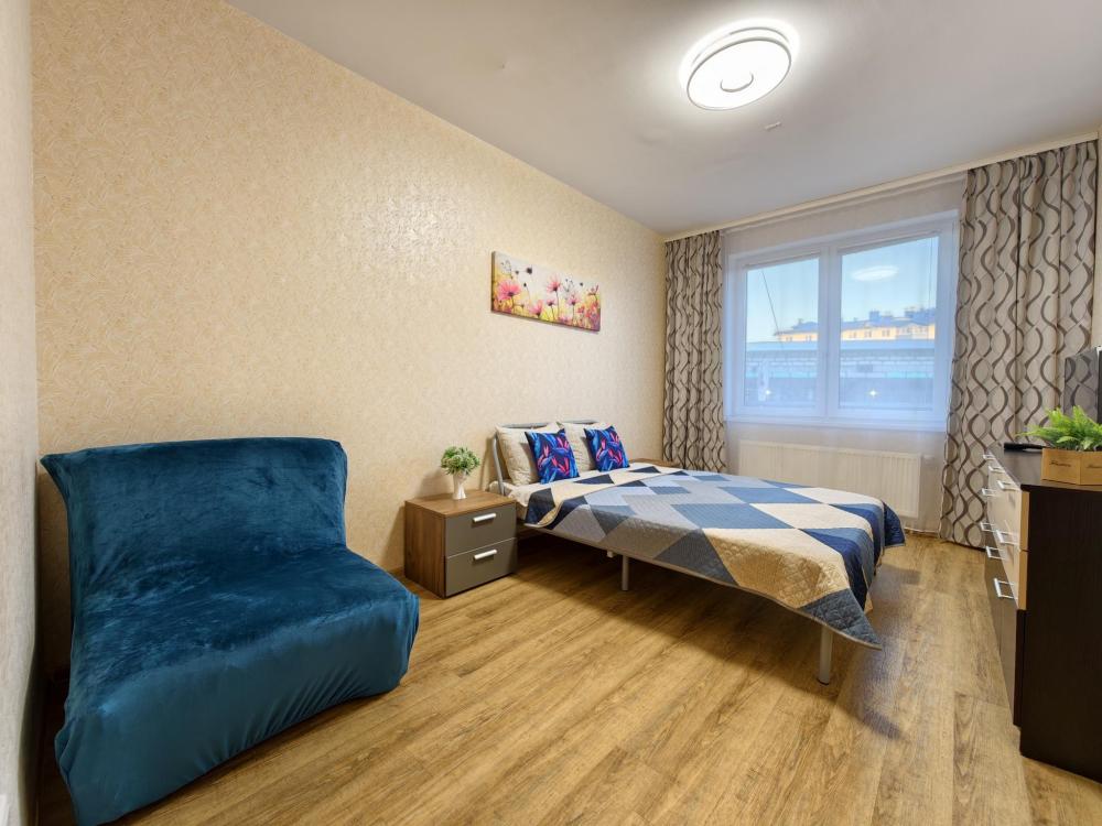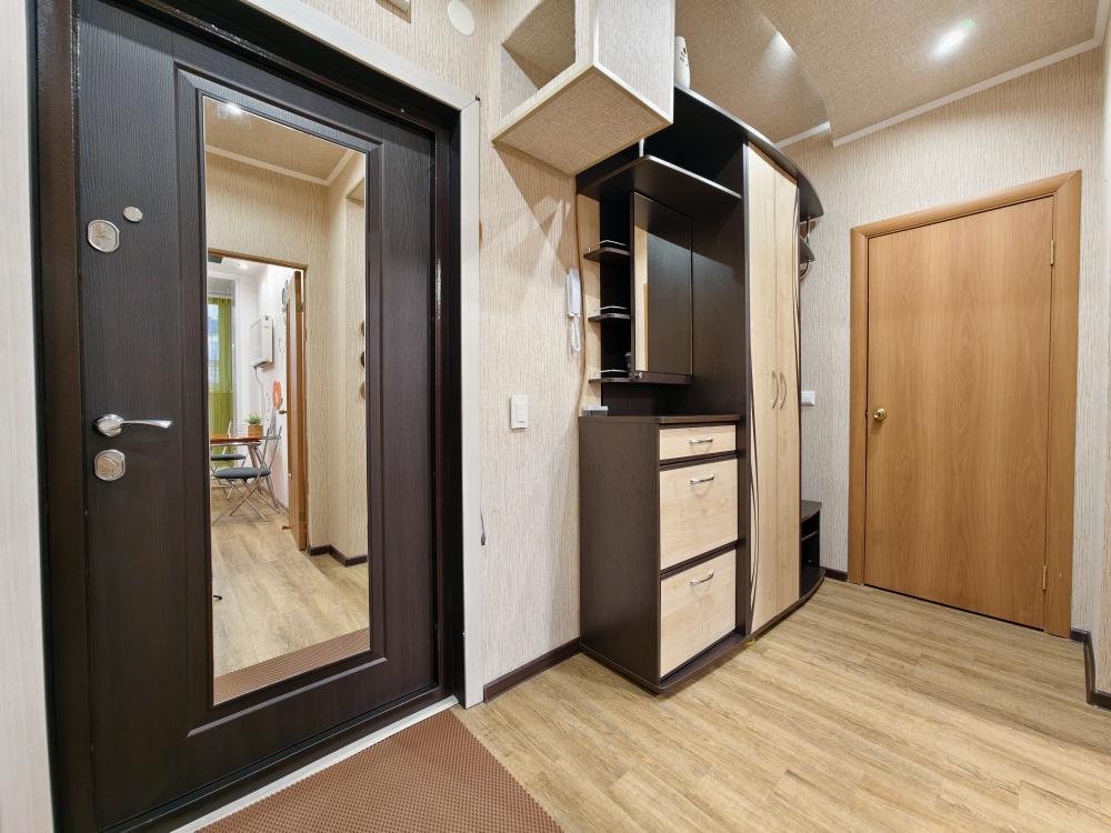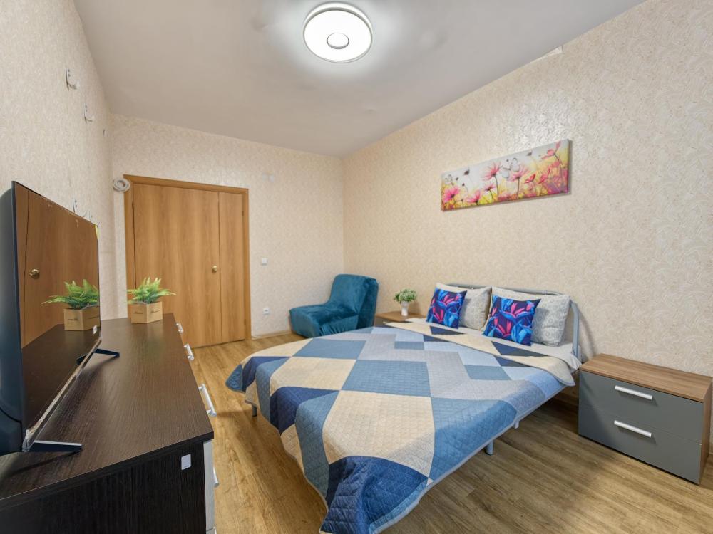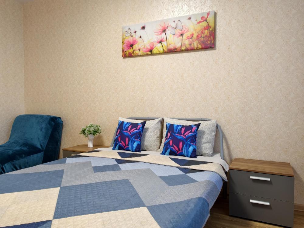 Главное преимущество квартиры — удобное спальное место. В спальне установлена большая двуспальная кровать с ортопедическим матрасом высокой комфортности, свежим постельным бельем и мягкими подушками. Кухня оборудована всем необходимым: холодильником, плитой, микроволновой печью, чайником, набором посуды и столовыми приборами. В ванной комнате — современная сантехника, стиральная машина, фен и чистые полотенца.