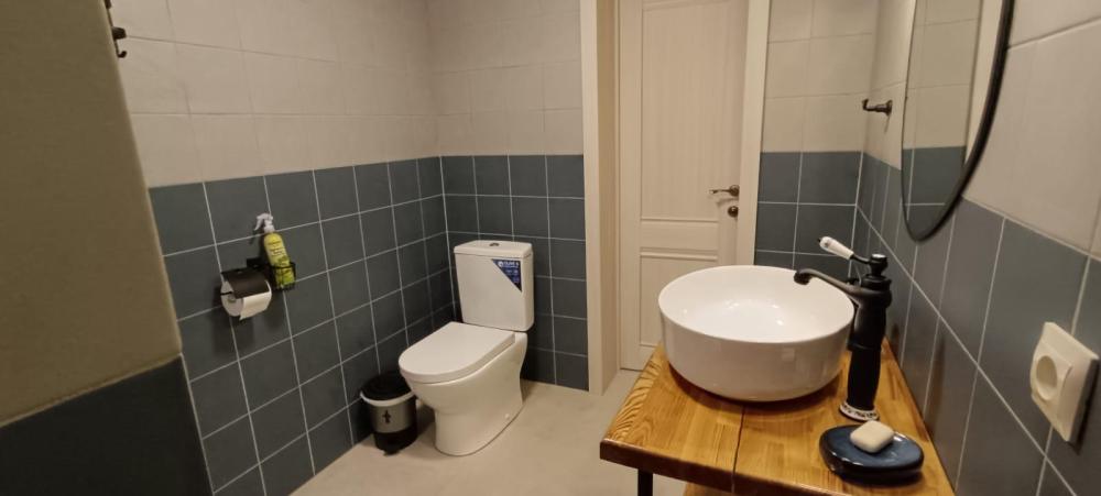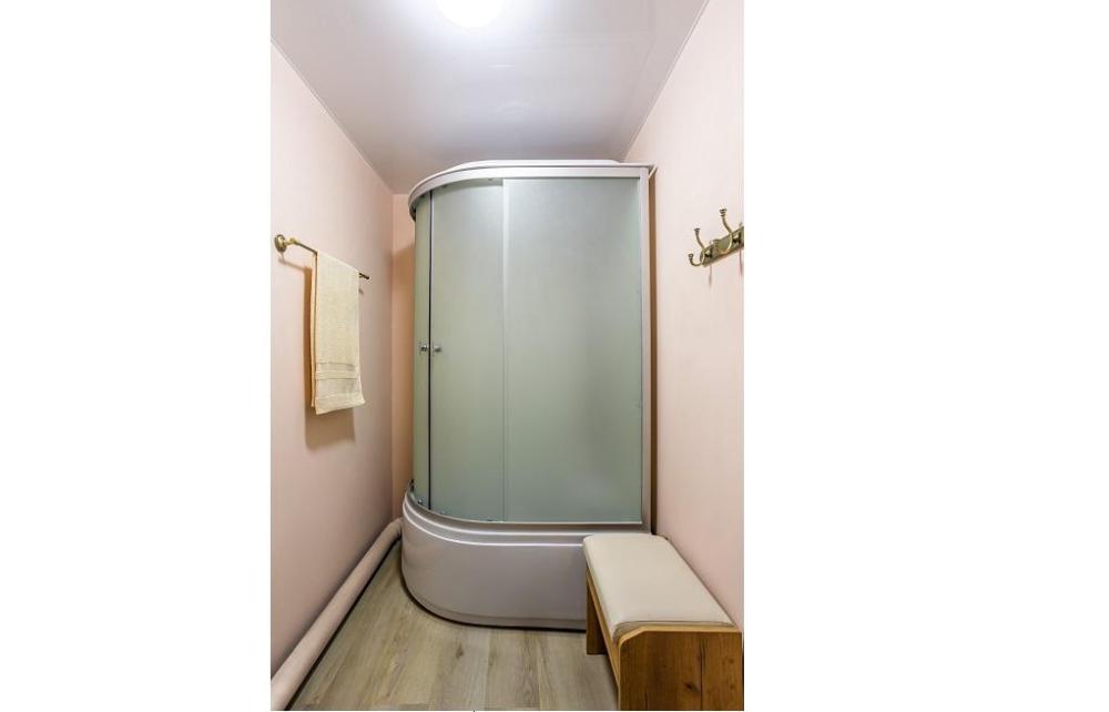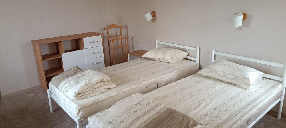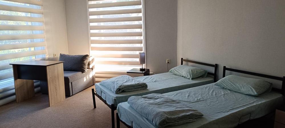 Уютная комната на 2 этаже с окном и выходом на отдельную застекленную веранду, с которой открывается вид на лес и внутренний двор гостевого дома. В комнате две односпальных кровати, которые по желанию клиентов трансформируются в двуспальную. Также в комнате есть кресло-кровать, небольшой письменный стол и телевизор. Туалетная и душевая комнаты - на две комнаты Северную и Южную. Гости Северной и Южной комнат пользуются просторной гостиной-кухней, на которой есть холодильник, две настольных индукционных плиты, СВЧ-печь, электрическая духовка, вся необходимая столовая и кухонная посуда.
