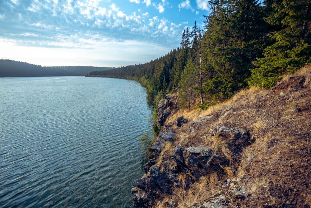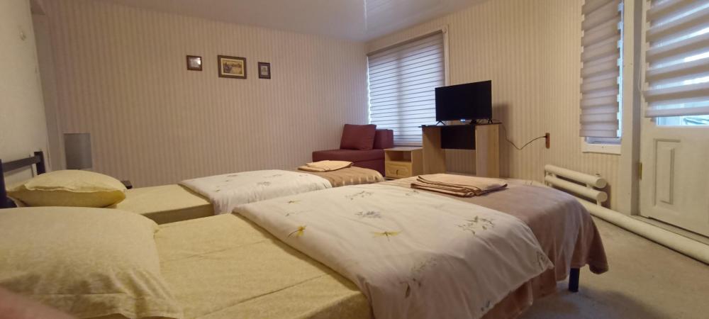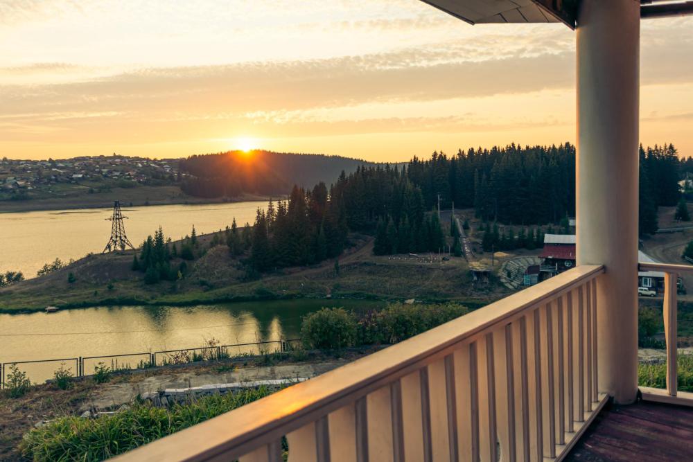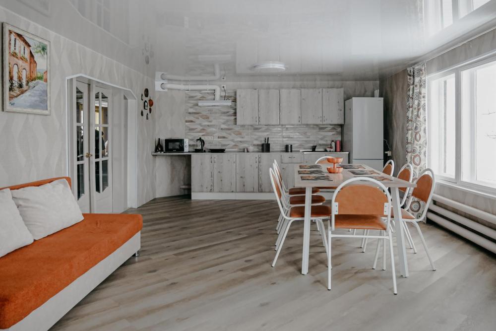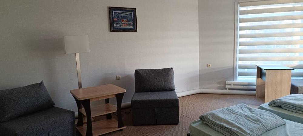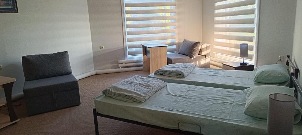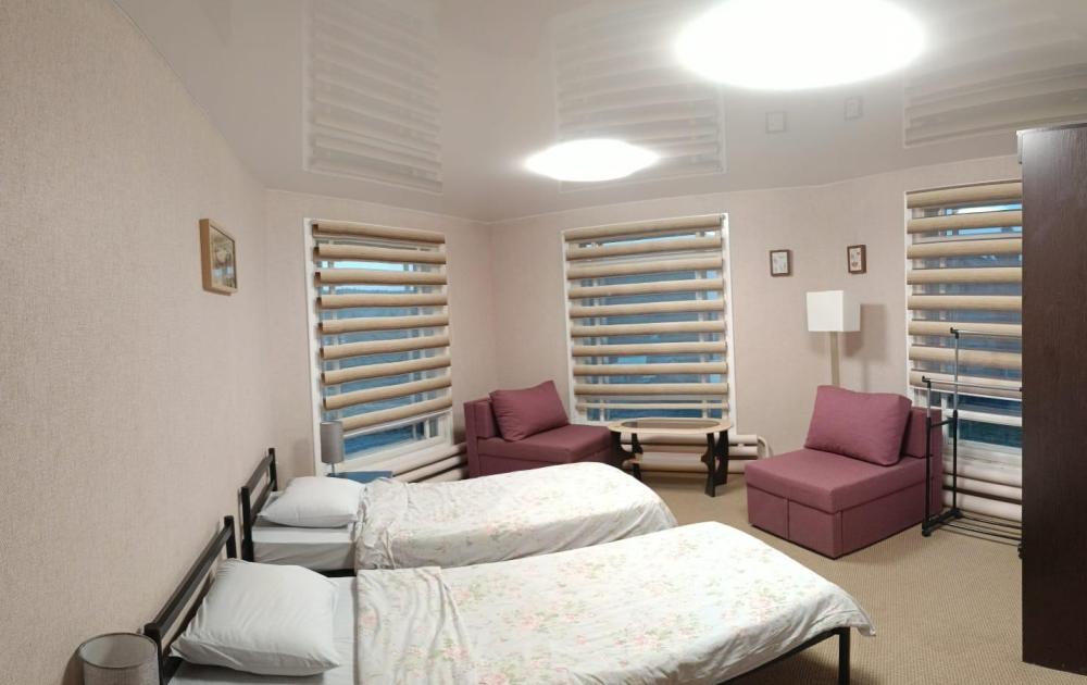 Просторная комната на первом этаже с двумя большими окнами, из которых открывается вид на озеро и город на противоположном берегу. В комнате две односпальных кровати, которые по желанию клиентов трансформируются в двуспальную. Также в комнате три кресла-кровати, торшер и журнальный столик. В комнате есть санузел авторского дизайна с душем. Гости, проживающие в этой комнате, пользуются гостиной-кухней совместно с гостями, проживающими в Розовой комнате. В гостиной есть холодильник, две настольных индукционных плиты, СВЧ-печь, электрическая духовка, вся необходимая столовая и кухонная посуда. Из гостиной есть выход на территорию гостевого дома через открытую веранду с великолепным видом на озеро, лес и живописные склоны противоположного берега, а также на трамплин.