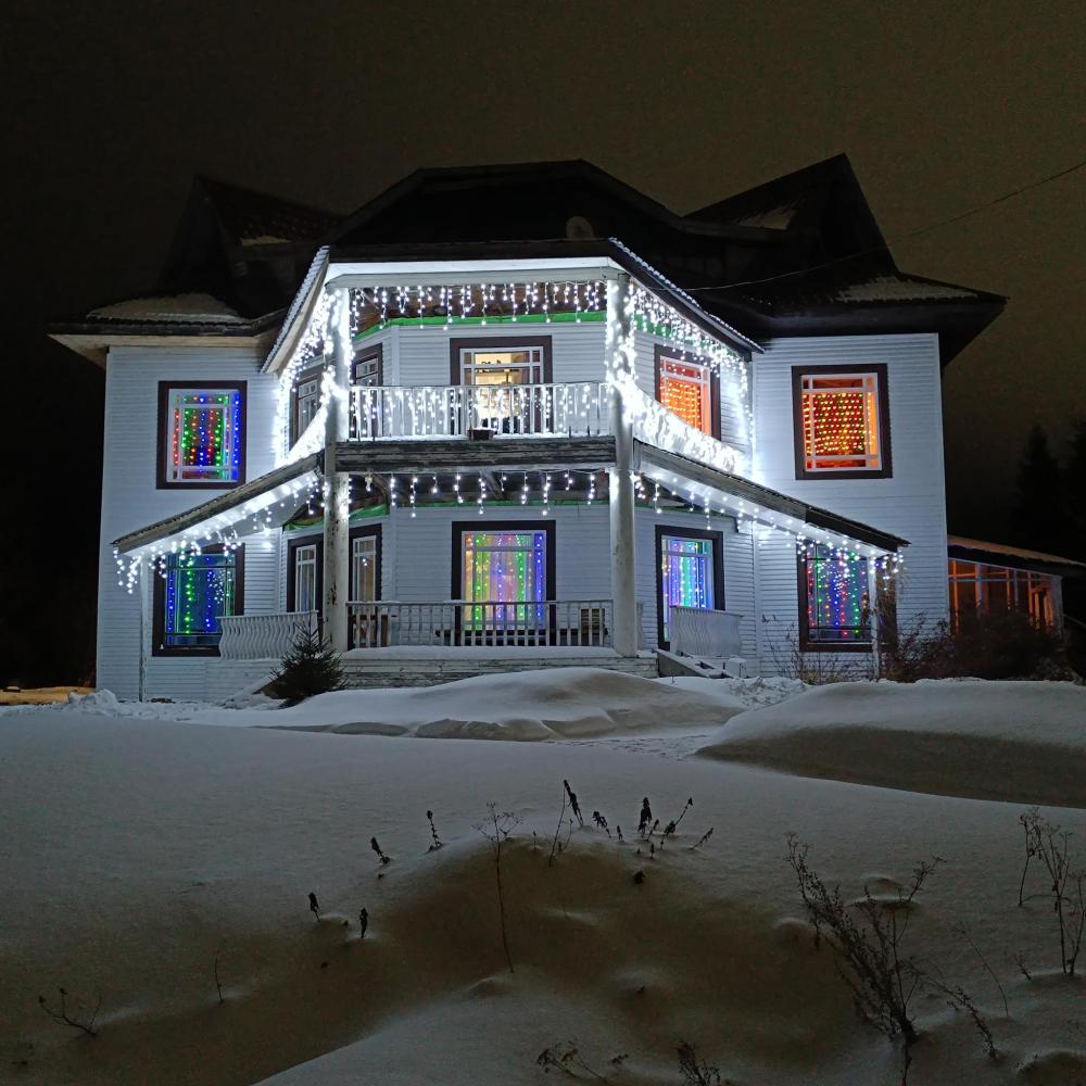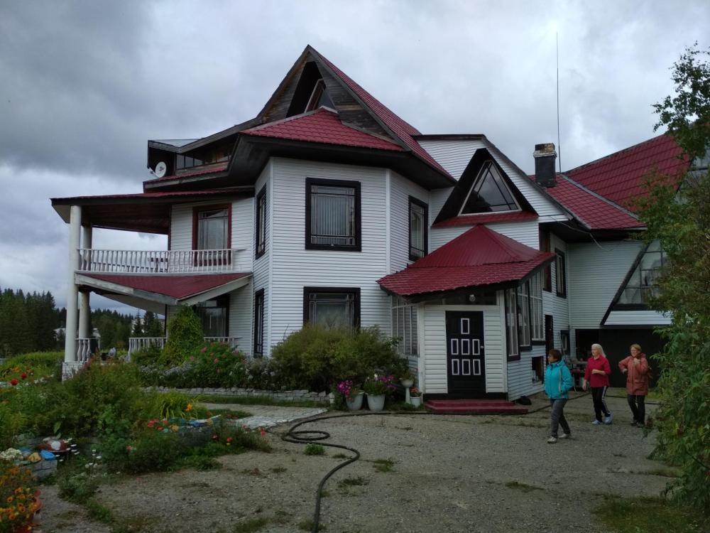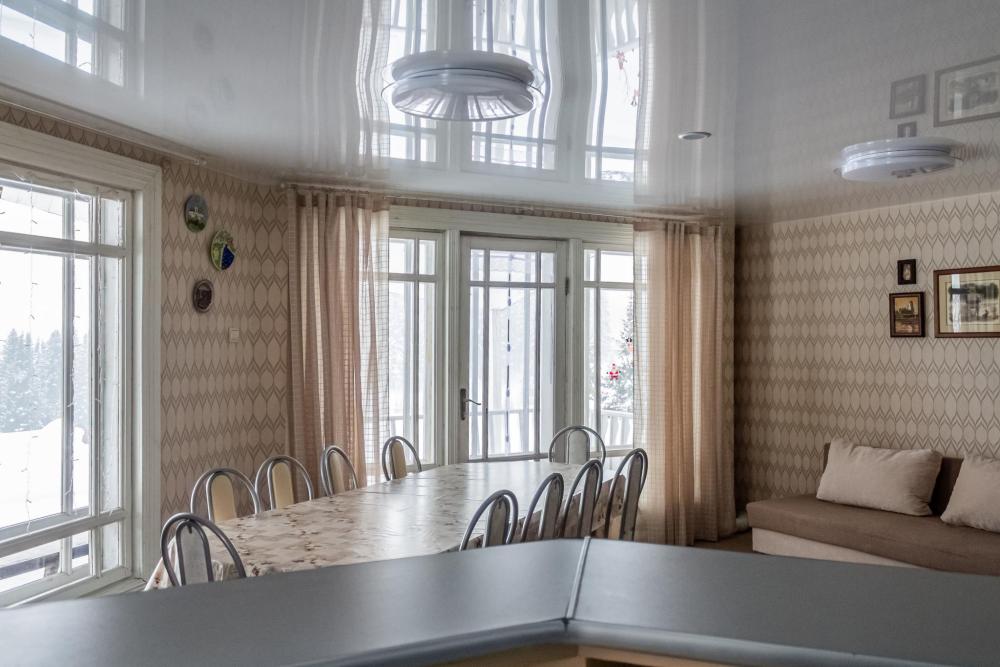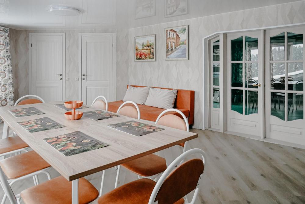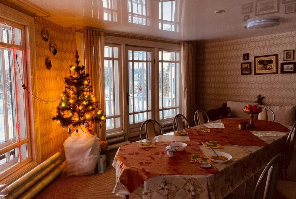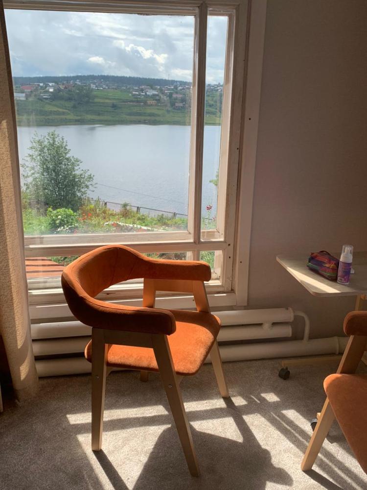 Уютная комната на первом этаже с тремя большими окнами, из которых открывается вид на реку, лес и трамплин. В комнате две односпальных кровати, которые по желанию клиентов трансформируются в двуспальную. Также в номере два кресла-кровати, торшер и журнальный столик. В комнате есть санузел авторского дизайна с душем. Гости, проживающие в этой комнате, пользуются гостиной-кухней совместно с гостями, проживающими в Голубой комнате. В гостиной есть холодильник, две настольных индукционных плиты, СВЧ-печь, электрическая духовка, вся необходимая столовая и кухонная посуда. Из гостиной есть выход на территорию гостевого дома через открытую веранду с великолепным видом на озеро, лес и живописные склоны противоположного берега, а также на трамплин.