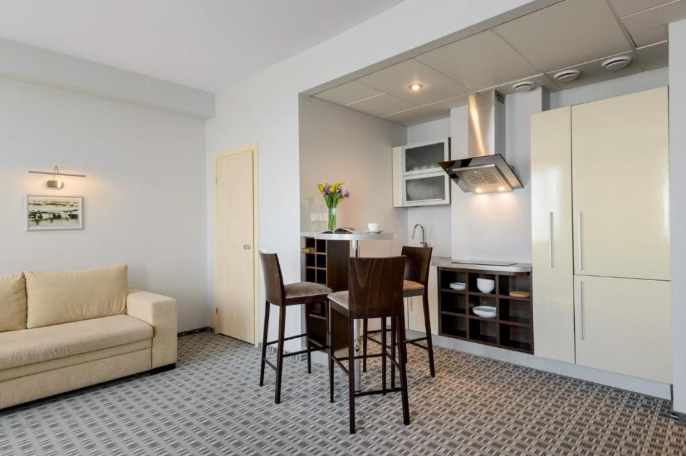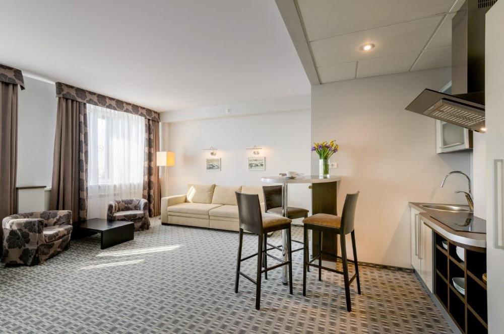 Двухкомнатный номер: спальня, гостиная с диванной зоной, рабочим местом и кухонной зоной. Два санузла. Двуспальная кровать размером 180*200мм. Проживание с животными запрещено.