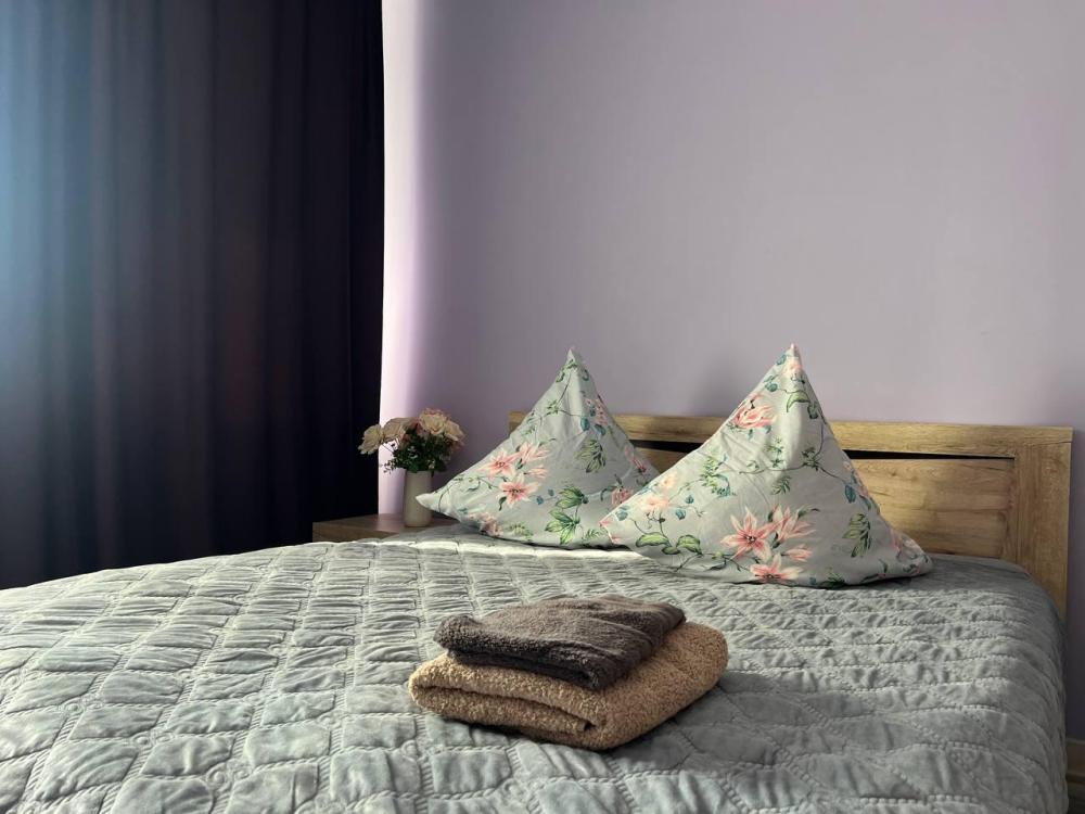 Однокомнатная квартира возле Аэропорта. Квартира светлая, уютная. Есть все необходимое для комфортного проживания: удобная двуспальная кровать с новым матрасом, свежее постельное белье, полотенца, фен, туалетные принадлежности, барный холодильник, плита, посуда для...